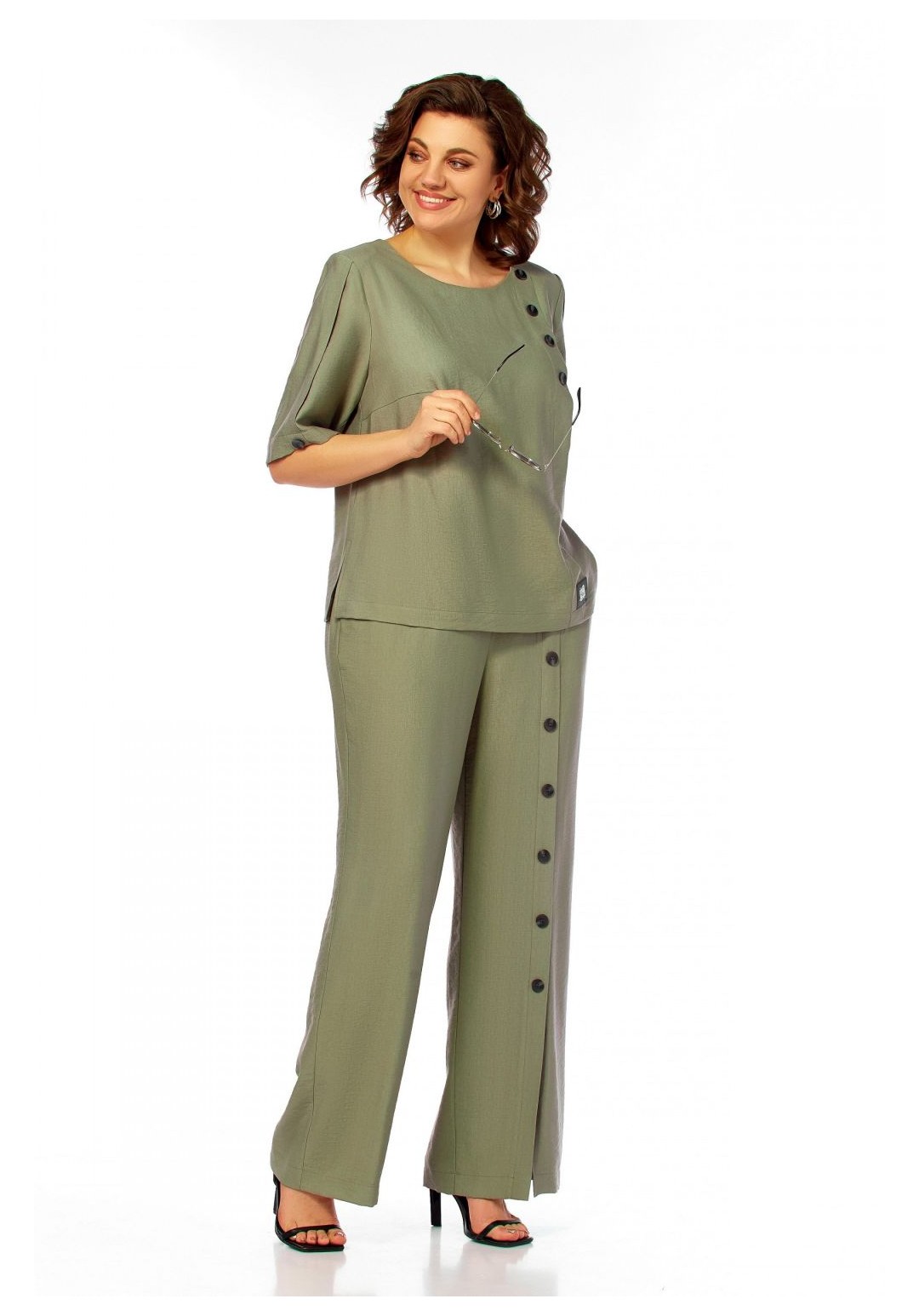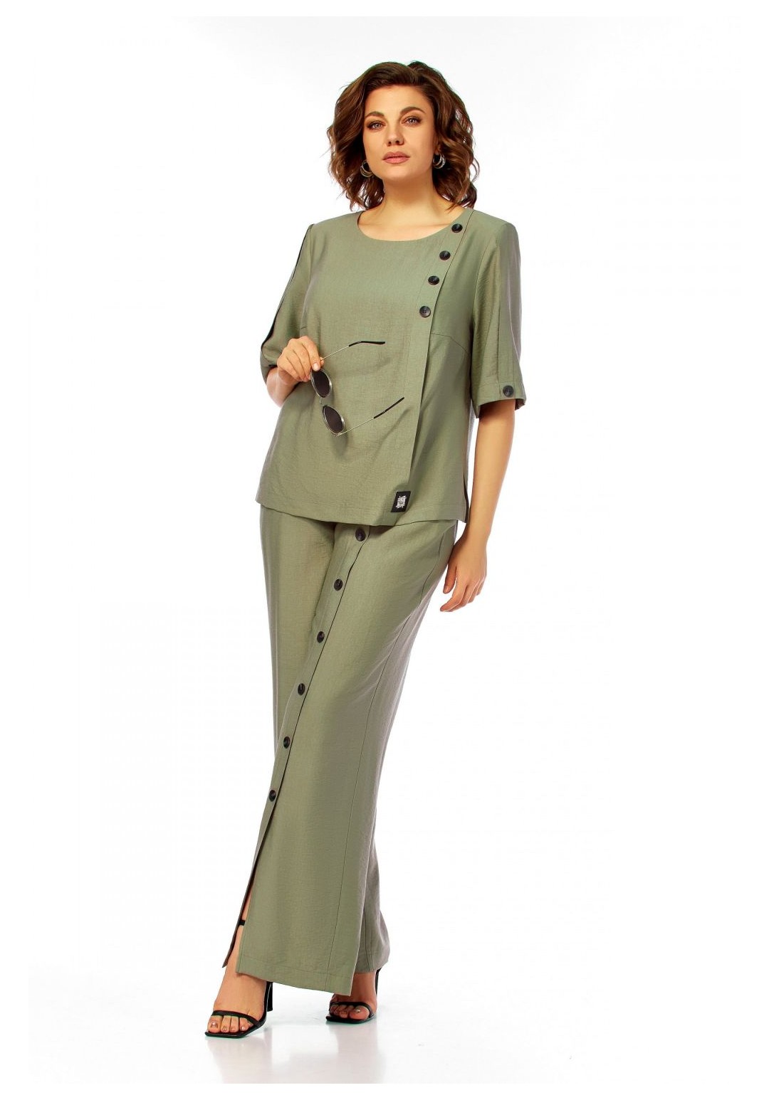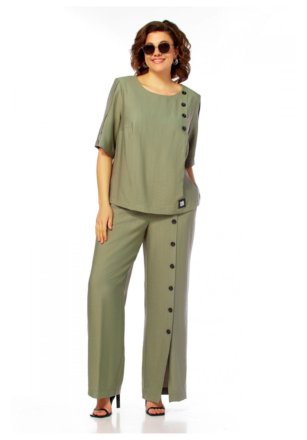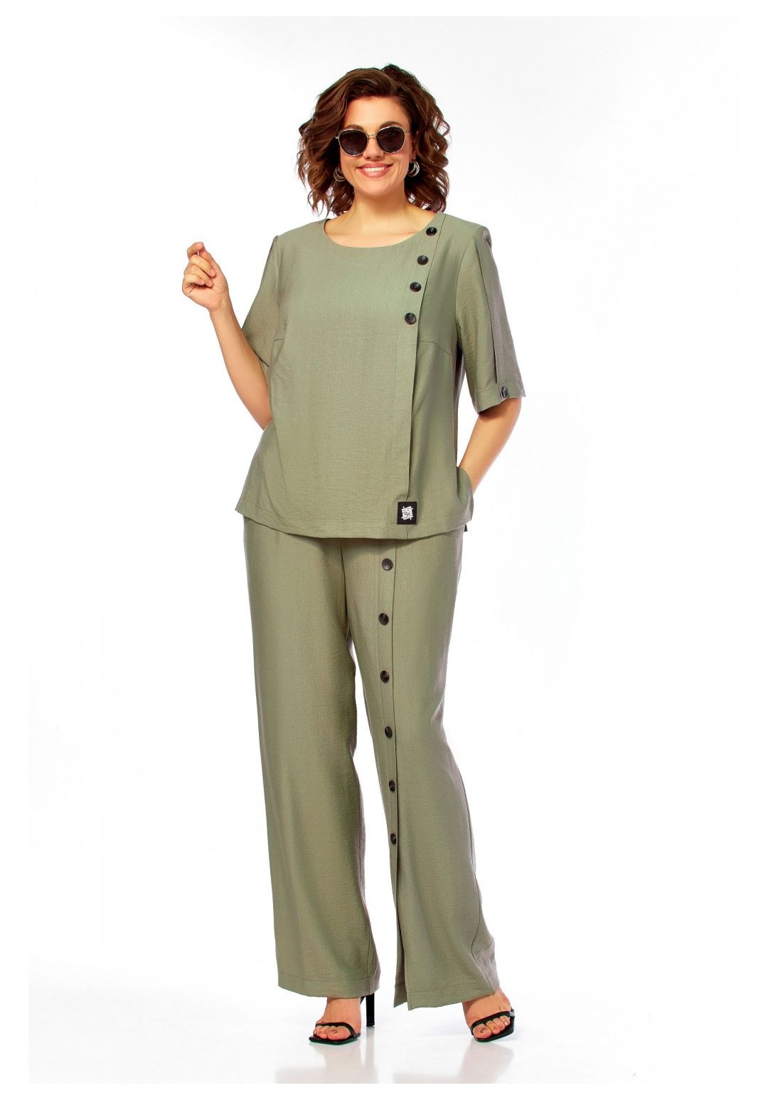 Интересный легкий костюм, состоит из блузы и брюк. Блуза полуприлегающего силуэта, с округлым вырезом горловины. Нагрудные вытачки, слева заложена декоративная складка с пришитыми пуговицами и отделочной нашивкой. Спинка со средним швом и застежкой на петлю и пуговицу. Разрезы в боковых швах. Рукав короткий, по центру со складкой и пуговицей. Брюки прямого силуэта, с карманами в боковых швах. Пояс притачной, частично на резинке. На левом полотнище обносторонняя складка от пояса до низа с пришивными декоративными пуговицами. Длина блузы 58см, длина рукава 33,5см, длина брюк 110см.