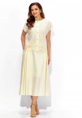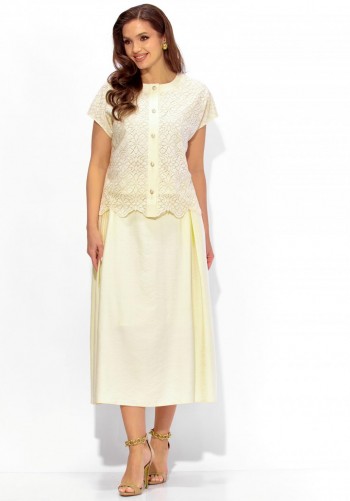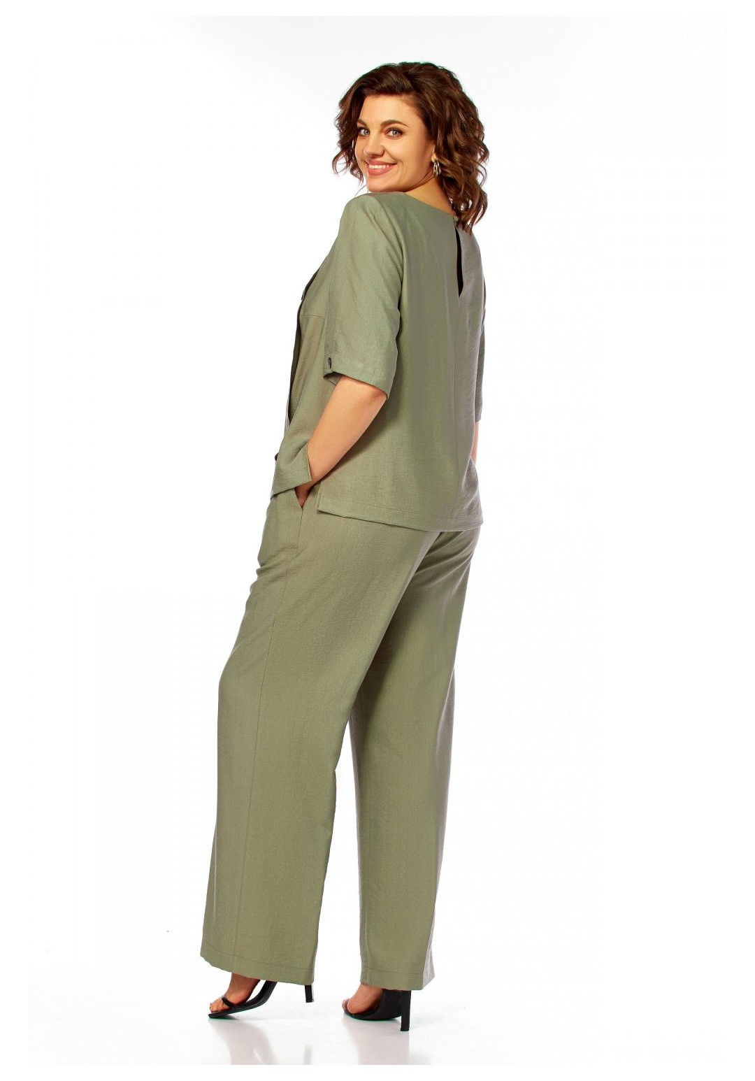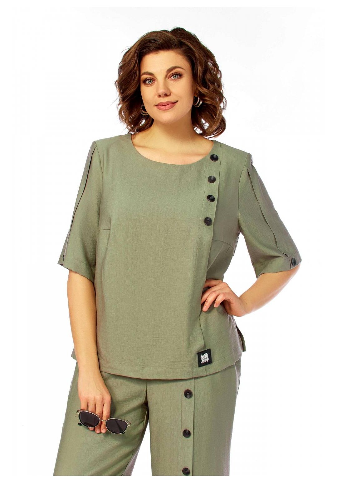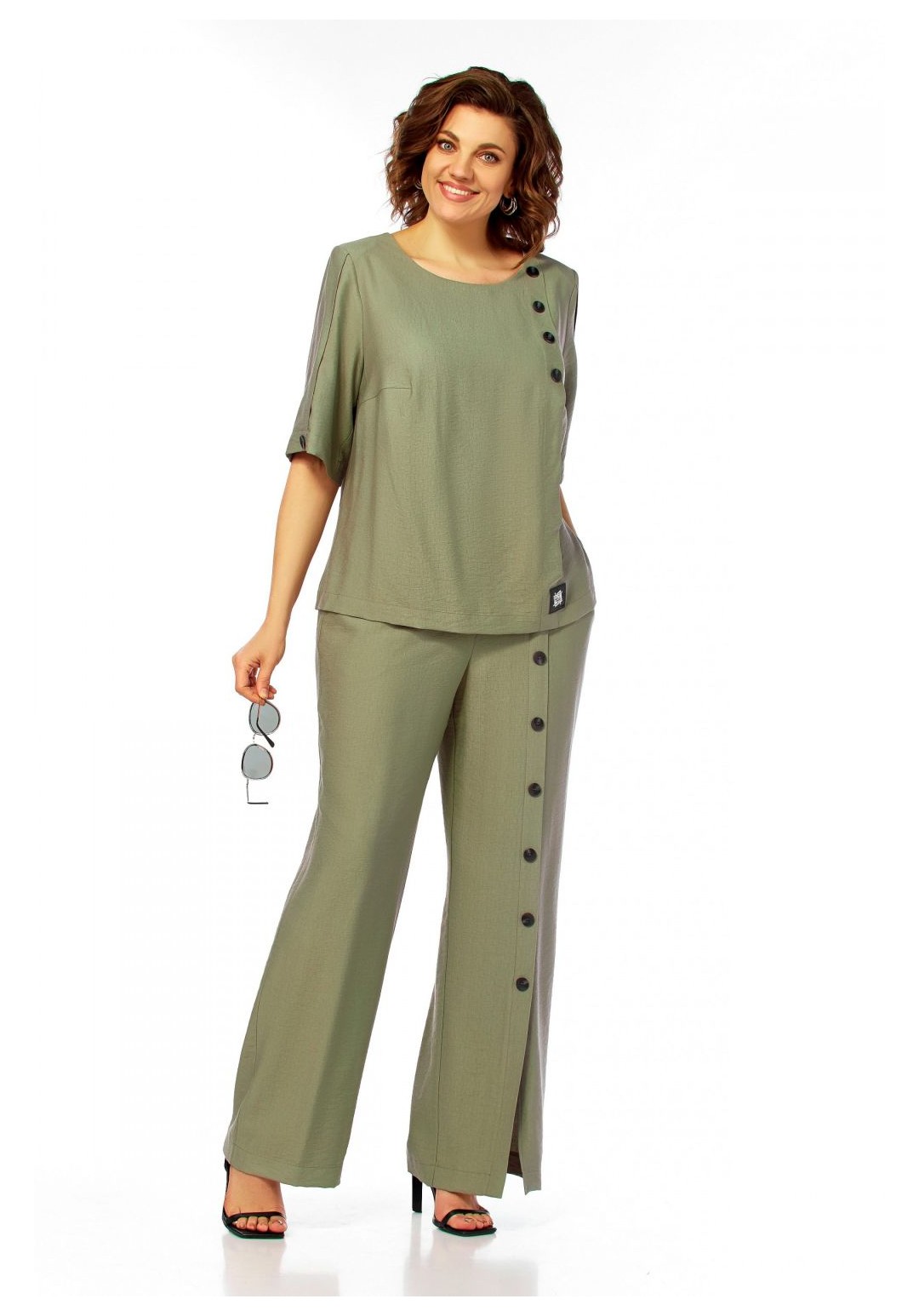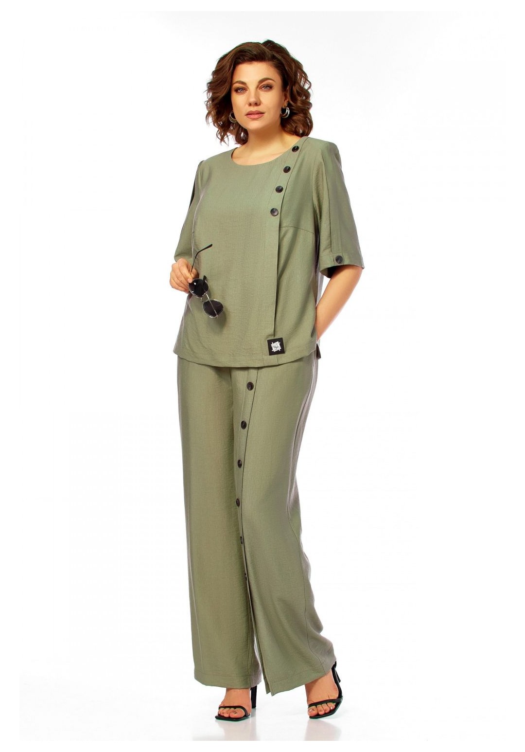 Интересный легкий костюм, состоит из блузы и брюк. Блуза полуприлегающего силуэта, с округлым вырезом горловины. Нагрудные вытачки, слева заложена декоративная складка с пришитыми пуговицами и отделочной нашивкой. Спинка со средним швом и застежкой на петлю и пуговицу. Разрезы в боковых швах. Рукав короткий, по центру со складкой и пуговицей. Брюки прямого силуэта, с карманами в боковых швах. Пояс притачной, частично на резинке. На левом полотнище обносторонняя складка от пояса до низа с пришивными декоративными пуговицами. Длина блузы 58см, длина рукава 33,5см, длина брюк 110см.