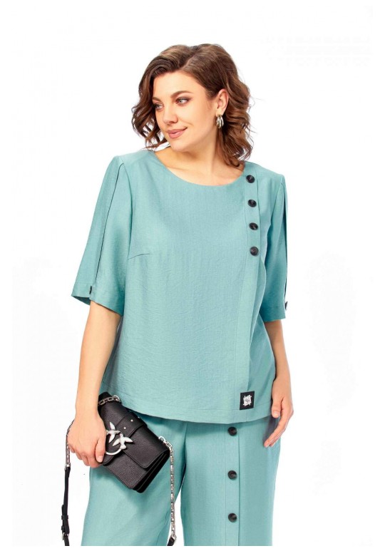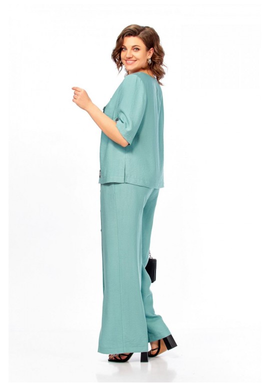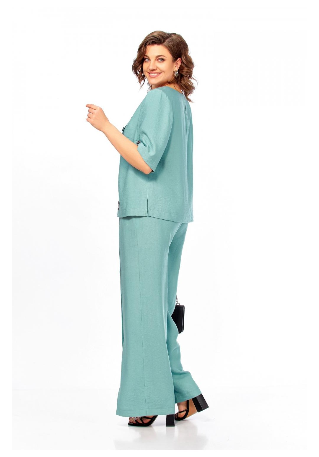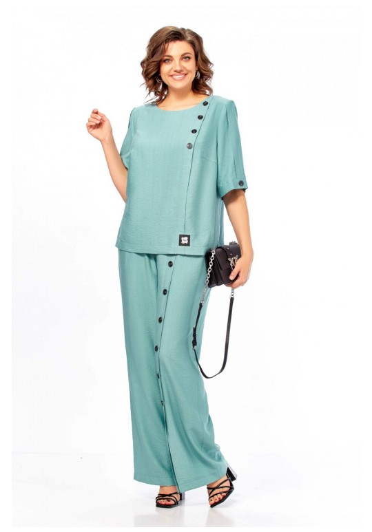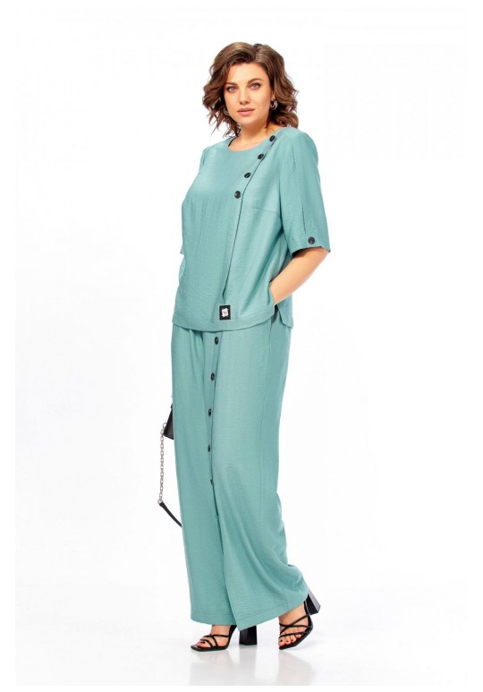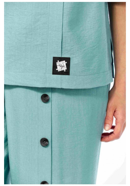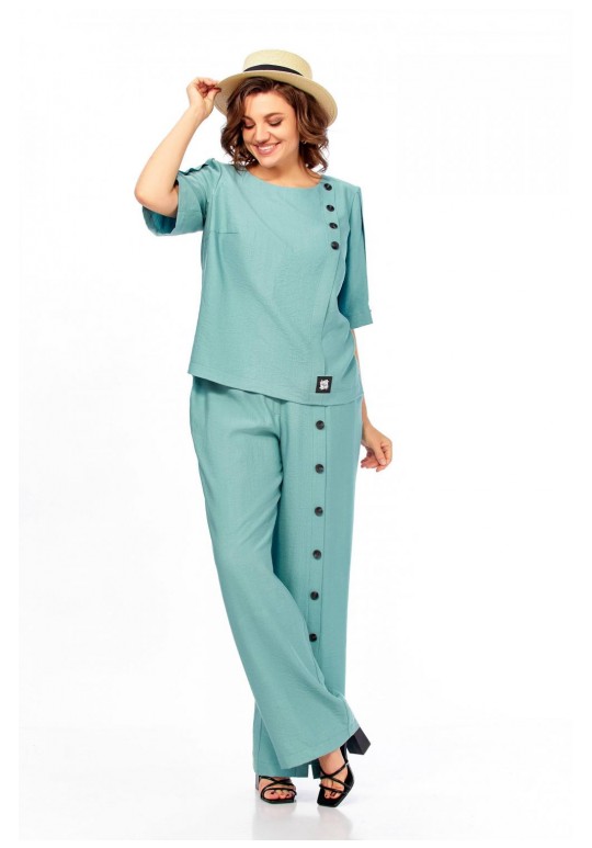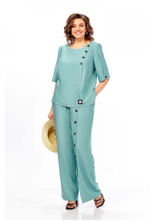 Интересный легкий костюм, состоит из блузы и брюк. Блуза полуприлегающего силуэта, с округлым вырезом горловины. Нагрудные вытачки, слева заложена декоративная складка с пришитыми пуговицами и отделочной нашивкой. Спинка со средним швом и застежкой на петлю и пуговицу. Разрезы в боковых швах. Рукав короткий, по центру со складкой и пуговицей. Брюки прямого силуэта, с карманами в боковых швах. Пояс притачной, частично на резинке. На левом полотнище обносторонняя складка от пояса до низа с пришивными декоративными пуговицами. Длина блузы 58см, длина рукава 33,5см, длина брюк 110см.