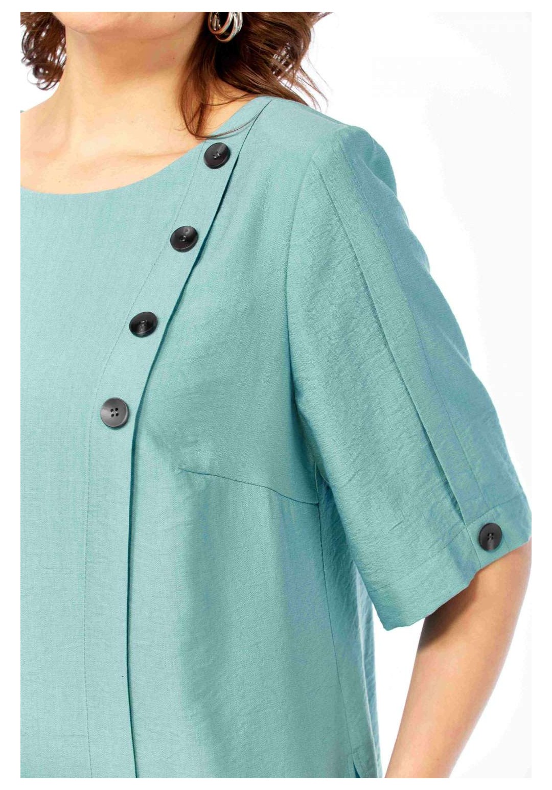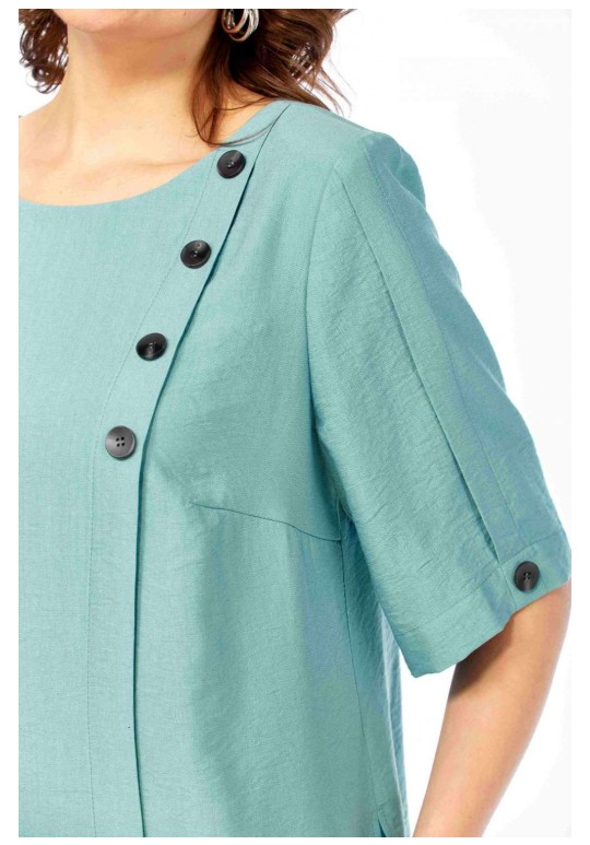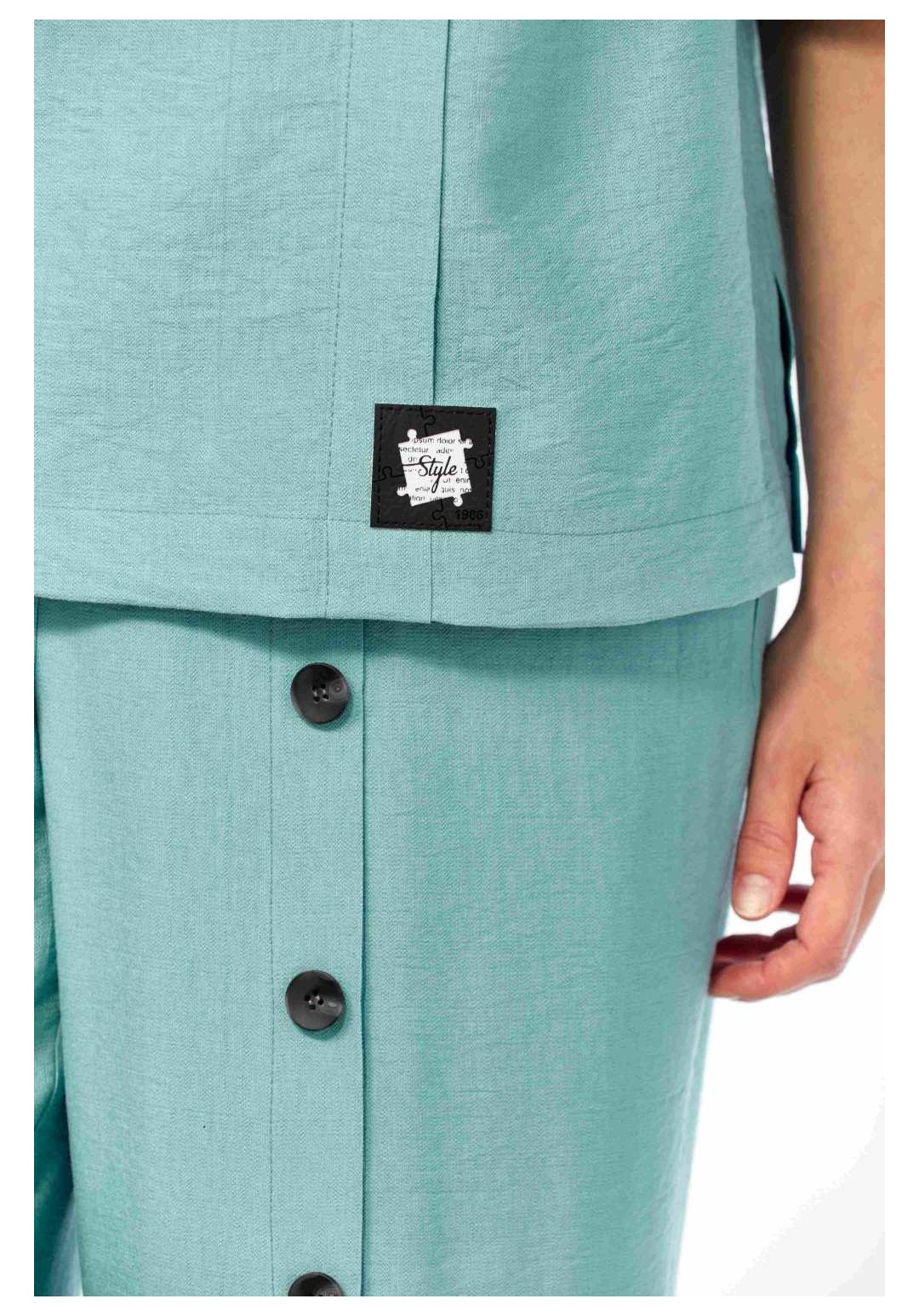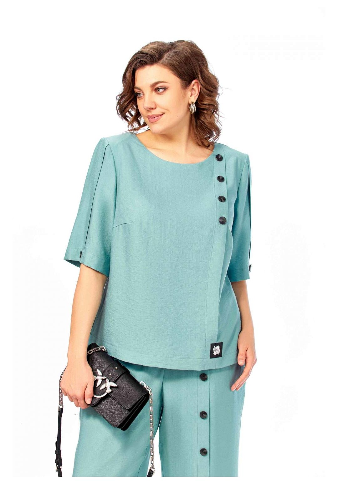 Интересный легкий костюм, состоит из блузы и брюк. Блуза полуприлегающего силуэта, с округлым вырезом горловины. Нагрудные вытачки, слева заложена декоративная складка с пришитыми пуговицами и отделочной нашивкой. Спинка со средним швом и застежкой на петлю и пуговицу. Разрезы в боковых швах. Рукав короткий, по центру со складкой и пуговицей. Брюки прямого силуэта, с карманами в боковых швах. Пояс притачной, частично на резинке. На левом полотнище обносторонняя складка от пояса до низа с пришивными декоративными пуговицами. Длина блузы 58см, длина рукава 33,5см, длина брюк 110см.