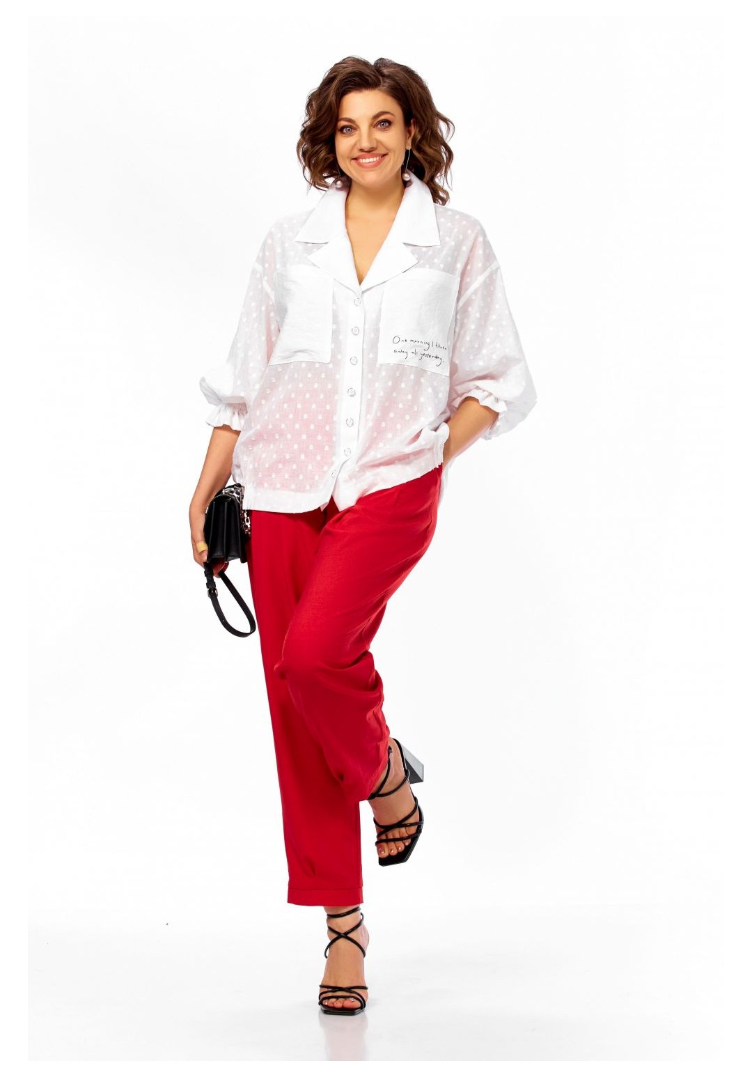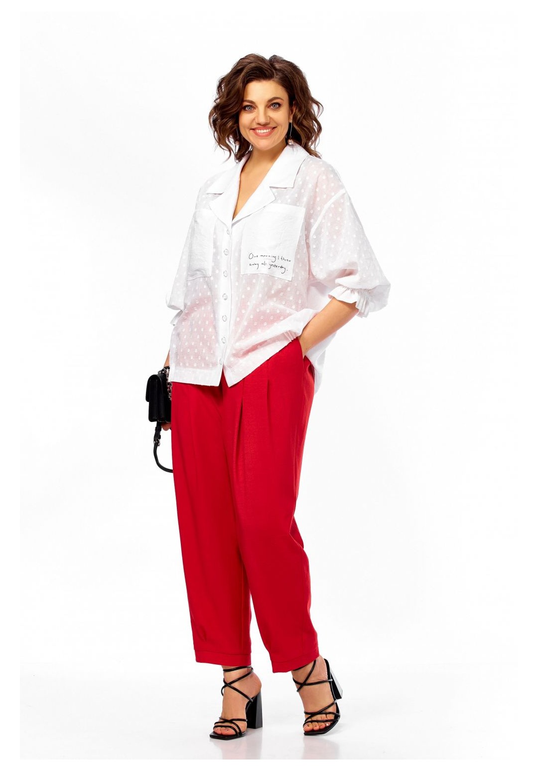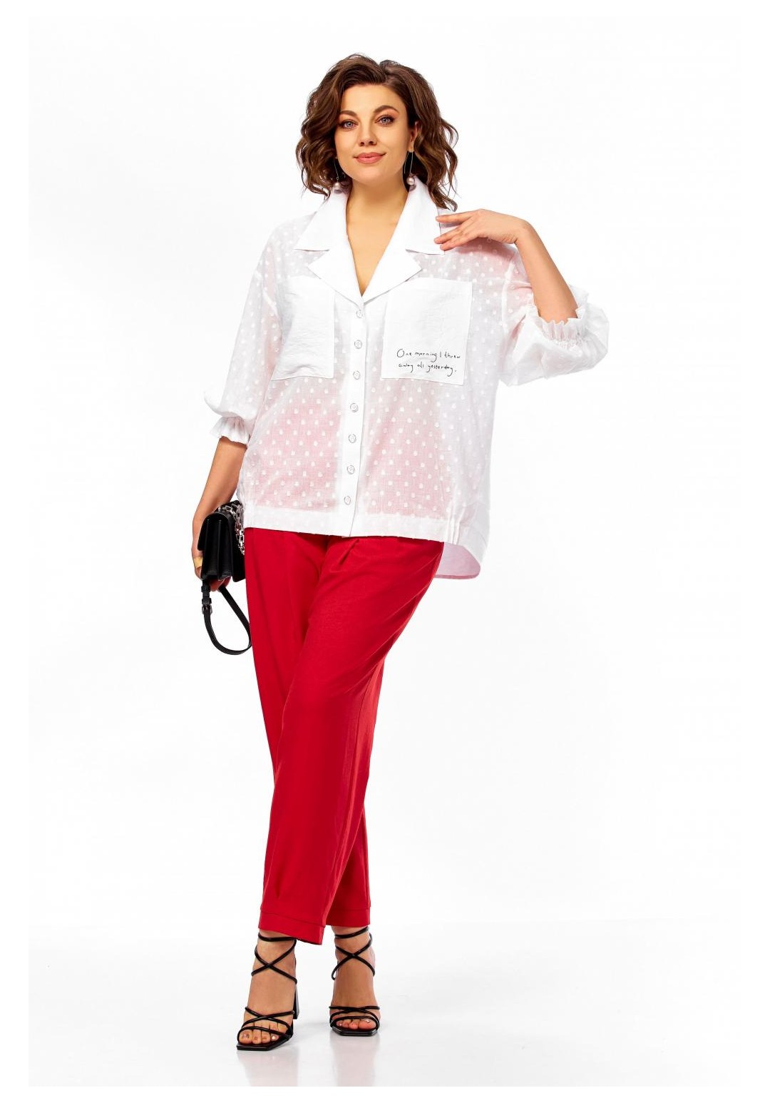 Стильный комплект женский, состоящий из блузки и брюк. Блузка свободного силуэта, с рубашечным воротником. Настрачные карманы с принтом. Низ фигурной формы. Брюки свободного силуэта, зауженные к низу. По низу складка и притачные манжеты. Пояс частично на резинке, карманы в боковых швах. Длина спинки 74см, длина брюк 100см.