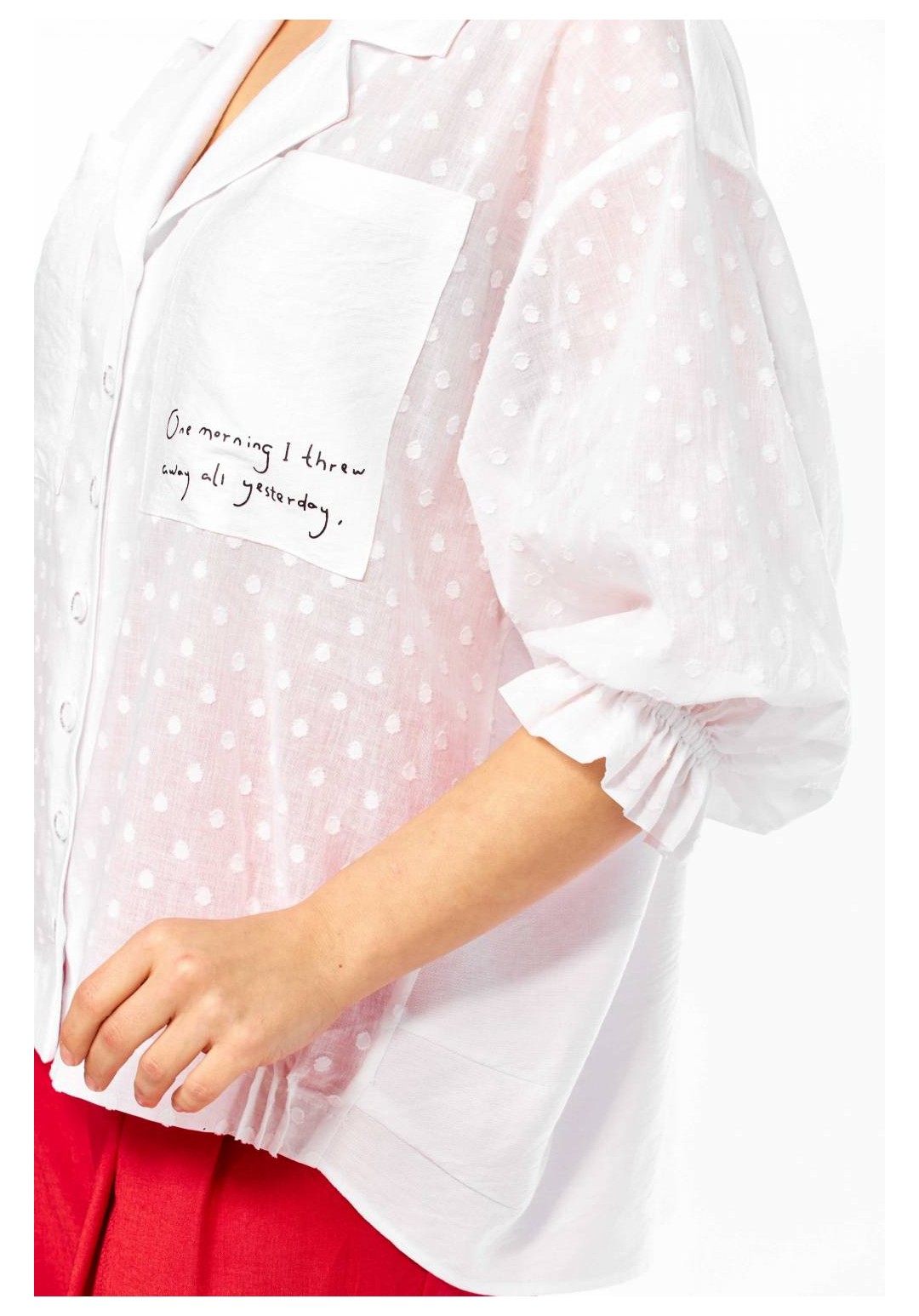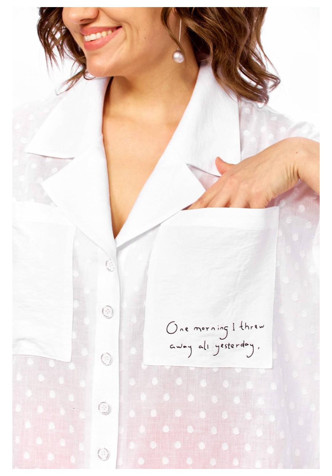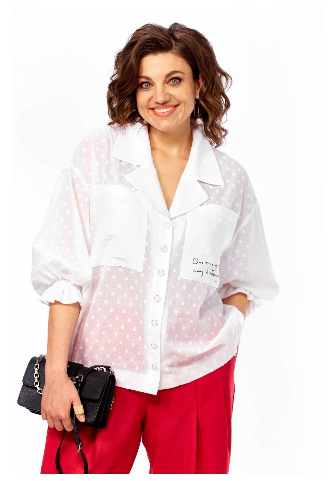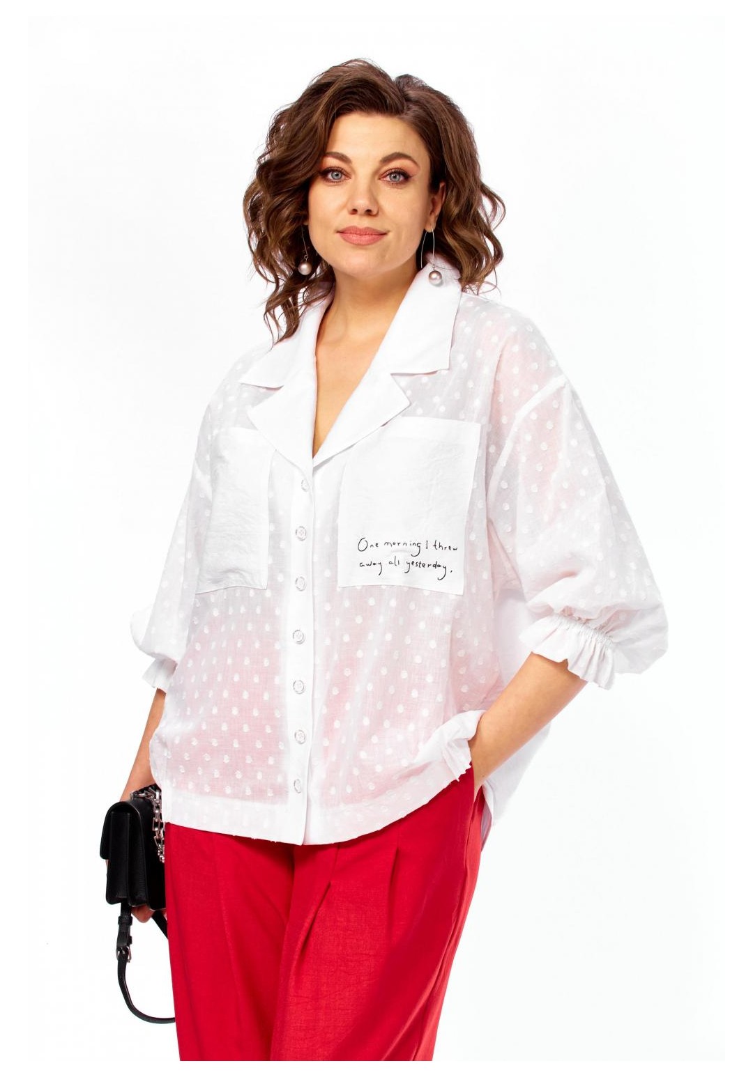 Стильный комплект женский, состоящий из блузки и брюк. Блузка свободного силуэта, с рубашечным воротником. Настрачные карманы с принтом. Низ фигурной формы. Брюки свободного силуэта, зауженные к низу. По низу складка и притачные манжеты. Пояс частично на резинке, карманы в боковых швах. Длина спинки 74см, длина брюк 100см.