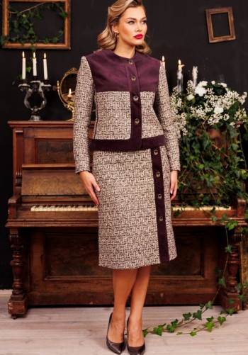Костюм из льняной ткани. Блуза полуприлегающего силуэта, рубашечный воротник с центральной застежкой на пуговицы. Слева накладной карман из отделочной ткани. Рукав спущенный со вставкой из отделочной ткани и патой длиной три четверти. Брюки заужены к низу, с заутюжеными складками. Брюки на поясе на резинке с карманами к боковым швам. Низ с цельнокроеными манжетами. Длина блузы 84см, длина брюк 103см.