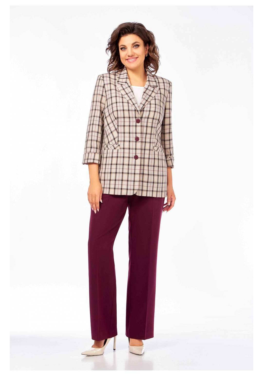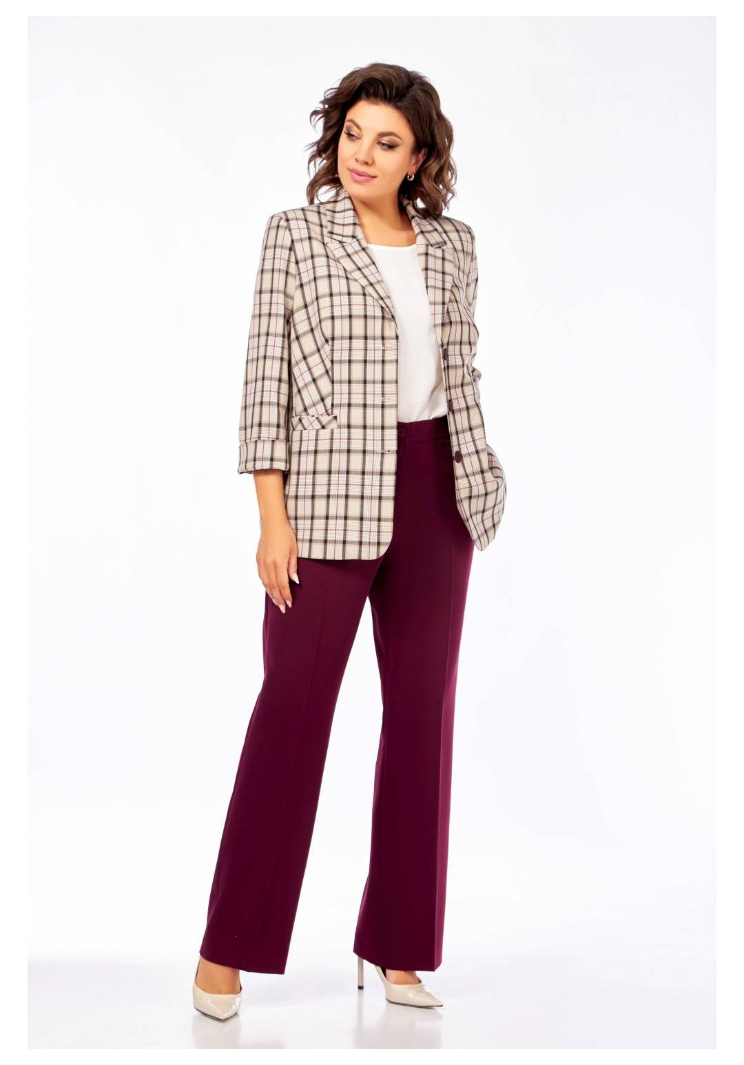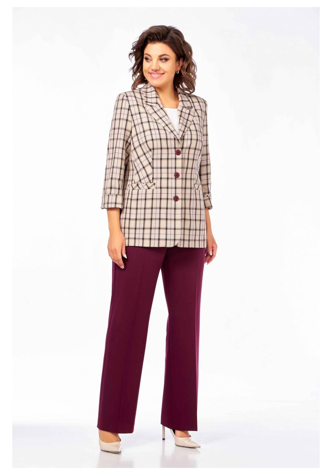 Комплект выполнен из двух тканей. Жакет в клетку, брюки однотон. Жакет полуприлегающего силуэта, с застежкой на три пуговицы. Воротник с лацканами, по переду карманы с листочкой, рельефные швы. Спинка со средним швом. Жакет на подкладке. Рукав длиной три четверти с цельнокроеной манжетой. Брюки прямого кроя со стрелками. Брюки на поясе по спинке резинка, застежка на молнию и петлю-пуговицу. Длина жакета 70см, длина рукава 50см, длина брюк 110см.