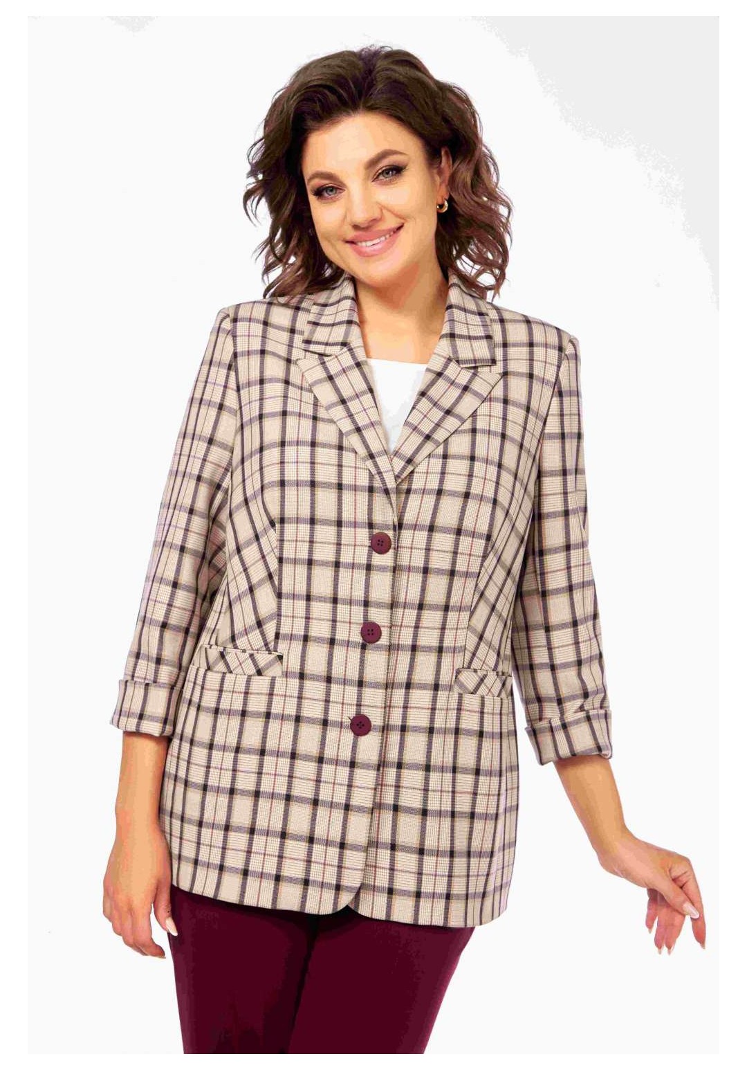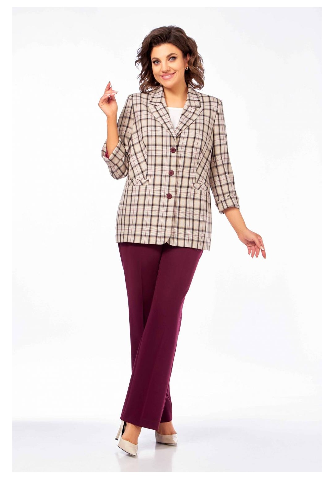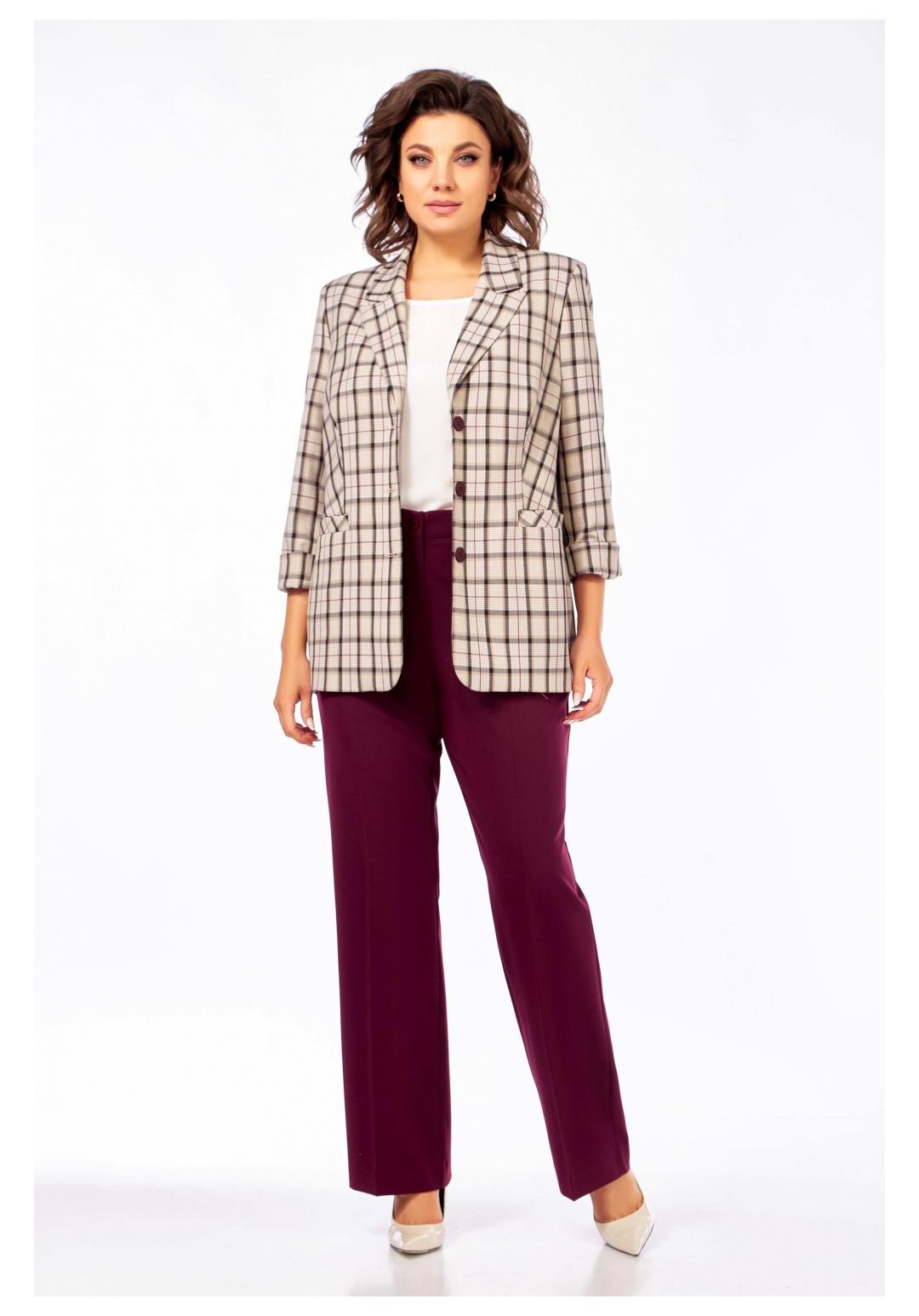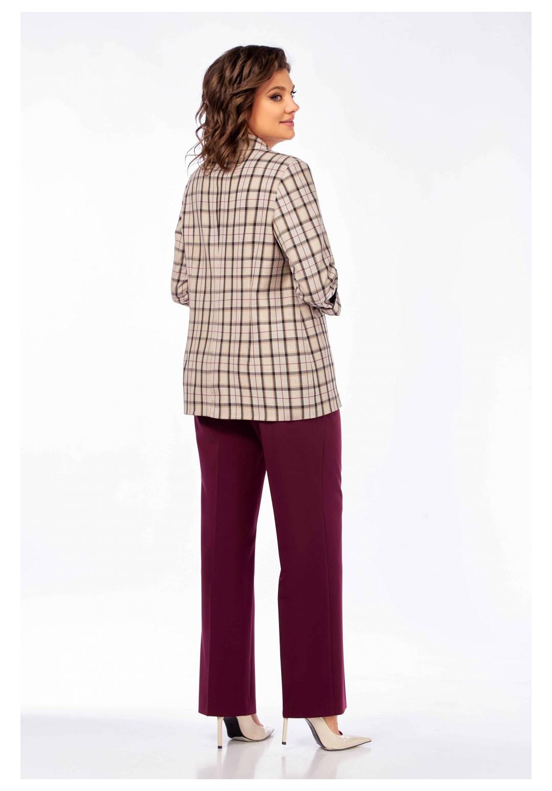 Комплект выполнен из двух тканей. Жакет в клетку, брюки однотон. Жакет полуприлегающего силуэта, с застежкой на три пуговицы. Воротник с лацканами, по переду карманы с листочкой, рельефные швы. Спинка со средним швом. Жакет на подкладке. Рукав длиной три четверти с цельнокроеной манжетой. Брюки прямого кроя со стрелками. Брюки на поясе по спинке резинка, застежка на молнию и петлю-пуговицу. Длина жакета 70см, длина рукава 50см, длина брюк 110см.
