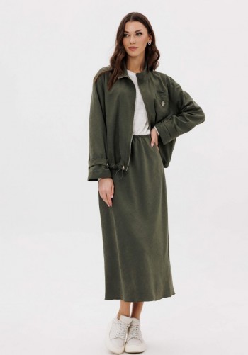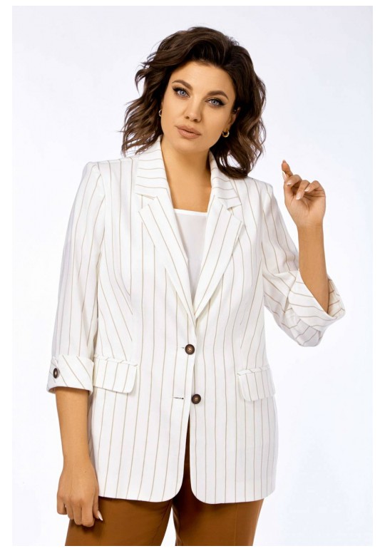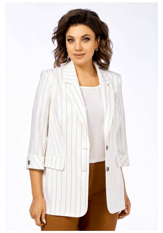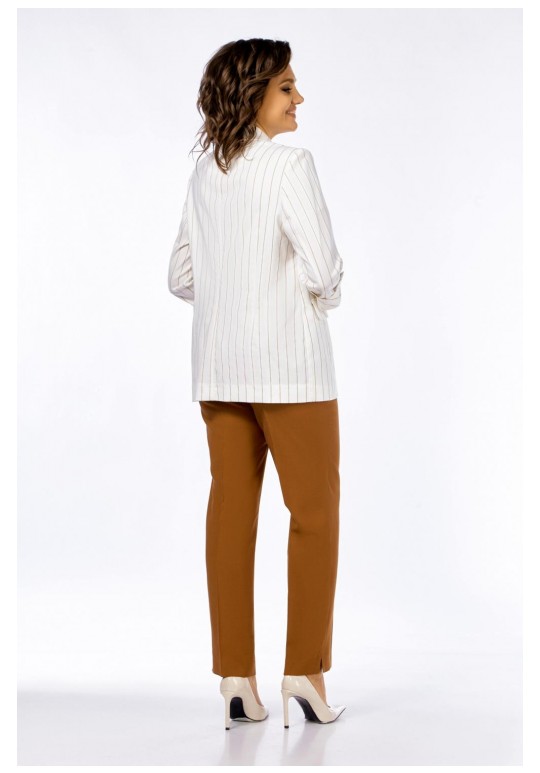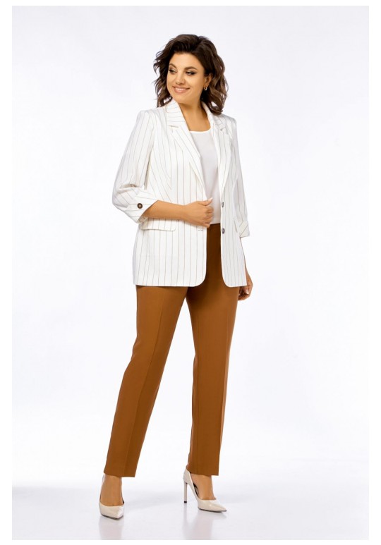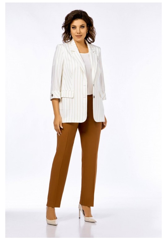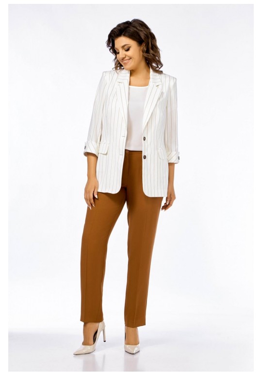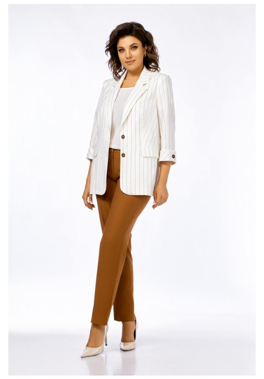 Жакет полуприлегающего силуэта, с пиджачным воротником, застежка на две пуговицы. На полочке карманы с клапанами. Рукав втачной, длиной три черверти с манжетой и пуговицей. Подкладка хлопковая на полочке. Брюки слегка зауженные к низу, на поясе, с застежкой на молнию и петлю и пуговицу. По спинке резинка. В боковых швах разрезы. Длина жакета 70см. Длина брюк 101см.