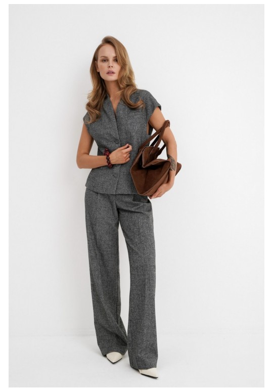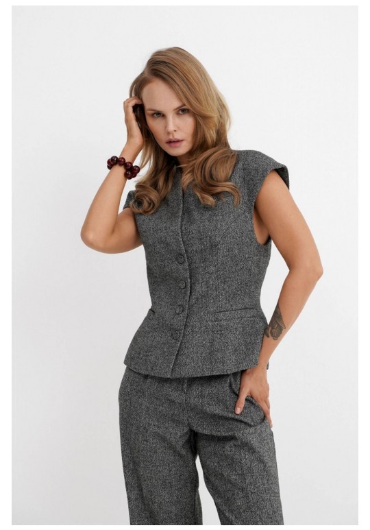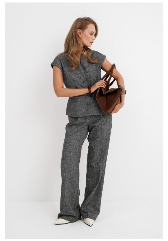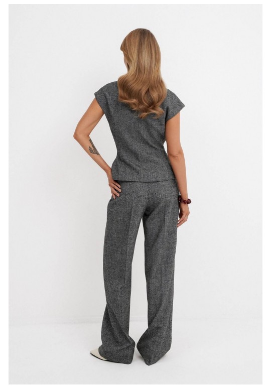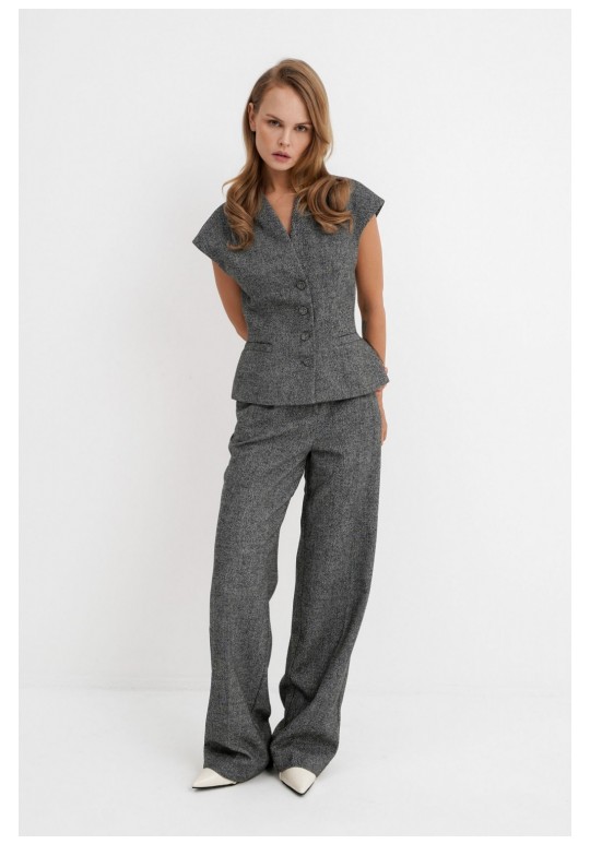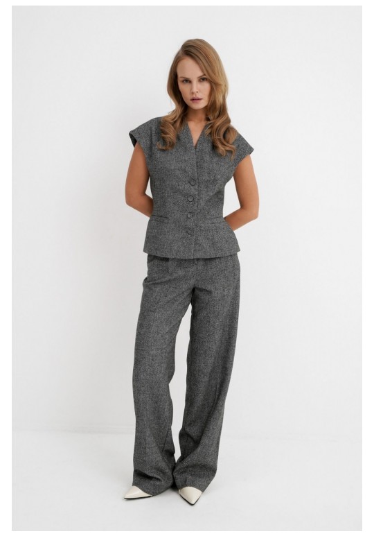 Костюм-двойка из приталенного жилета с воротником-стойкой и широких прямых брюк из меланжевой текстильной ткани. Детали: полуприлегающий силуэт, цельнокроеный воротник-стойка, рельефные швы переда и спинки, функциональные карманы, застежка на петли и пуговицы, жилет на подкладке. Брюки с притачным поясом со шлевками, передние половины с небольшими застроченными мягкими складками и заутюженными стрелками, застежка на молнию и пуговицу, боковые карманы. Задние части брюк с вытачками и заутюженными стрелками. Пояс брюк прямой, без резинки. Длина жилета по спинке около 54 см в размерах 40-46 и около 56 см в размерах 48-52. Длина брюк по боковому шву с поясом около 114 см в размерах 40-46 и около 115,5 см в размерах 48-52. Длина по внутреннему шву около 83 см