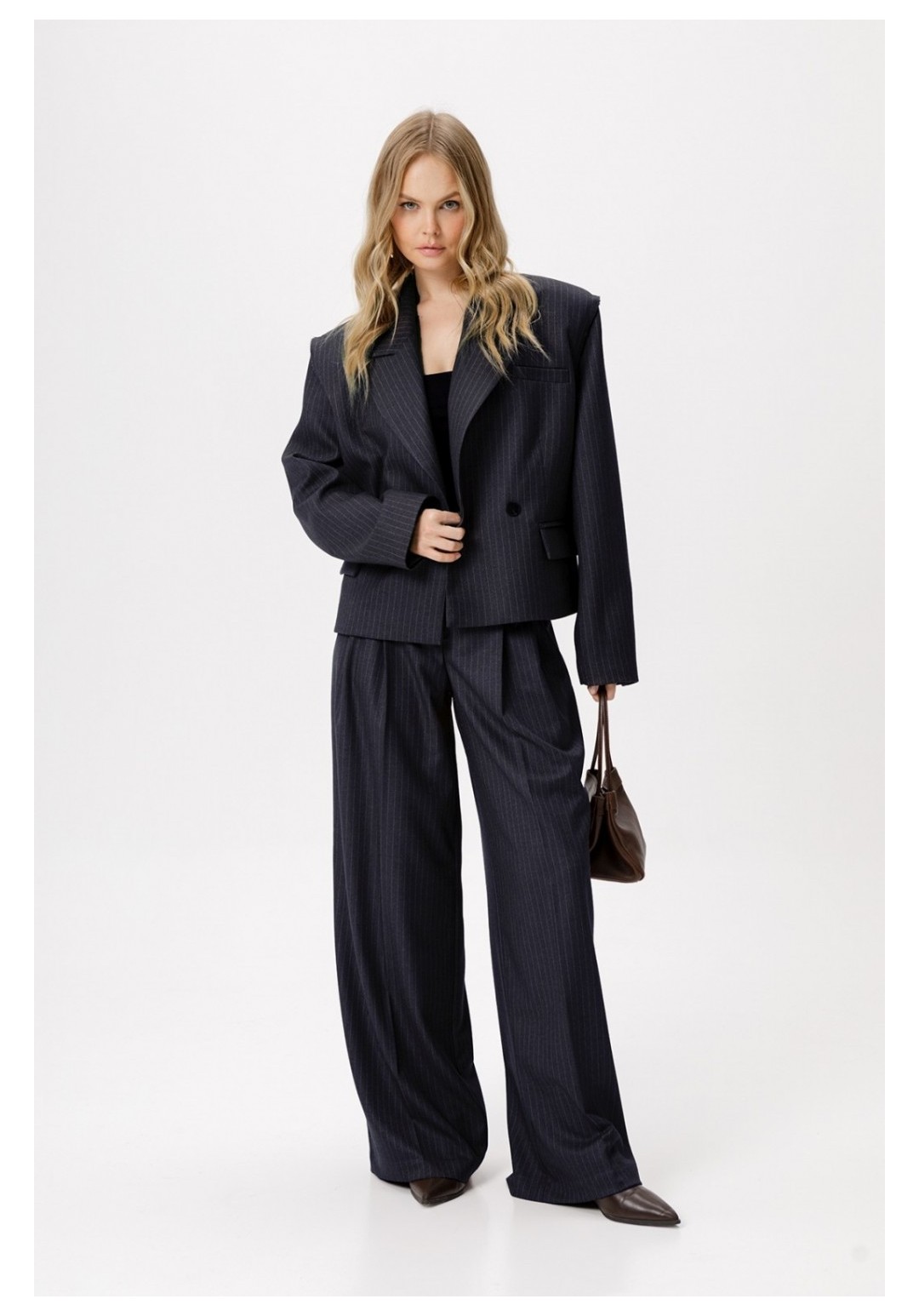 Костюм-тройка из укороченного оверсайз жакета с необработанными проймами, широких брюк-палаццо и съемной юбки-баски килт из текстильной ткани в полоску. Детали: жакет прямого силуэта, пиджачный воротник, двубортная застежка на две петли и пуговицы, функциональные карманы, спинка с фигурной кокеткой, рукава втачные, жакет на подкладке. Брюки с притачным поясом со шлевками, складки у пояса, застежка на молнию и пуговицу, боковые карманы, заутюженные стрелки. Задние части брюк с вытачками и имитацией карманов. Баска с притачным поясом с застежкой на петлю и пуговицу. Длина жакета по спинке около 55 см в размерах 40-46 и около 56,5 см в размерах 48-52. Длина рукавов около 61 см. Длина брюк по боковому шву с поясом около 109,5 см. Длина по внутреннему шву около 83 см.