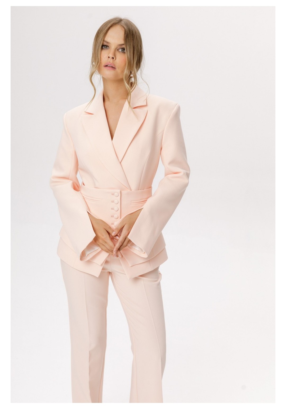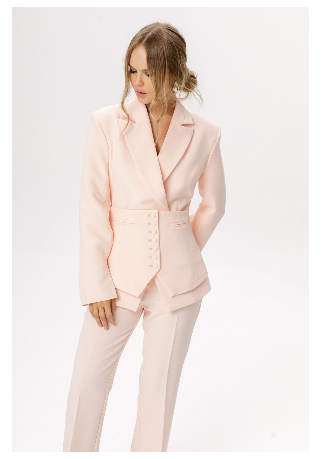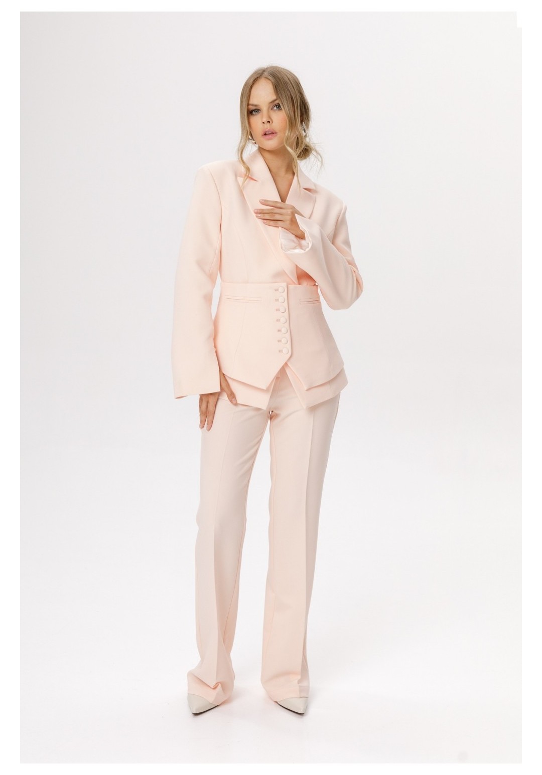 Комплект-двойка из приталенного жакета с разрезами по рукавам и съёмной баски (приобрести брюки с фото можно по арт. 6343, приобрести жакет с фото без баски 6539). Детали: полуприлегающий силуэт, втачные двухшовные рукава, смещённая застёжка на одну петлю и пуговицу. Баска приталенная, рельефные швы, функциональные карманы, центральная застёжка на петли и пуговицы, хлястик-регулятор по спинке. Длина жакета по спинке около 65 см в размерах 40-46, около 68 см в размерах 48-52, длина рукава около 62 см. Длина баски около 22,5 см в размерах 40-52.