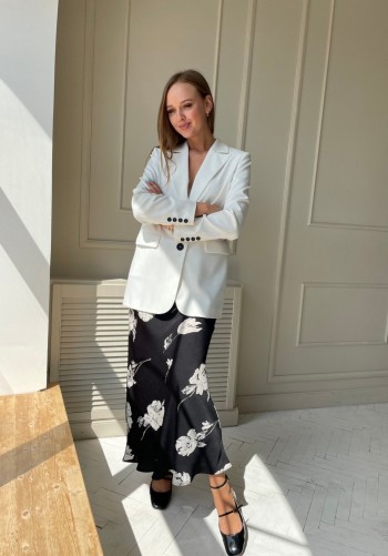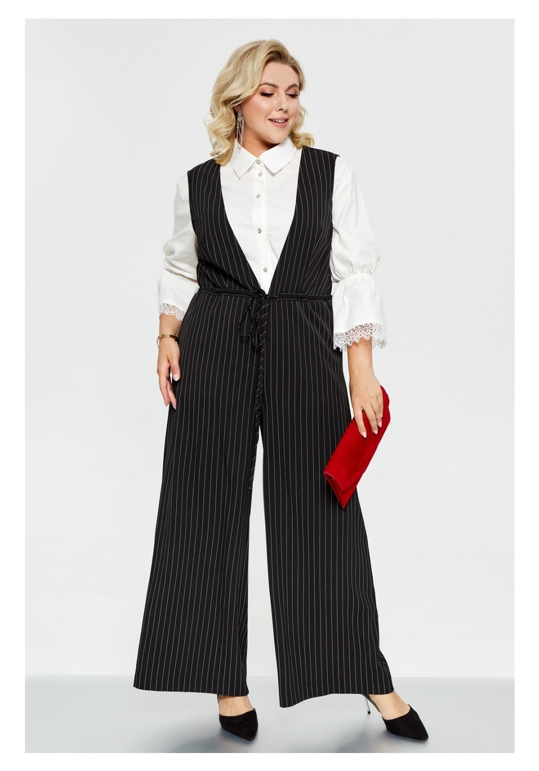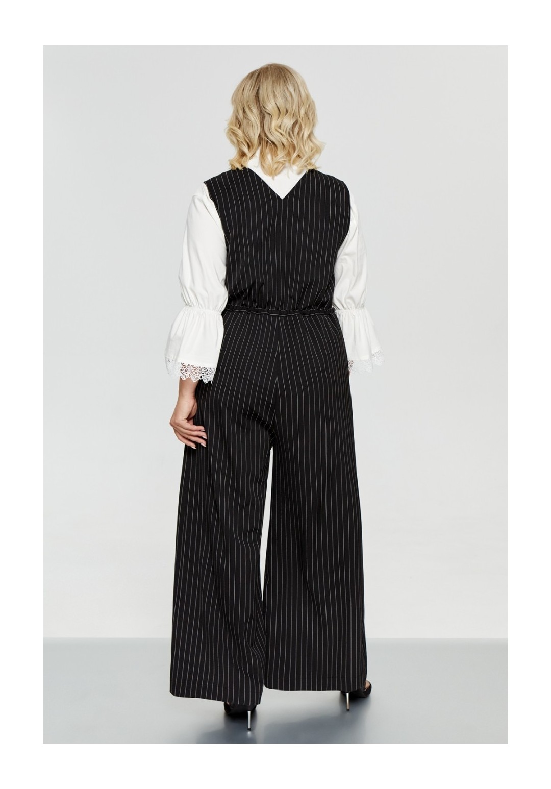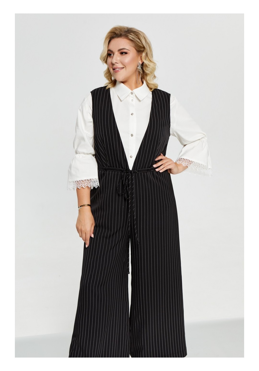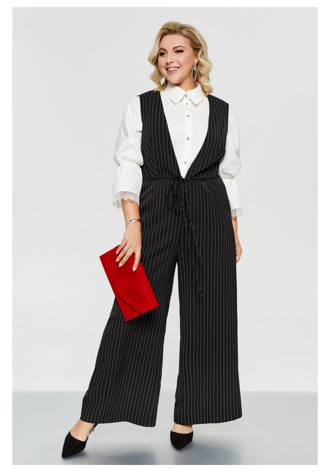 Комплект-двойка из комбинезона и блузы. Комбинезон из костюмно-плательной ткани, с V-образным вырезом горловины спереди и сзади. На деталях переда обработаны нагрудные вытачки, в боковых швах-карманы. Объём в области талии регулируется шнуром в кулисе. Блуза с центральной застёжкой на планку с пуговицами. Спереди обработаны нагрудные вытачки. Низ блузы фигурный. Рукава втачные одношовные, ниже локтя собраны на эластичную тесьму. Низ рукавов декорирован кружевной тесьмой.