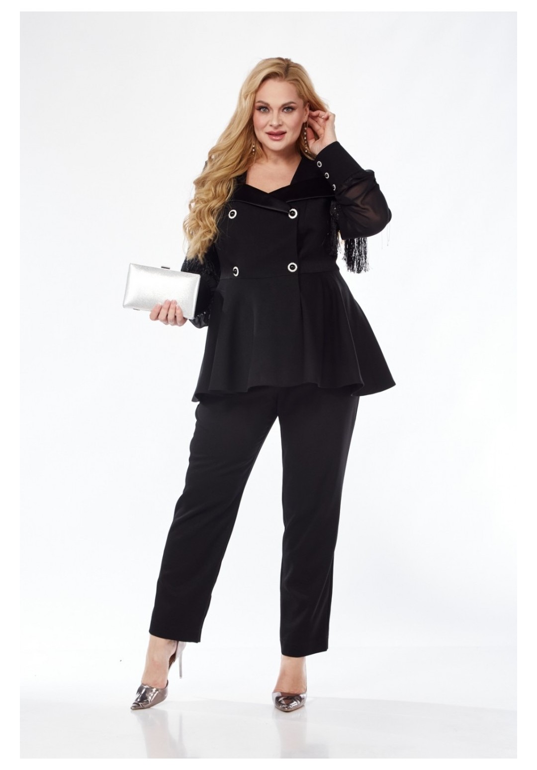 Комплект-двойка из жакета с баской и зауженных к низу брюк. Жакет с баской и втачными рукавами. Отрезной в талии лиф выполнен с двубортной застёжкой и фигурным вырезом декольте, декорированным лацканами из отделочной ткани. Рукава из шифона на отрезной высокой манжете. Изделие на подкладке и с плечевыми накладками. Брюки на притачном поясе с эластичной тесьмой, с карманами и застёжкой на передних деталях.