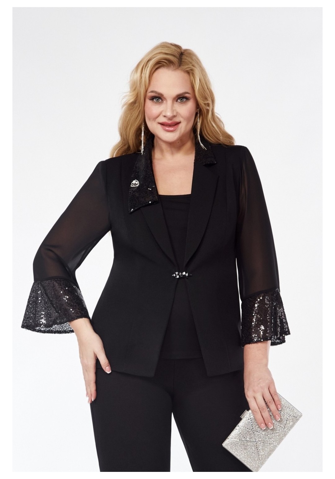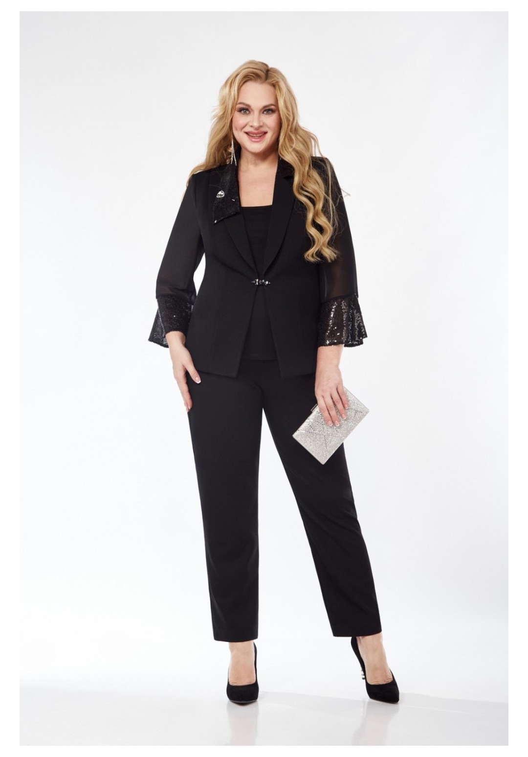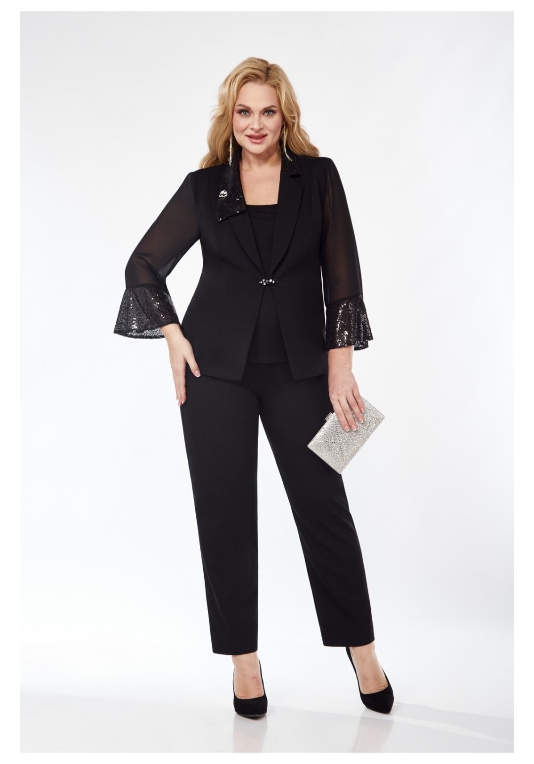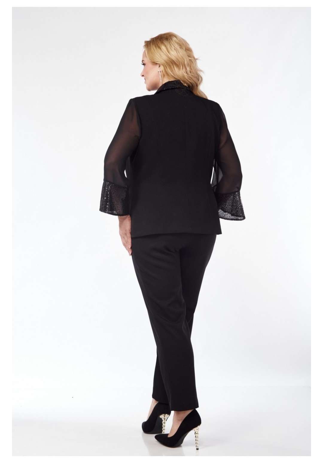 Комплект-тройка из жакета, зауженных к низу брюк и блузы без рукавов. Жакет на подкладке, полуприлегающего силуэта, с шалевым воротником из отделочной ткани с пайетками. На передних и задних деталях обработаны рельефы. Застёжка центральная встык. Рукава из шифона с притачными манжетами из ткани с пайетками. Изделие с плечевыми накладками. Брюки на притачном поясе с эластичной тесьмой, с карманами и застёжкой на передних деталях. Блуза с нагрудными вытачками и с окантованными проймами и горловиной.