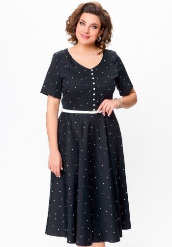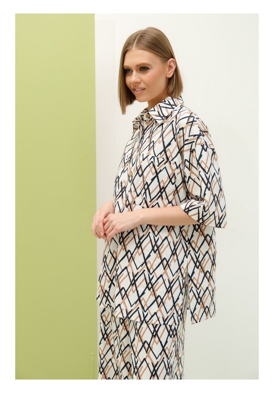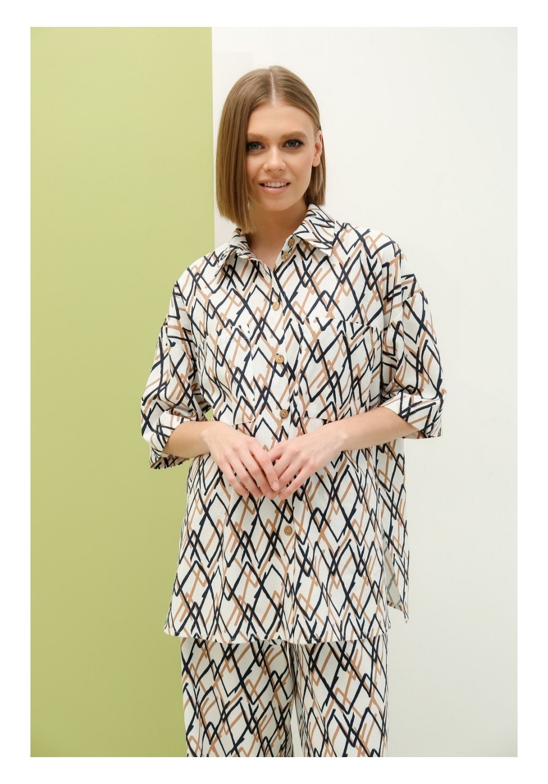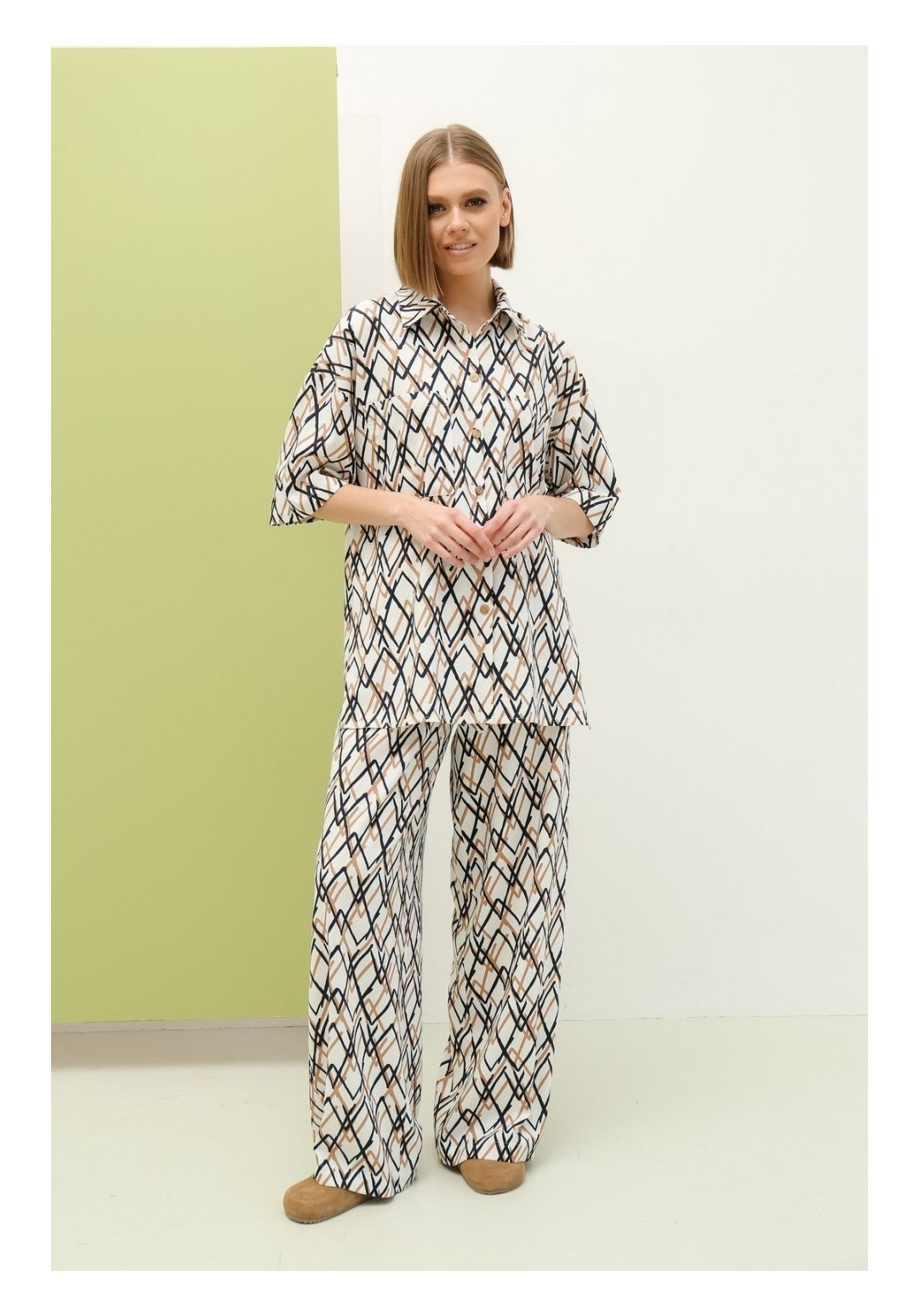 Костюм состоящий из блузы и брюк. Блуза свободного силуэта с центральной застежкой на петли-пуговицы. Перед с двумя накладными карманами. Спинка без среднего шва. Боковые швы заканчиваются разрезами. Рукав втачной одношовный короткий со спущенным плечевым швом. Воротник стояче-отложной на отрезной стойке. Брюки широкие свободного силуэта на притачном поясе с резинкой и втянутым в него поясом. На передних половинках расположены 2 боковых кармана. Длина рукава - 26 см, длина изделия - 75 см, длина брюк - 110 см.
