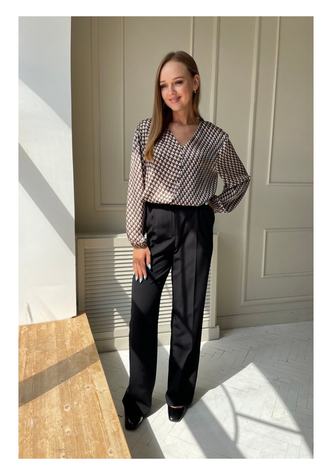 Костюм двойка:блузка и брюки. Блузка прямого силуэта, из сатина: гладкого, струящегося. Брюки прямые,из костюмной ткани, застегиваются на молнию и пуговицу спереди.
