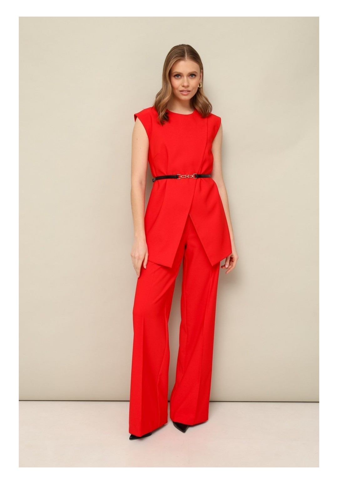 Стильный 2-х предметный костюм, состоящий из жилета и брюк, выполнен из костюмной ткани. Жилет современного прямого силуэта с бортами на запах, застёжка на петли и пуговицы. Спинка со средним швом. Изделие на х/б подкладке. Брюки прямого силуэта из костюмной ткани с заутюженными стрелками. Пояс притачной с застежкой на пуговицу и тесьму-молнию, сзади обработана резинка для регуляции размера по талии. В комплекте прилагается ремень.