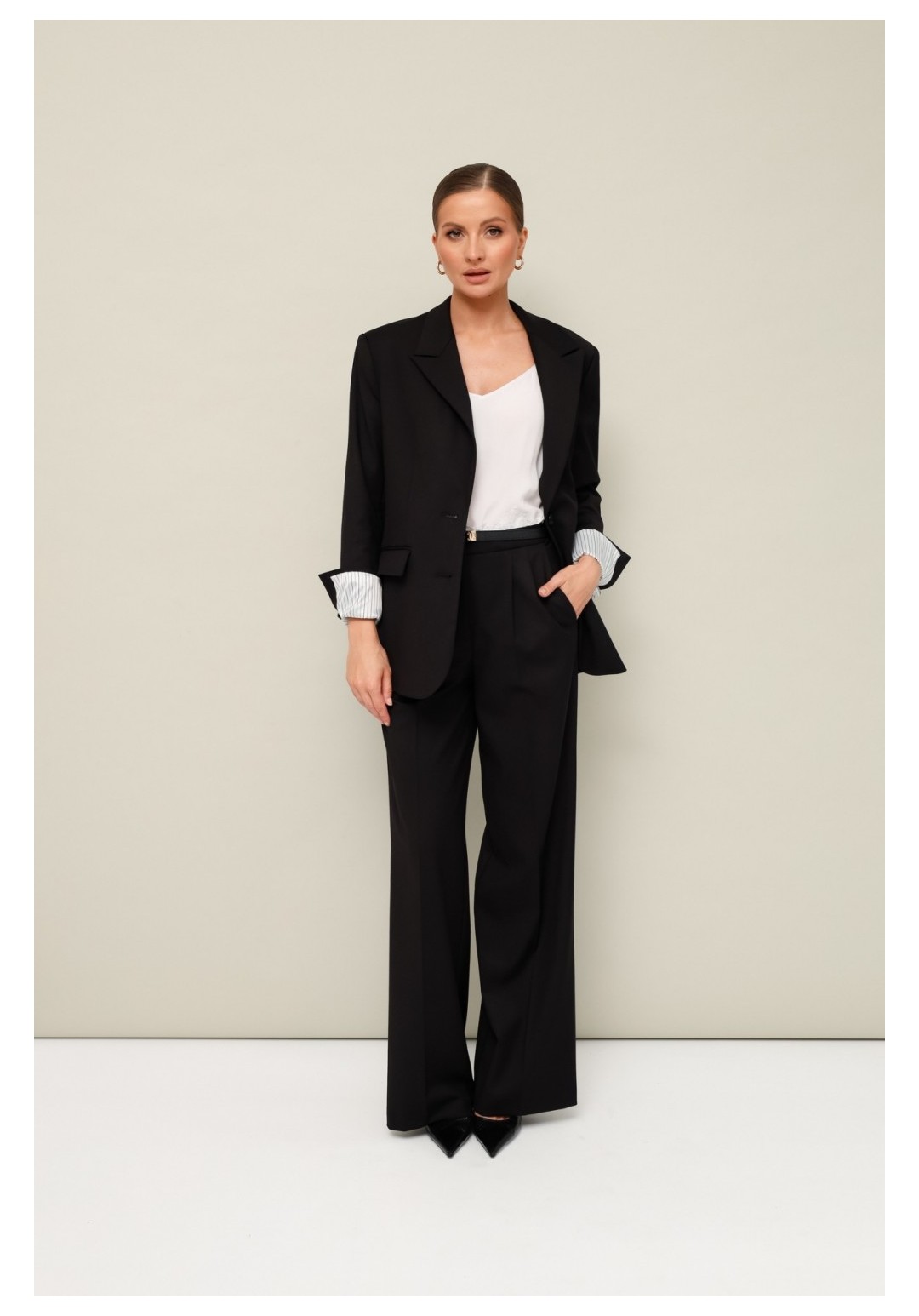 Стильный 2-предметный комплект, состоящий из жакета и брюк, выполнен из качественной костюмной ткани. Жакет актуального полуприлегающего силуэта, с центральной застежкой на петли и пуговицы. Воротник пиджачного типа с отложными лацканами. Спереди обработаны прорезные карманы в рамку с клапанами. Рукава втачные двухшовные со шлицей и отделочной подкладкой. Спинка со средним швом и рельефами, переходящими в шлицы. Жакет на подкладке. Брюки с посадкой на талии и защипами от пояса, с заутюженными стрелками и с боковыми наклонными карманами. Пояс притачной с застежкой на пуговицу и тесьму-молнию, по спинке пояс на резинке для регуляции размера.