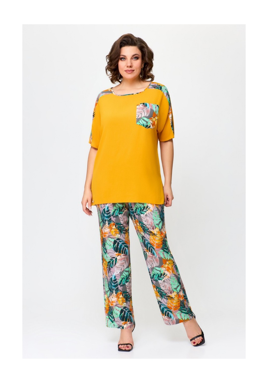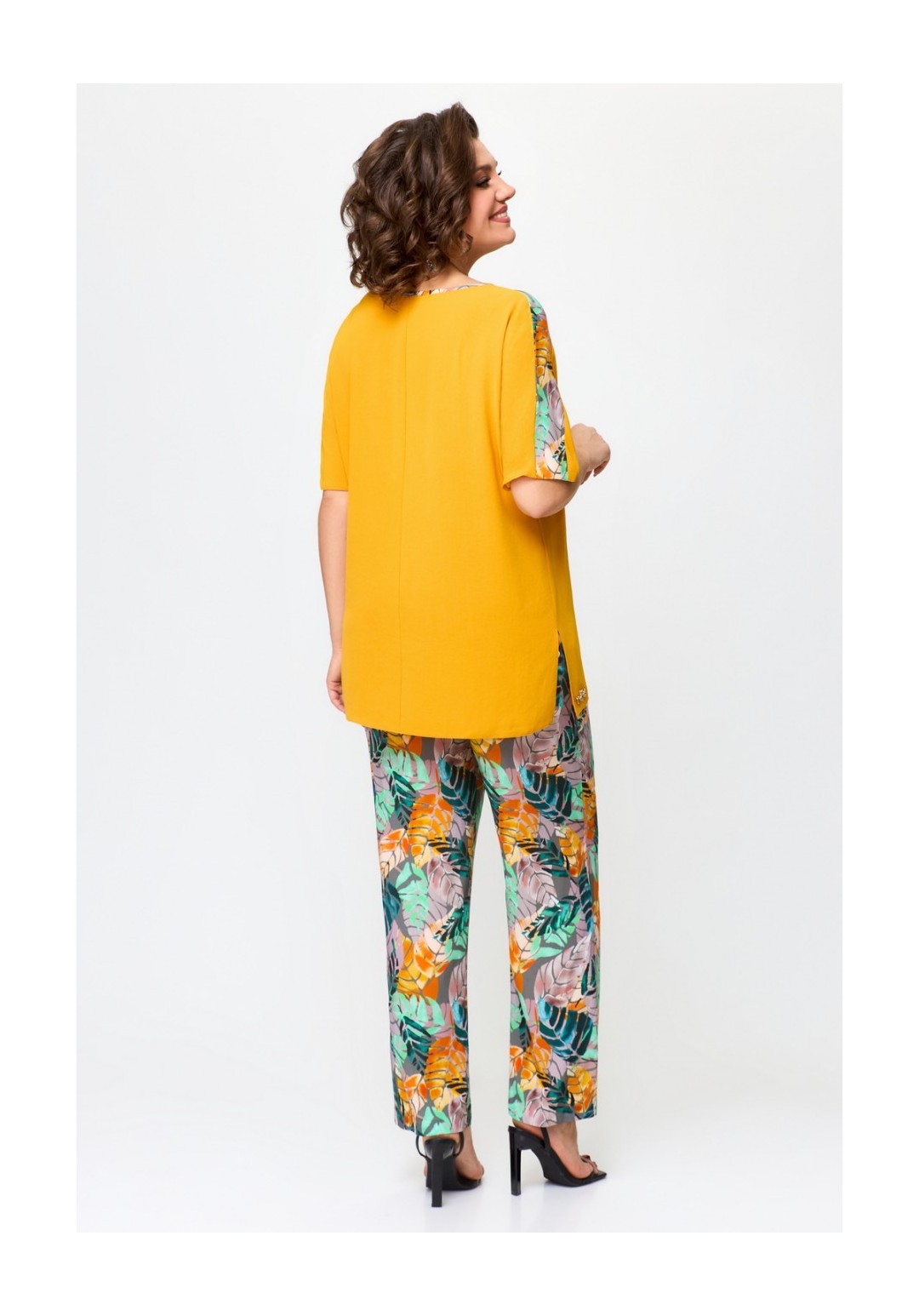 Костюм женский 2-х предметный, состоящий из туники и брюк Туника прямого силуэта со спущенной линией плеча. По плечевому шву лампас. По левой части переда накладной карман. В боковых швах разрезы. Брюки прямые. Спереди расположены скошенные карманы. Верх брюк с притачным поясом на резинке. Фурнитура может меняться от наличия. Длина туники по спинке: 70 см Длина рукава от горловины: 37 см Длина брюк: 101см