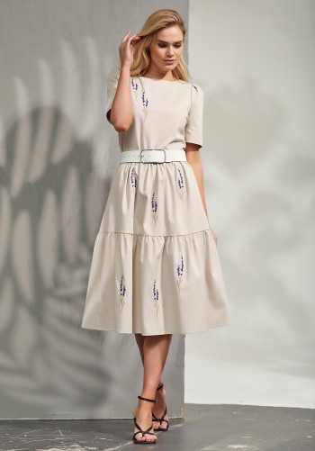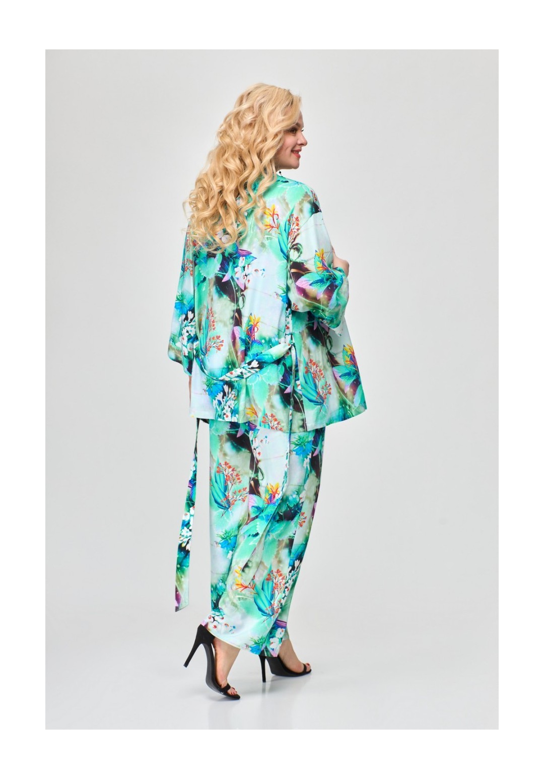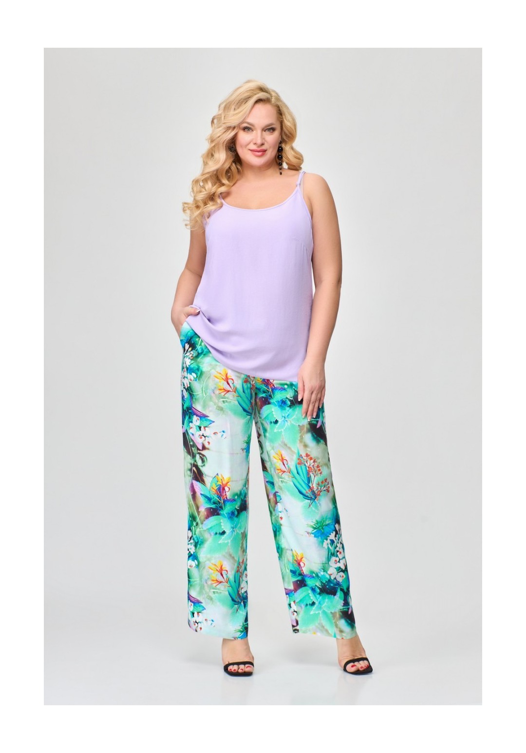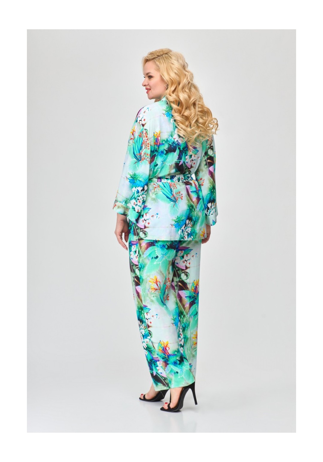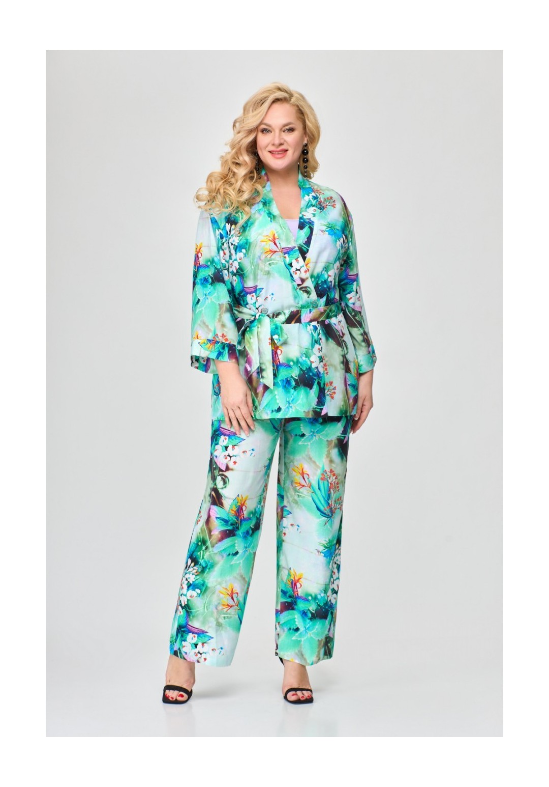 Комплект женский, состоящий из жакета, топа и брюк. Жакет прямого силуэта, со спущенной линией плеча. Рукав втачной с планкой по низу. Горловина V-образная обработана планкой. По переду застежка на петли и пуговицы и потайную пуговицу. На уровне талии съемный пояс из ткани. Топ полуприлегающего силуэта на регулируемых бретелях. По переду нагрудные вытачки. Брюки прямые свободного силуэта. В боковых швах карманы. Пояс притачной на резинке. Фурнитура может меняться. Длина топа по спинке (от плеча) 70 см Длина жакета по спинке 75 см Длина рукава от горловины 62 см Длина брюк 104 см