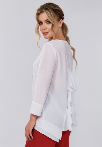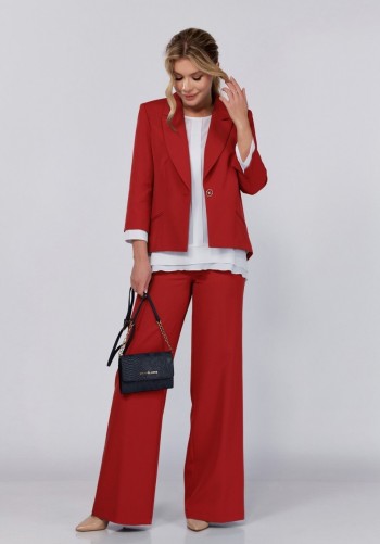 Костюм женский, состоит из блузки и брюк. Блузка прямого силуэта, рукав длинный втачной, линия плеча немного спущена. Воротник отложной, застежка на петли и пуговицы. Перед с декоративным карманом по линии груди. Рукав с манжетой по низу. Низ изделия фигурной формы. Брюки прямые свободного силуэта, с высокой посадкой на талии, с притачной манжетой по низу. Пояс притачной на резинке с кулисой. Отделкой костюма служит контрастный кант. Фурнитура может меняться. Длина блузки по спинке: 72 см Длина рукава: 60 см Длина брюк: 101 см