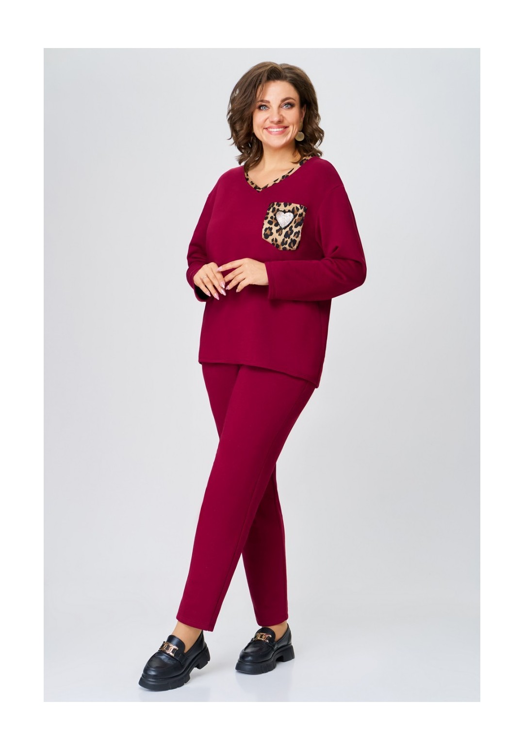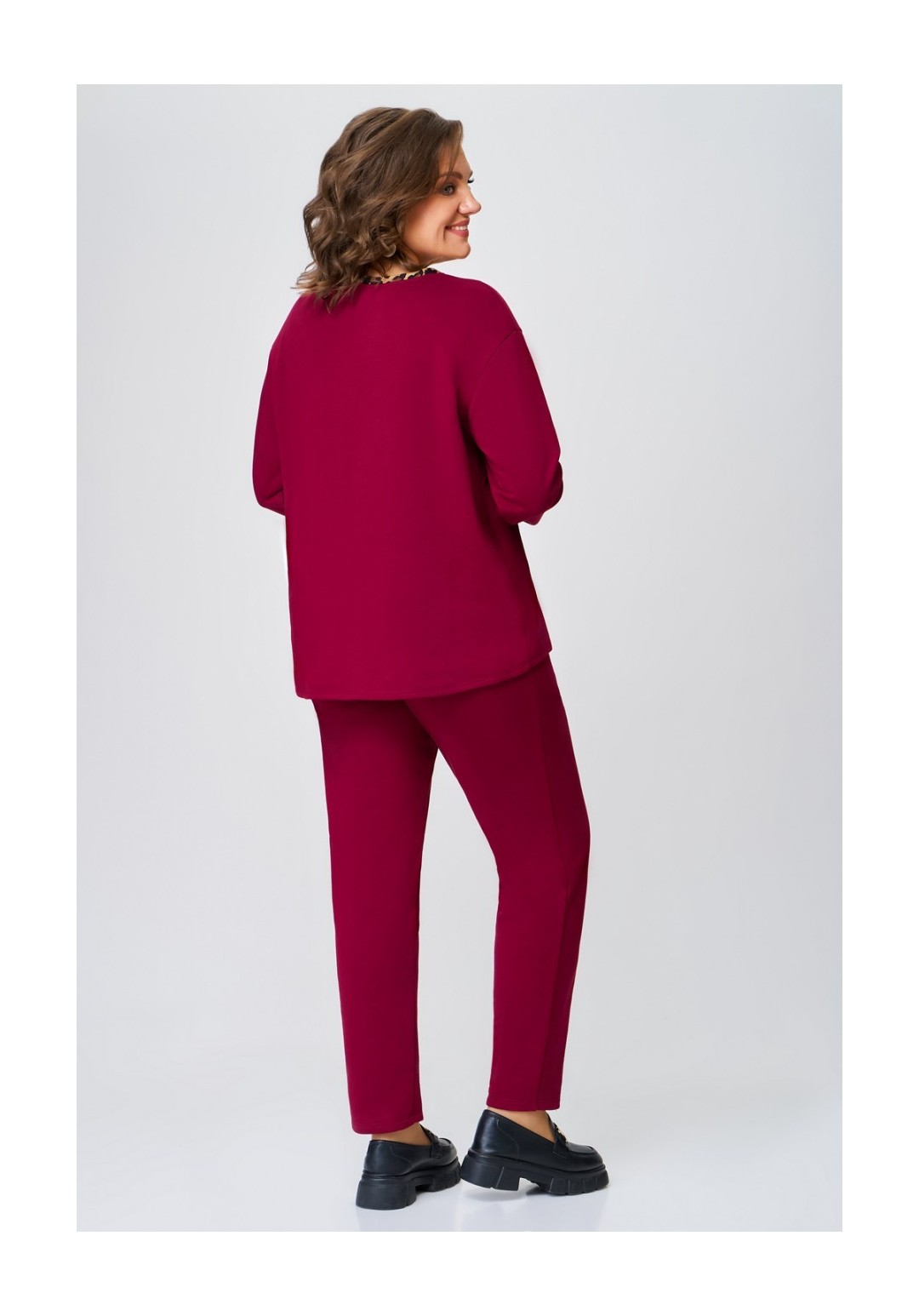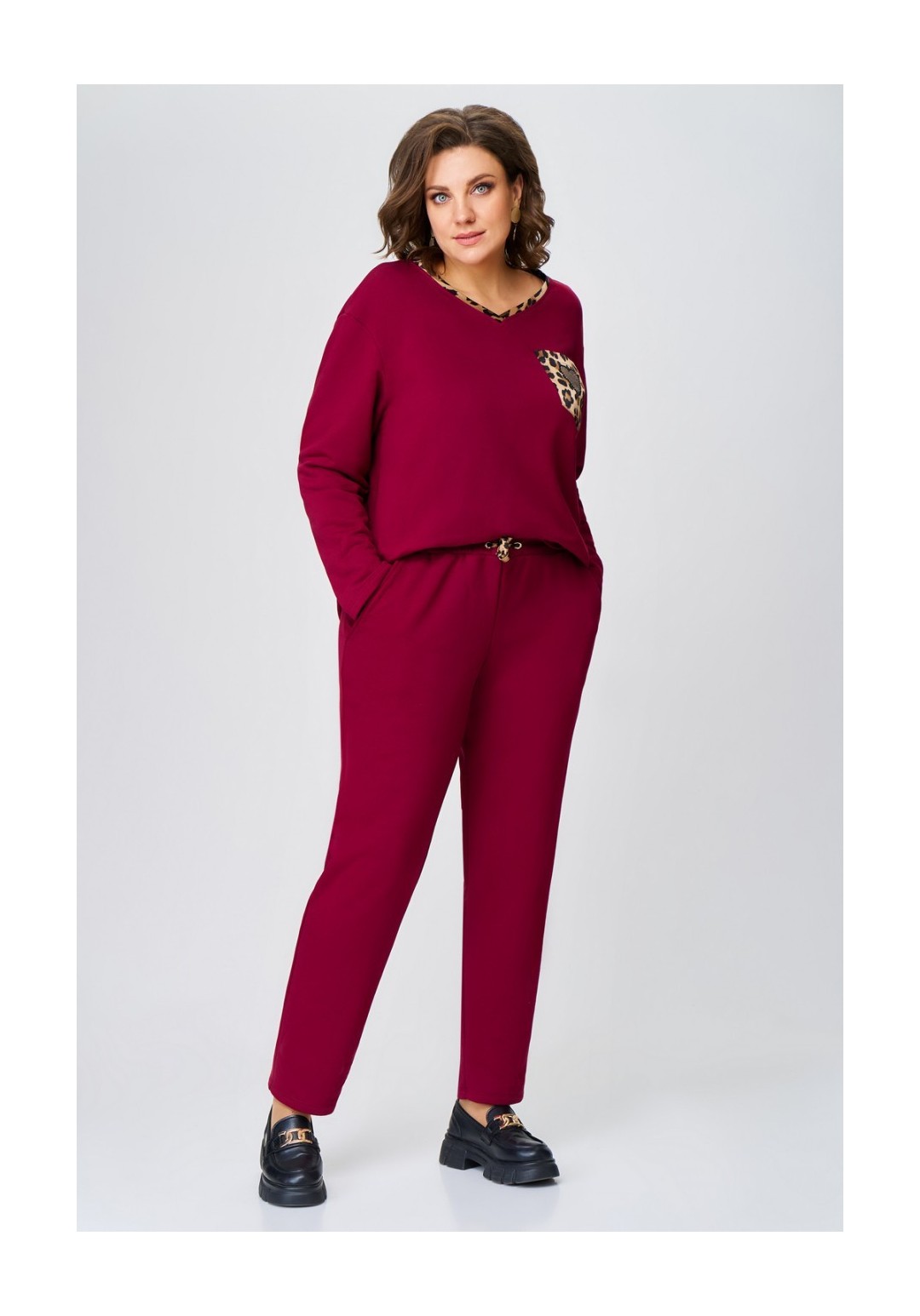 Костюм женский двухпредметный состоящий из джемпера и брюк. Джемпер прямого силуэта с втачным спущенным рукавом. По левой части переда накладной карман из отделочной ткани. Горловина обработана отделочной бейкой. Низ джемпера и рукавов обработаны на плоскошовной машине. Брюки слегка зауженные к низу. Верх брюк с притачным поясом на резинке с кулисой. Передние половинки брюк с косыми боковыми карманами, задние половинки с накладными карманами. Длина джемпера по спинке: 71 см Длина рукава: 60 см Длина брюк: 104 см