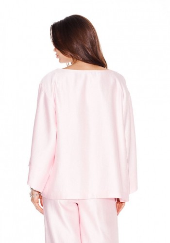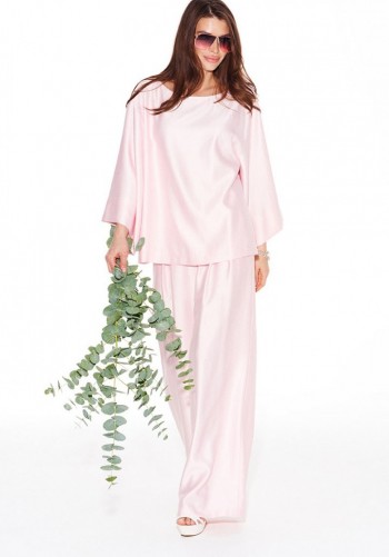 Костюм женский двухпредметный состоящий из блузы и брюк. Блуза свободного силуэта с втачным рукавом. По переду три декоративных молнии. Линии плеча слегка спущена. Низ блузы фигурный спинка длиннее переда. Брюки-кюлоты с запахом, свободной посадки, брючины широкие укороченные, чуть выше щиколотки. По передней половине брюк отделочная деталь которая имитирует юбку. Пояс брюк на резинке. Длина блузы по спинке: 65 см Длина рукава от горловины: 72 см Длина брюк: 90 см