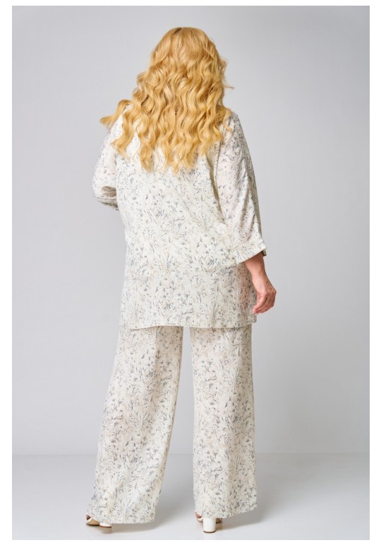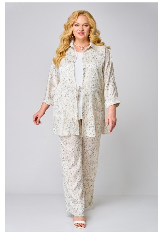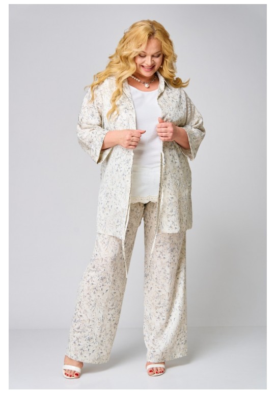 Комплект женский, состоящий из жакета, топа и брюк. Жакет прямого силуэта с цельнокроеным рукавом летучая мышь, без застежки. По горловине отложной воротник на стойке. В боковых швах обработаны разрезы. По низу рукавов отложная манжета. Топ полуприлегающего силуэта. Перед с вытачками по линии груди. В боковых швах разрезы. Горловина и проймы окантованы косой бейкой. Брюки свободного кроя. Верх брюк с притачным поясом на резинке. Длина топа по спинке: 66 см Длина жакета по спинке: 80 см Длина рукава от горловины: 62 см Длина брюк: 107 см