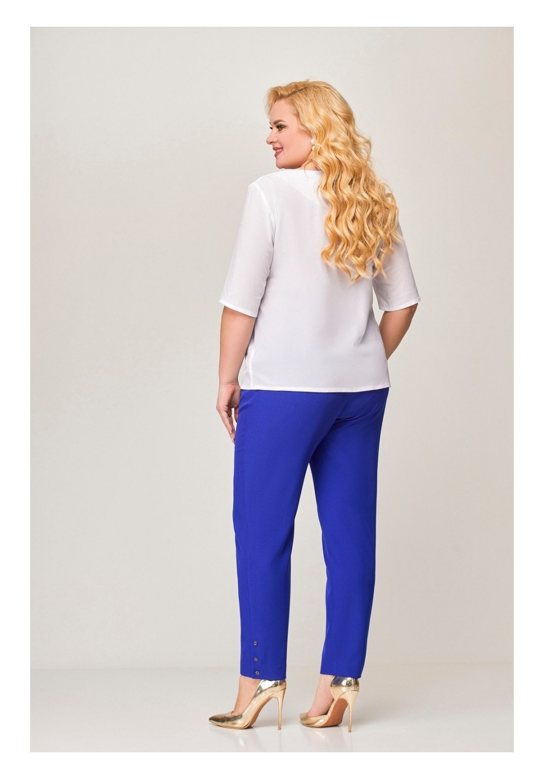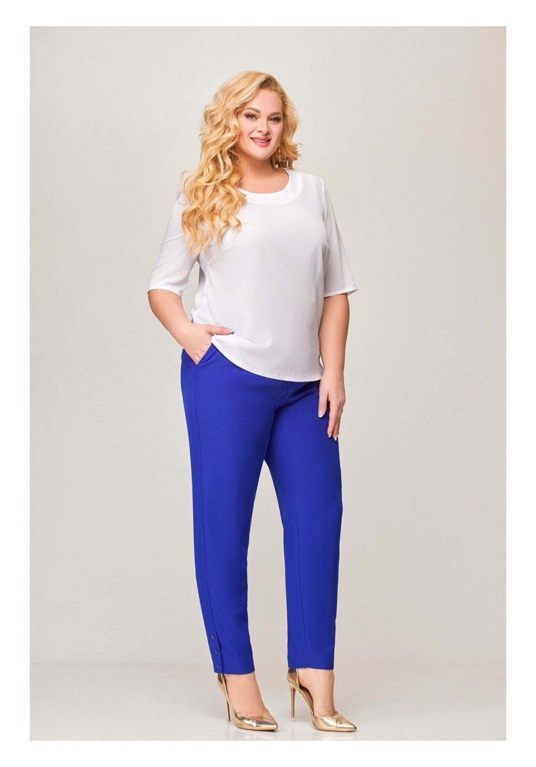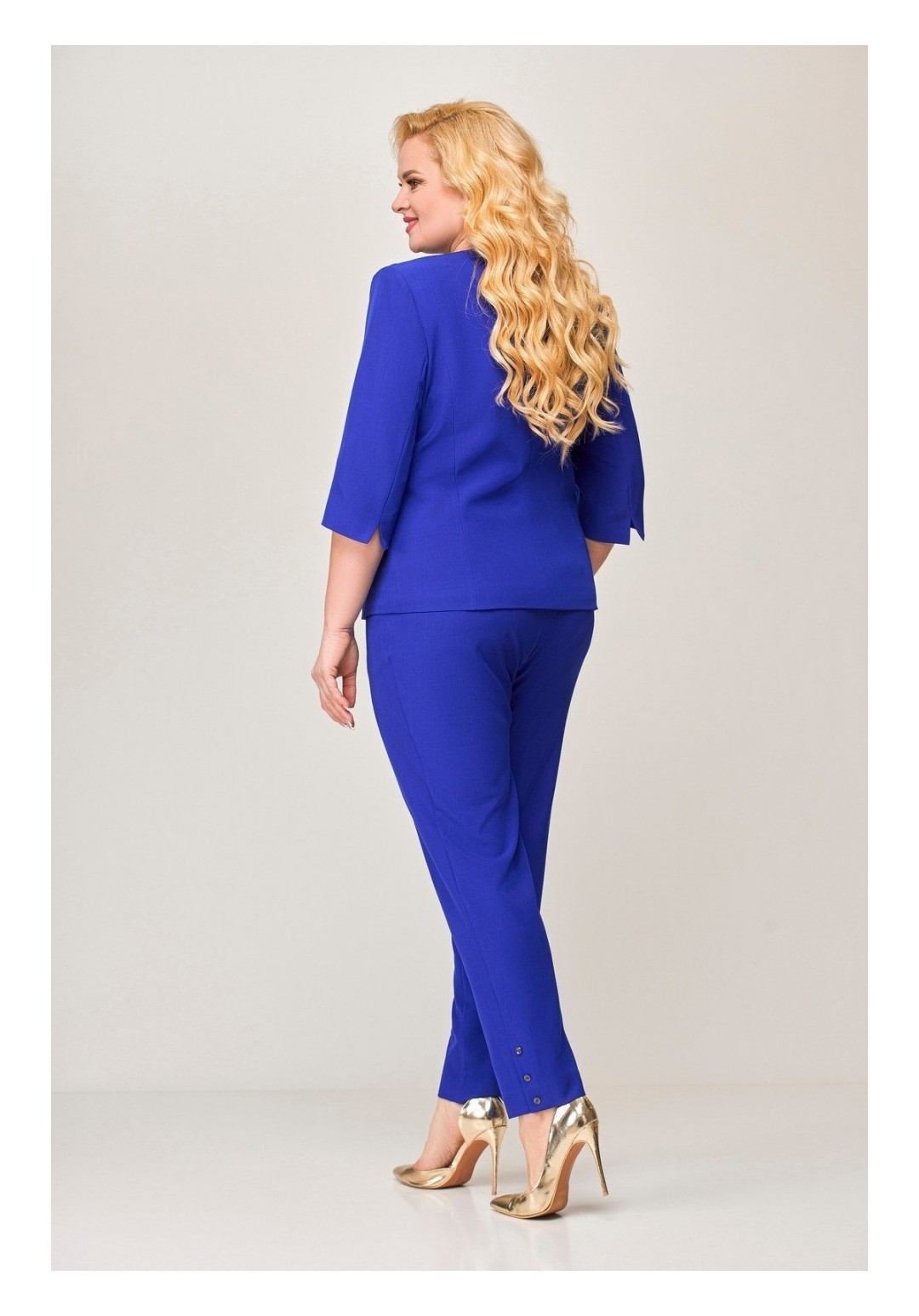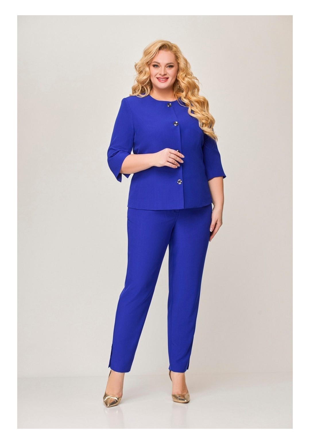 Комплект 2-х предметный, состоящий из жакета и брюк. Жакет и брюки выполнены из качественной костюмной ткани. Жакет однобортный на подкладке. По переду - рельефы, по спинке средний шов. Рукав втачной, двухшовный, длинной ¾, с небольшим разрезом по локтевому шву. Застежка на 4 петли и 4 декоративные пуговицы. Длина по спинке 61 (+/-1) см., длина рукава р-р 54-56 44 (+-/1) см, длина рукава р-р 58-60 47 (+-/1) см. Брюки прямые, слегка заужены к низу, по переду обработаны карманы с отрезными бочками. Пояс притачной с резинкой по спинке. По низу брюк в боковом шве обработана декоративная шлица, с 3-мя декоративными пуговицами. Длина от пояса до низа 99 см(+/-1) см.