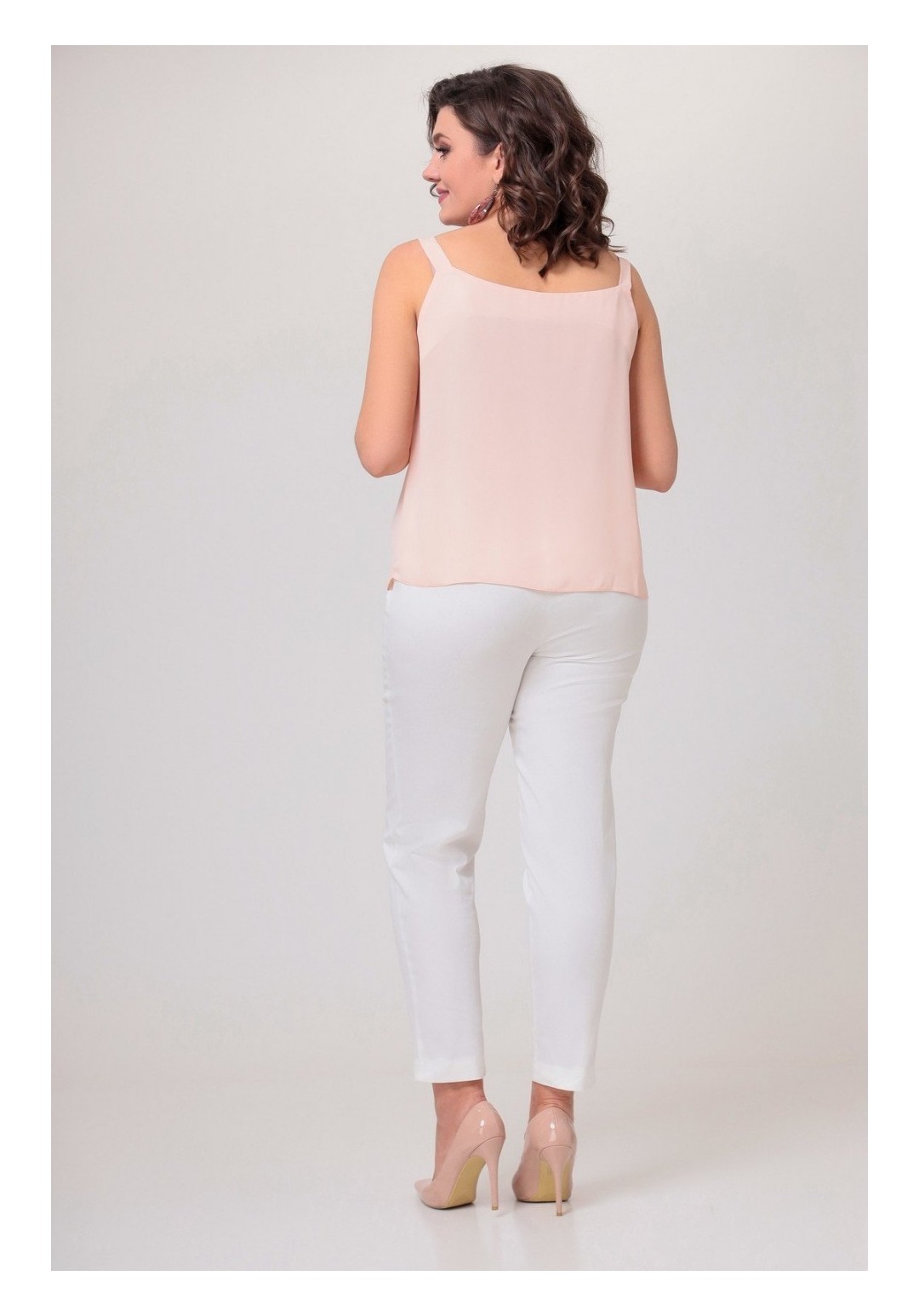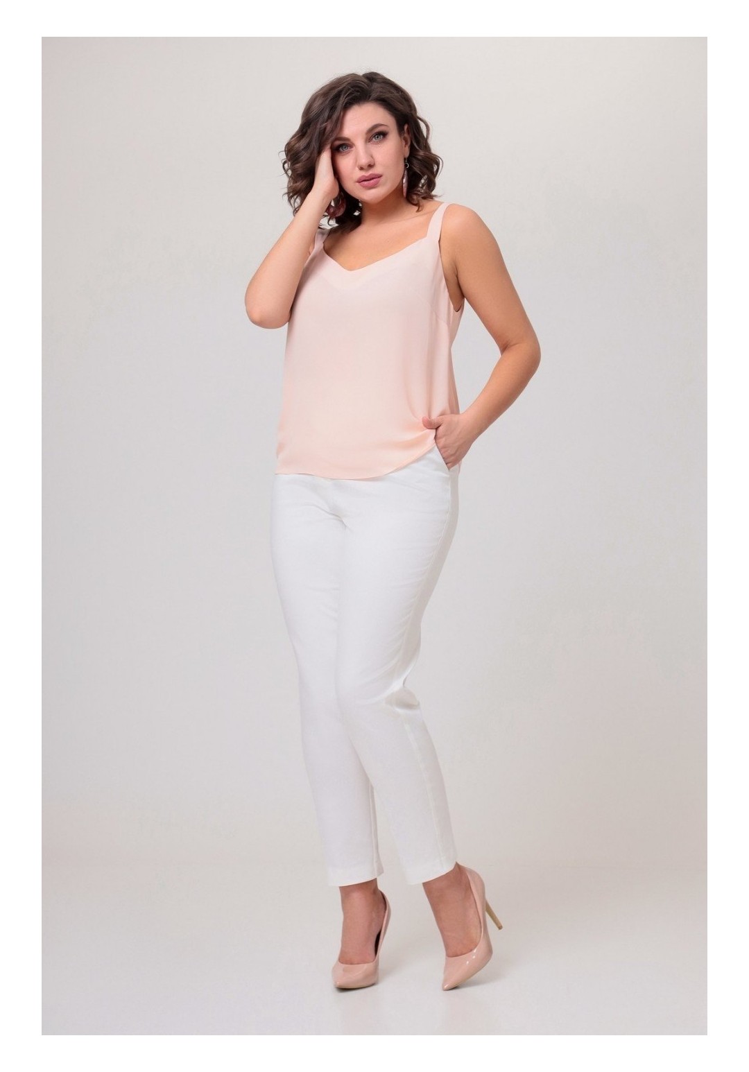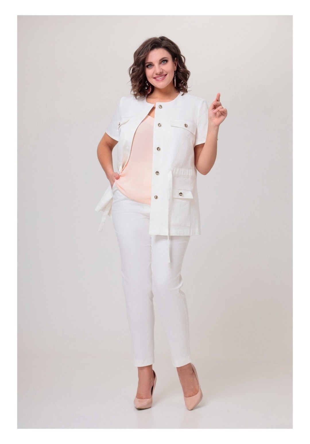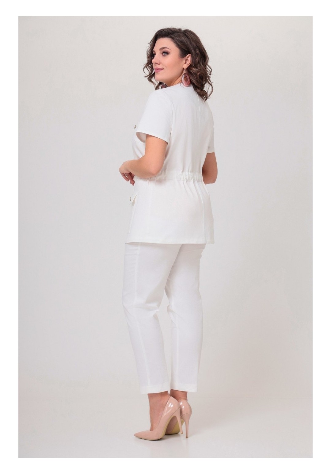 Костюм женский, состоит из жакета и брюк, выполнен из турецкого хлопка со стрейчем. Жакет прямого силуэта без подкладки, с центральной застёжкой на петли и металлические пуговицы. Полочка с нагрудными вытачками и настрачными клапанами в области груди, в области бёдер расположены накладные карманы с клапанами, застёгивающиеся на петлю и пуговицу. Спинка со средним швом. По линии талии расположена кулиса с завязывающимся поясом. Горловина круглая, рукав втачной, короткий. Длина жакета по среднему шву спинки в 52 размере-70 см. в 54-62 размерах -75см.(+/- 1 см) Длина рукава в 52 размере– 21 см. Длина рукава в 54-64 размерах -25см. Брюки прямые, зауженные к низу, верх брюк обработан притачным поясом с резинкой по спинке. По переду карманы с отрезными бочками. Застёжка на тесьму-молнию, петлю и металлическую пуговицу на поясе. Длина брюк по боковому шву (без учёта ширины пояса) - 94 см (+/-1см)