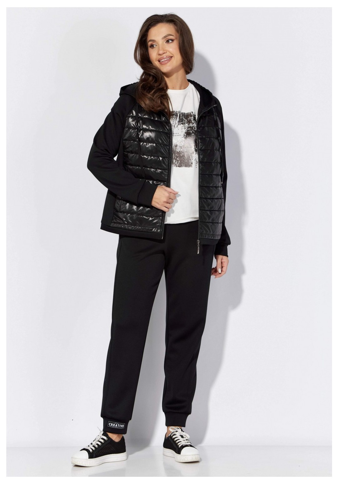 Комплект женский, 2х предметный, состоящий из куртки и брюк. Куртка полуприлегающего силуэта с длинным рукавом. Рукав реглан с манжетой по низу. На манжете декоративная нашивка. По переду и спинке отрезные бочки. Застежка центральная на молнию и карманы в рельефах. Горловина оформлена капюшоном со стойкой и кулисой по краю. По низу притачная , узкая планка. Центральные детали переда и спинки из стежки (плащевка на синтепоне) Брюки прямые, по низу на манжете, с декоративной нашивкой. По переду смещенные рельефные швы. Карманы в рельефах. Пояс цельнокроеный, с резинкой по кругу.