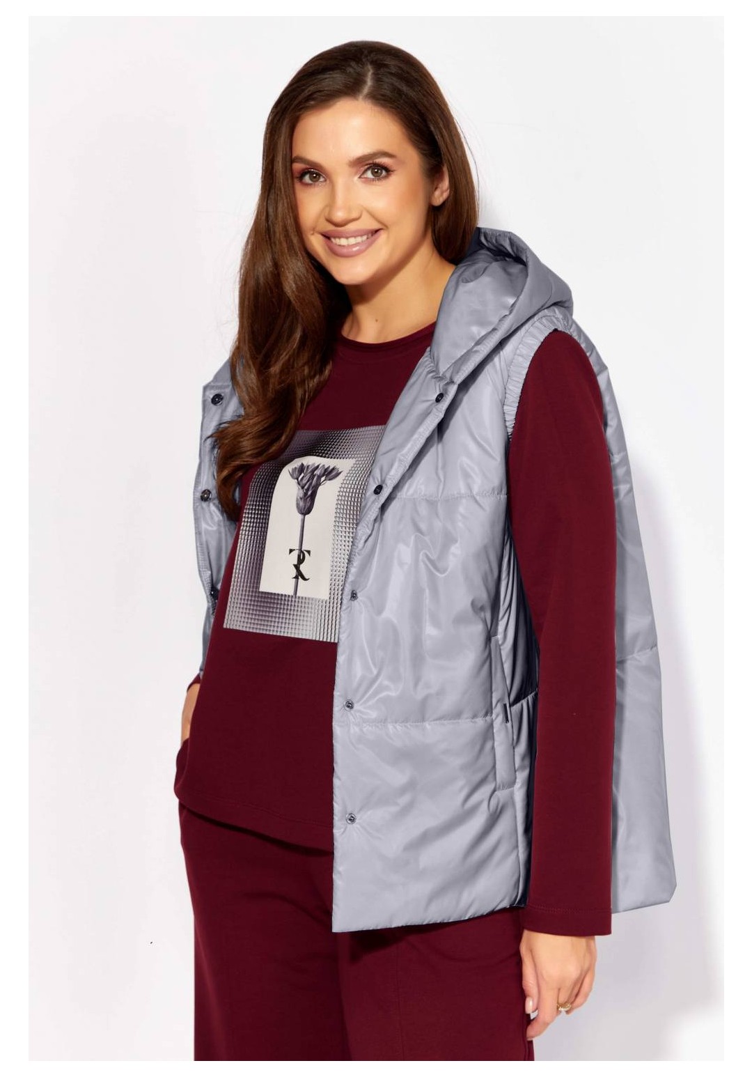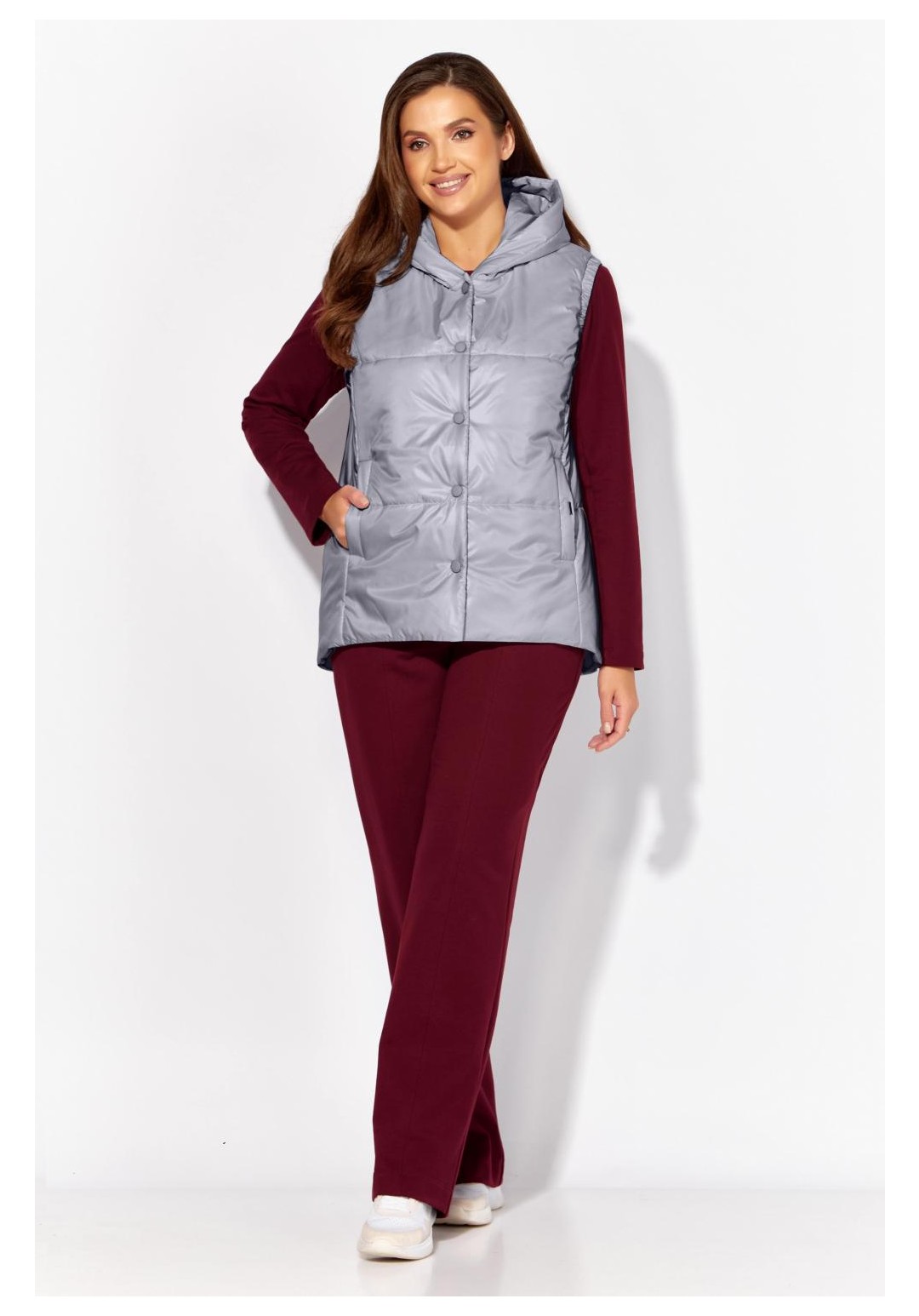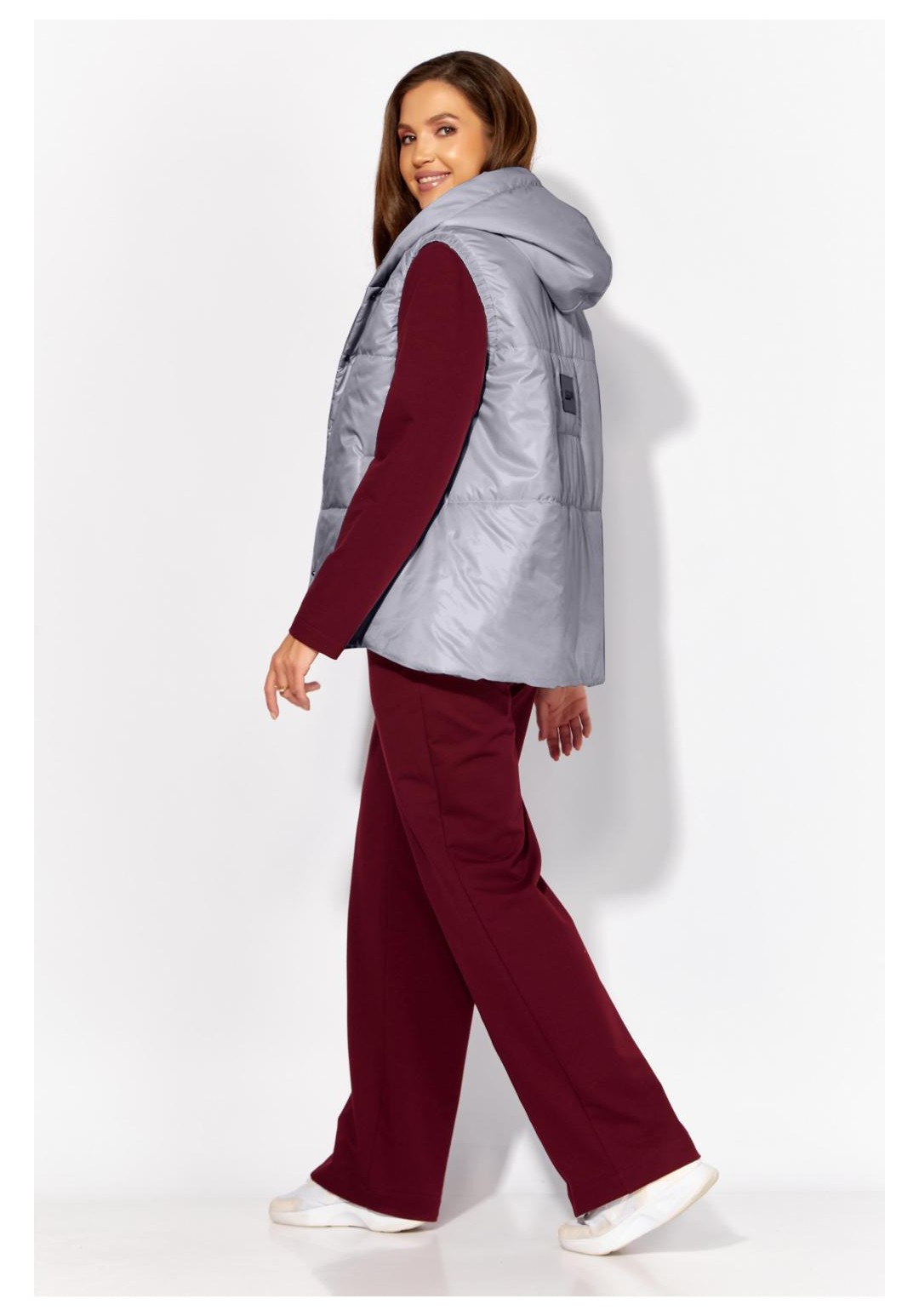 Комплект женский, 3х предметный, состоящий из жилета, свитшота и брюк. Жилет прямого силуэта, плащевка на синтепоне (VS-100), простеган широкими горизонтальными строчками, на подкладке. По переду рельефы и карманы с листочкой Застежка центральная на кнопки. Горловина оформлена капюшоном. На спинке отделочная деталь с нашивкой. Низ жилета сзади удлинён. Свитшот прямого силуэта с длинным втачным рукавом. Перед задекорирован принтом. Горловина круглой формы с подрезной бейкой с открытым краем. Брюки прямые с наклонными карманами. По центру передних деталей рельефы с отделочными строчками. Пояс притачной, по переду гладкий, дальше на резинке по кругу.