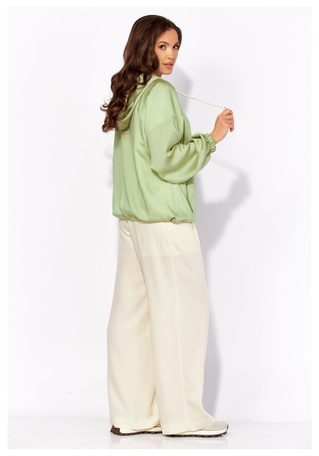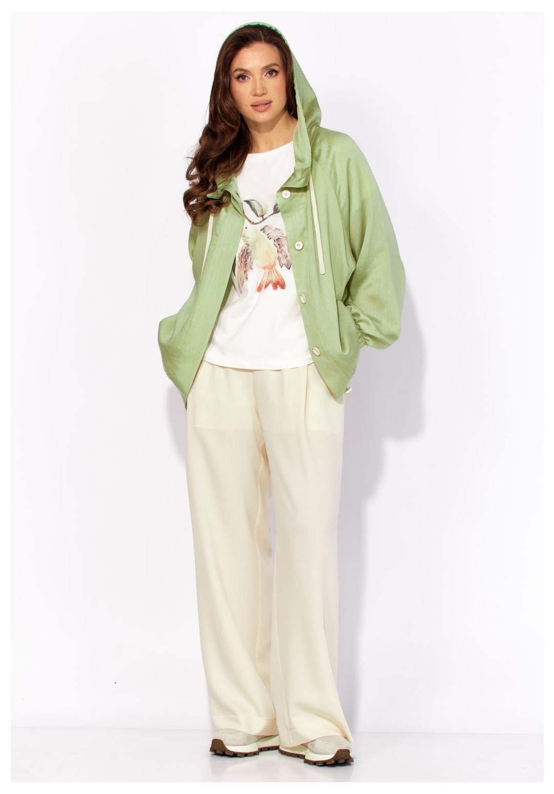 Комплект женский, 3х предметный, состоящий из куртки брюк и топа. Куртка-парка, облегченная, без подкладки, прямого силуэта. Рукав реглан, длинный, по низу на резинке. Горловина оформлена капюшоном с кулисой. По переду карманы в рельефах. Застежка центральная, потайная, на петли и пуговицы. Низ куртки регулируется кулисой с фиксатором по бокам. Спинка без особенностей. Топ из трикотажного хлопкового полотна, прямого силуэта с коротким цельнокройным рукавом. Горловина круглая, с подрезной планкой. Перед задекорирован принтом. Брюки прямые, широкие. По переду наклонные карманы и ягкие складки. Пояс притачной, по центру гладкий, дальше с резиной. В брюках подкладка (шорты).