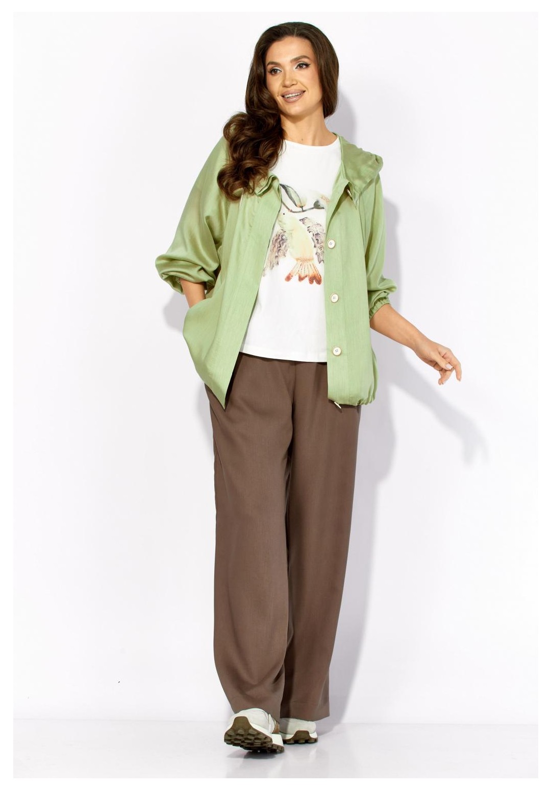 Комплект женский, 3х предметный, состоящий из куртки брюк и топа. Куртка-парка, облегченная, без подкладки, прямого силуэта. Рукав реглан, длинный, по низу на резинке. Горловина оформлена капюшоном с кулисой. По переду карманы в рельефах. Застежка центральная, потайная, на петли и пуговицы. Низ куртки регулируется кулисой с фиксатором по бокам. Спинка без особенностей. Топ из трикотажного хлопкового полотна, прямого силуэта с коротким цельнокройным рукавом. Горловина круглая, с подрезной планкой. Перед задекорирован принтом. Брюки прямые, широкие. По переду наклонные карманы и ягкие складки. Пояс притачной, по центру гладкий, дальше с резиной. В брюках подкладка (шорты).