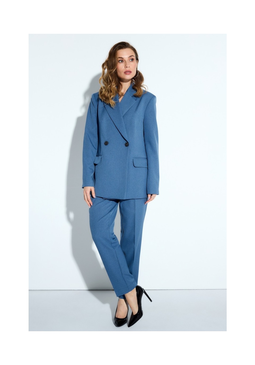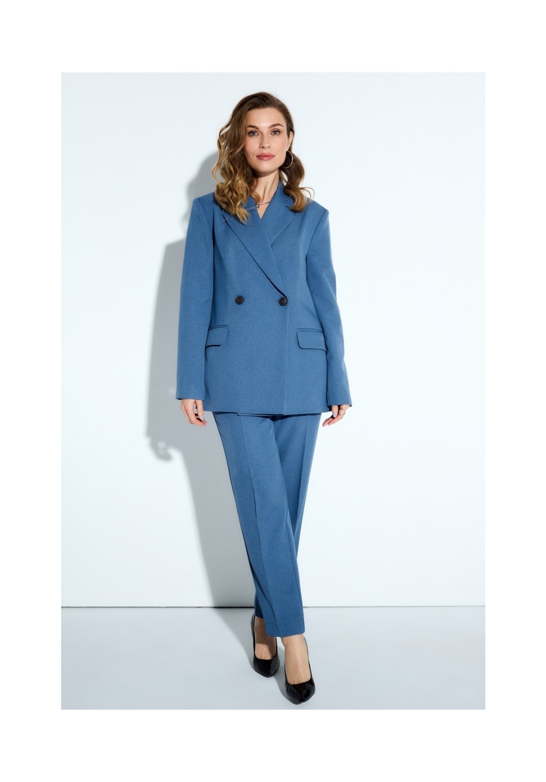 Костюм-двойка из жакета и брюк. Жакет прямого силуэта из костюмной ткани. Пиджачный воротник, двубортная застежка на пуговицы, отрезной бочек, карманы с клапанами, длинный втачной рукав. Спинка со шлицей. Жакет на подкладке. Брюки прямые с высокой посадкой, с заутюженными складками, зауженные к низу. На передней половине наклонных карманов с листочками. Вверху брюки на притачном поясе, по бокам вставлена резинка, застежка на молнию и пуговицу. Подходит на рост 164-170 см. Длина жакета 72 см. Длина рукава 61 см. Длина брюк 96 см.