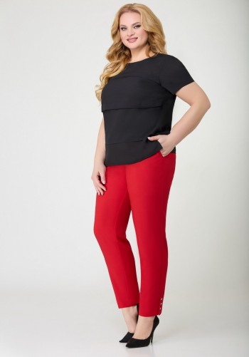Комплект женский из двух предметов: жакет и брюки. Жакет полуприлегающего силуэта, застегивается на пуговицы. В шве стачивания боковых и нижних частей расположены карманы. Рукава двухшовные. Брюки классические, на молнии.