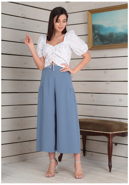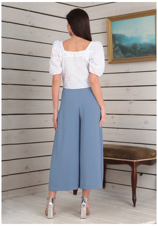 Комплект из двух предметов: блузка и кюлоты. Легкая блузка из хлопка с вышивкой. Горловина частично присборена на резинку. Рукава втачные, короткие, собранные на резинку но низу. По центру блузки кулиса с завязками для регулировки сборки. Кюлоты из легкой струящейся ткани с эффектом «креш» на притачном поясе. По бокам подрез со сборкой. На поясе обработаны шлевки для продевания пояса. Застежка по поясу на пуговицы и молнию. Длина блузки - 43 см, длина кюлот - 92 см.