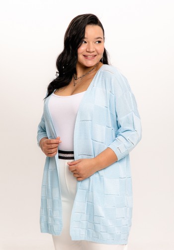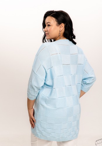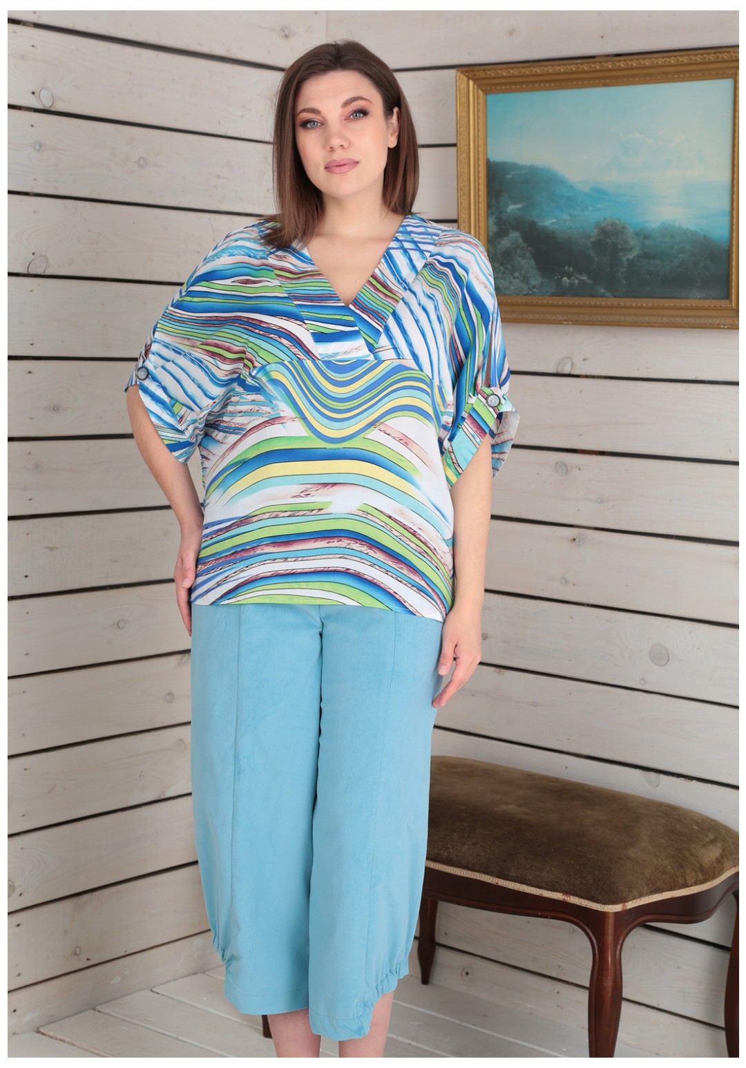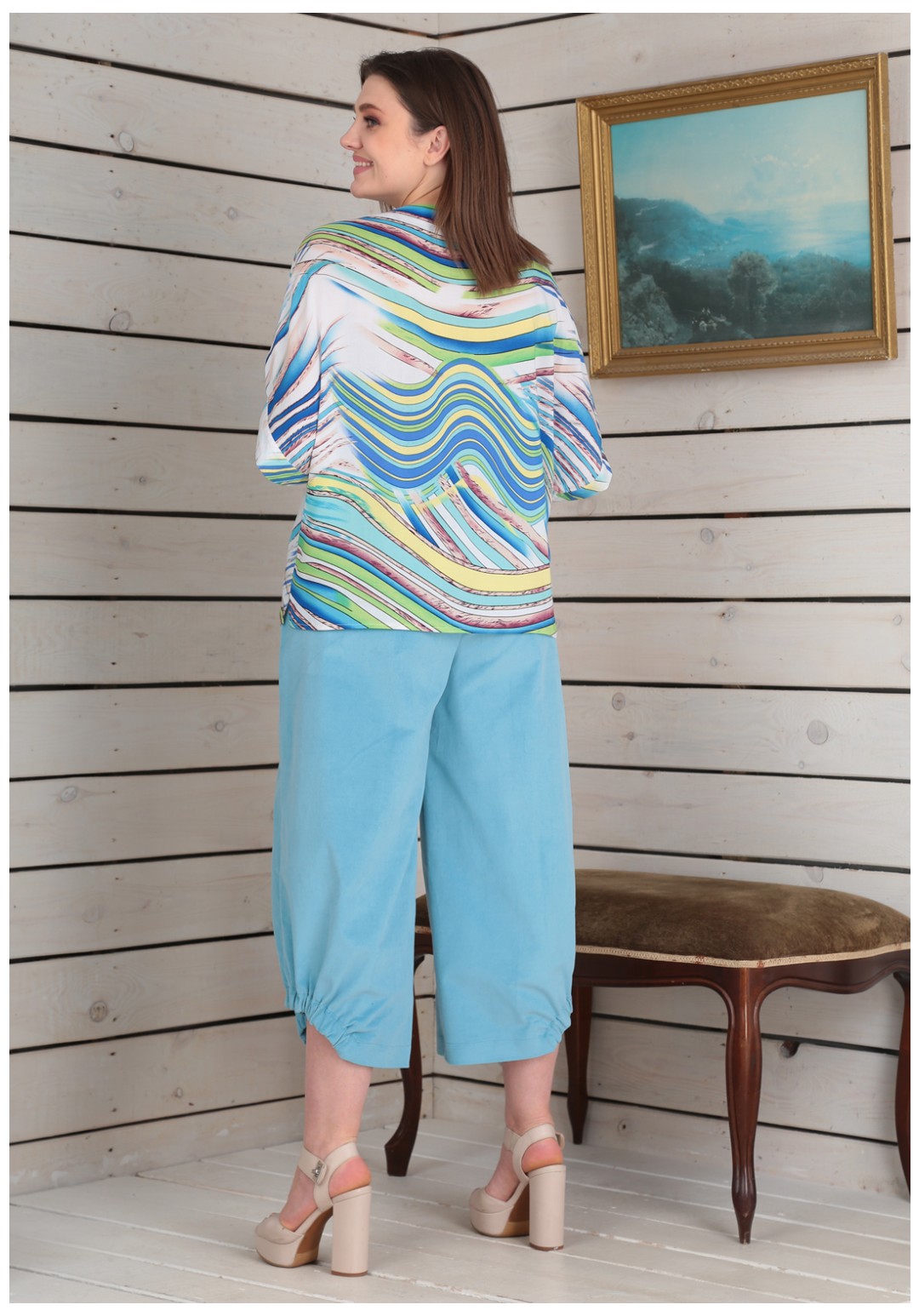Комплект из двух предметов: блуза и капри. Легкая блуза из вискозной ткани с оригинальным дизайном свободного силуэта. Перед с отрезной кокеткой. Рукава цельнокроеные длиной до локтя с притачными манжетами и застежкой на пуговицу. Штруксовые капри свободного кроя с притачным поясом на резинке. Низ разной длины и частично собран на резинку. Передние части брюк с карманами. Длина блузы - 68 см, длина брюк - 92 см.