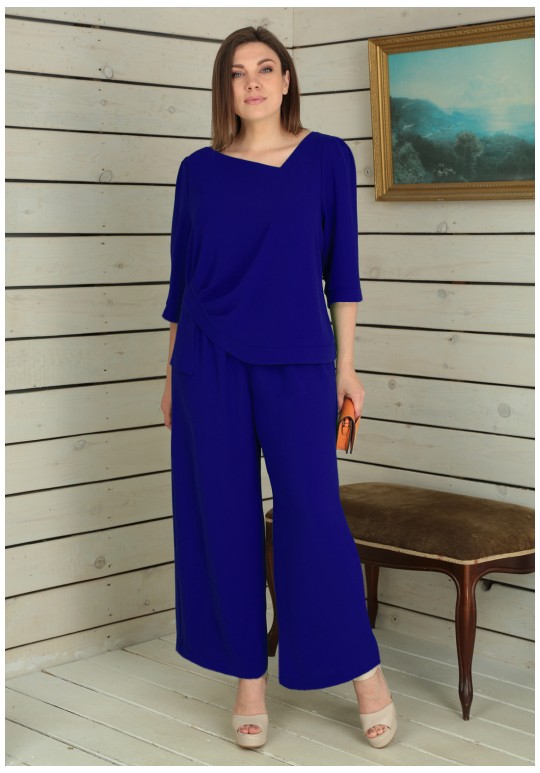 Костюм из двух предметов: блуза и брюки. Струящаяся блуза прямого силуэта с ассиметричным V-образным вырезом горловины. Рукава втачные с небольшой сборкой по окату и притачными манжетами по низу с разрезом. Перед с ассиметричным низом , отрезной планкой и сборкой по правой стороне. Брюки прямого силуэта на притачном поясе с резинкой. Длина блузы - 65 см, длина брюк - 102 см.