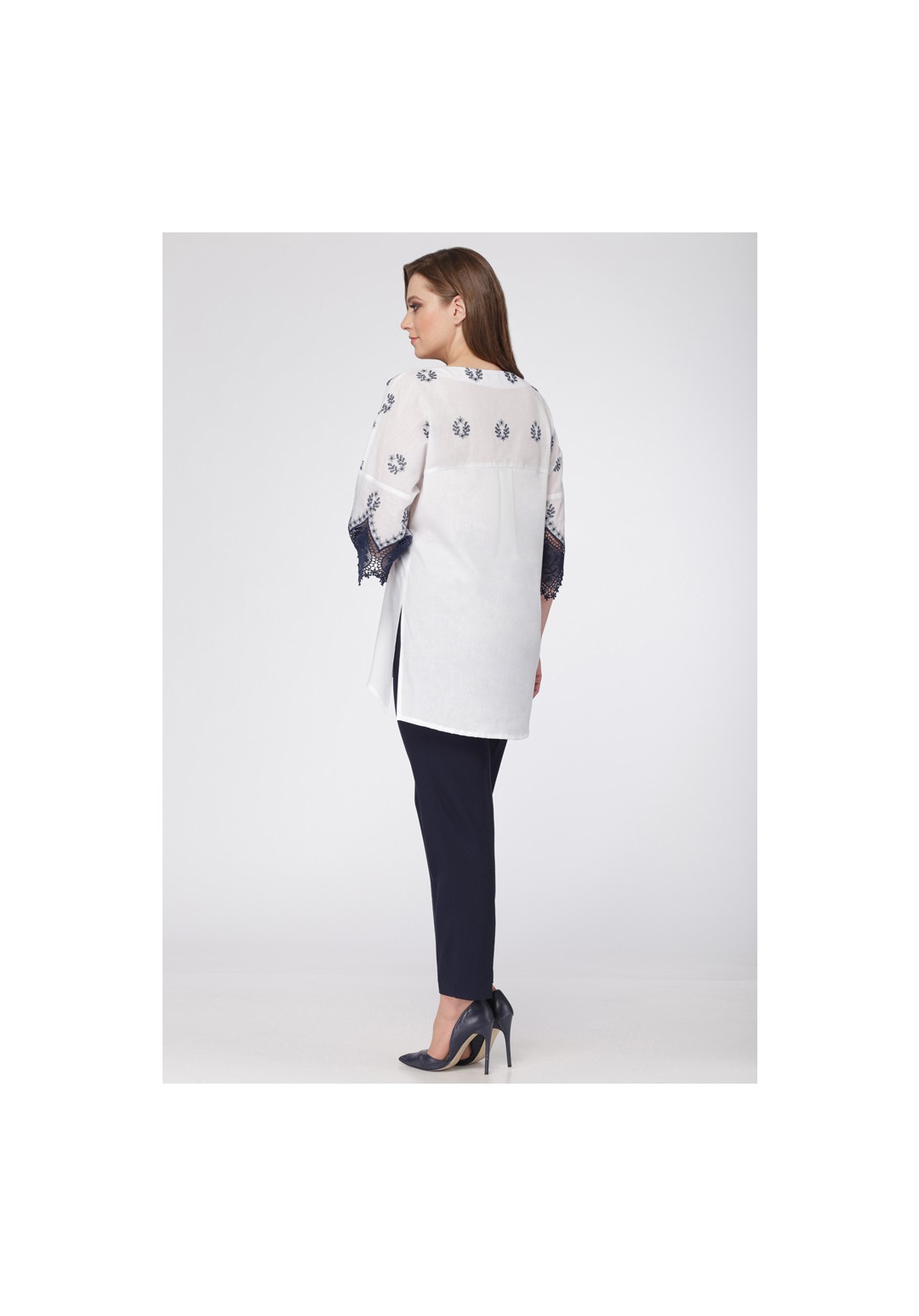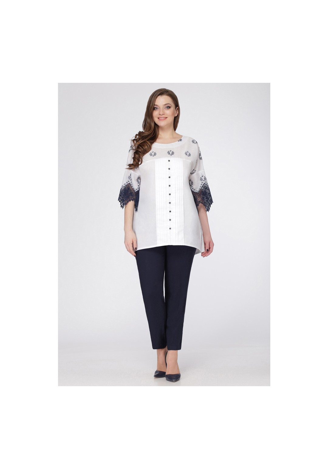 Блузка прямого силуэта с цельнокроенным рукавом и боковыми разрезами. Брюки зауженные с высокой посадкой, с притачным поясом на резинке.