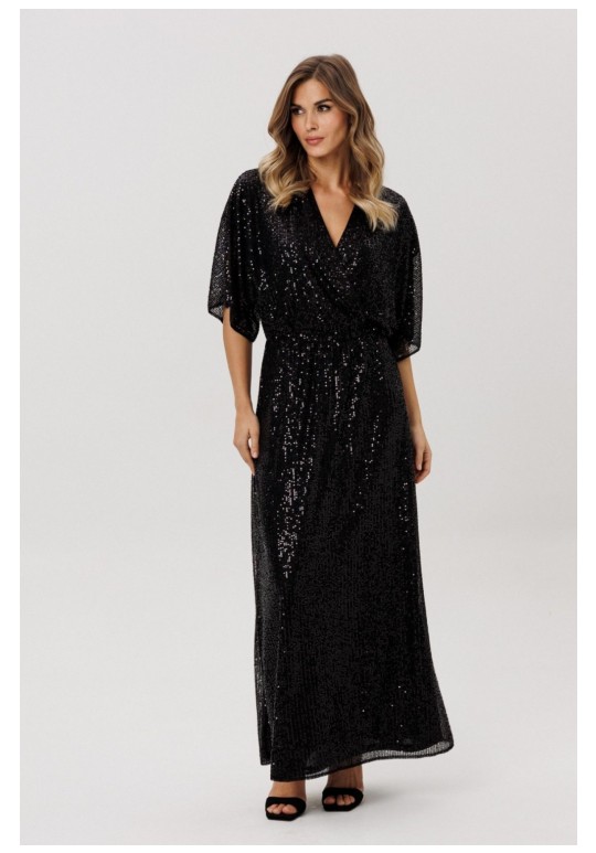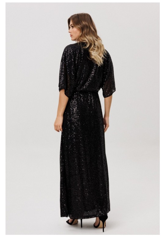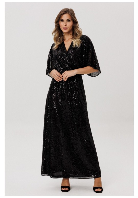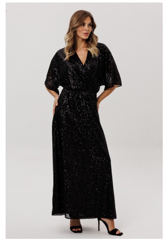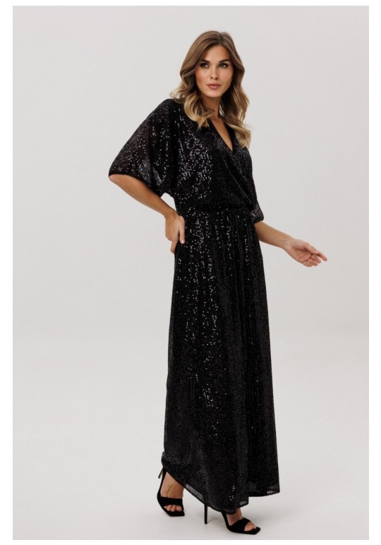 Платье выполнено из трикотажного полотна в пайетки. Платье X-образного силуэта, длиной миди, отрезное по линии талии. Лиф покроя кимоно. Перед выполнен на запах. Горловина V-образной формы. Переднее и заднее полотнище цельные и расширенные к низу. По линии талии эластичная тесьма. Платье на отлетной по низу трикотажной подкладке. Длина платья: р. 44-48 - 144 см, р. 50-54 - 145,5 см. Длина рукава: р. 44-48 - 46 см, р. 50-54 - 47,5 см.
