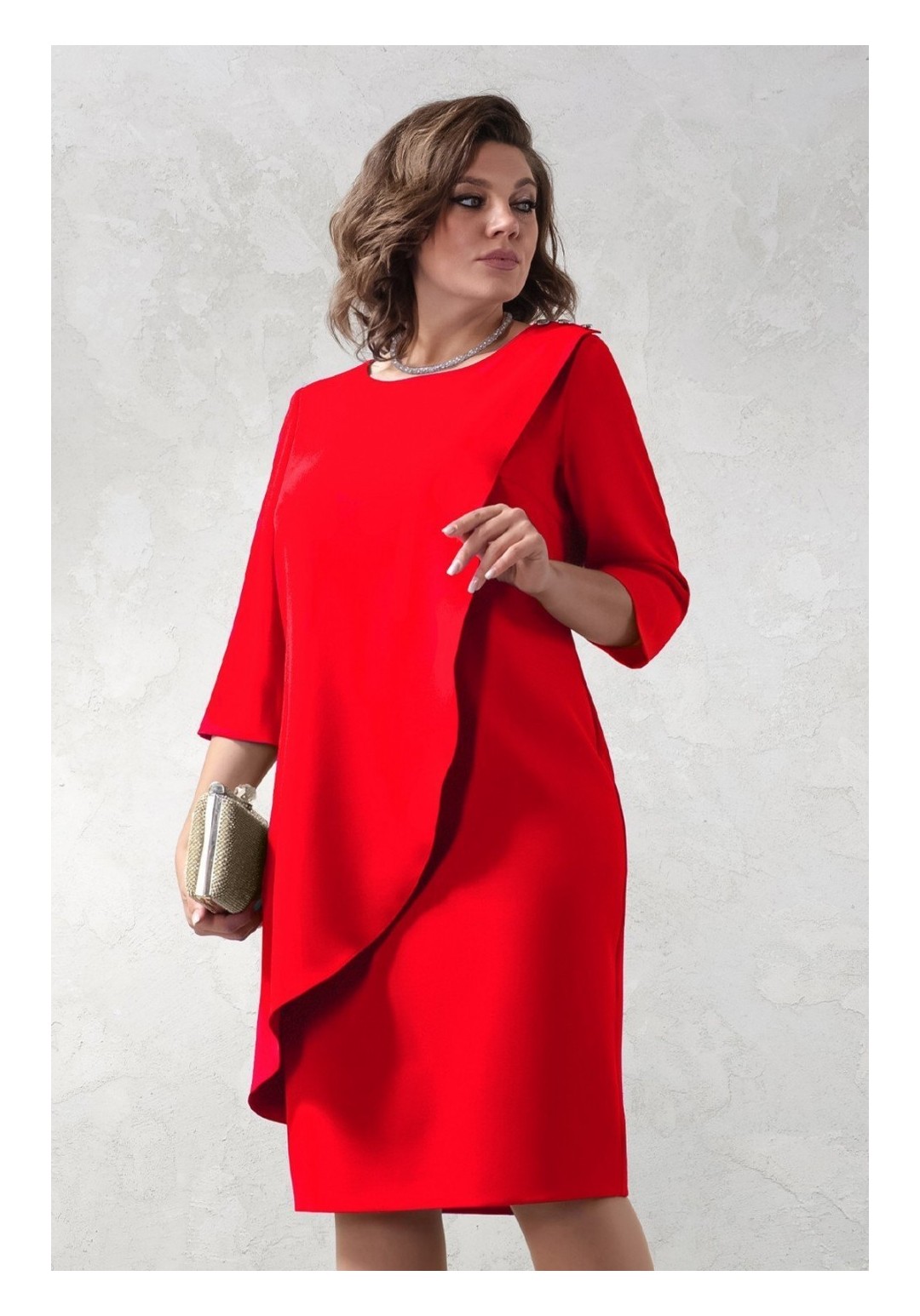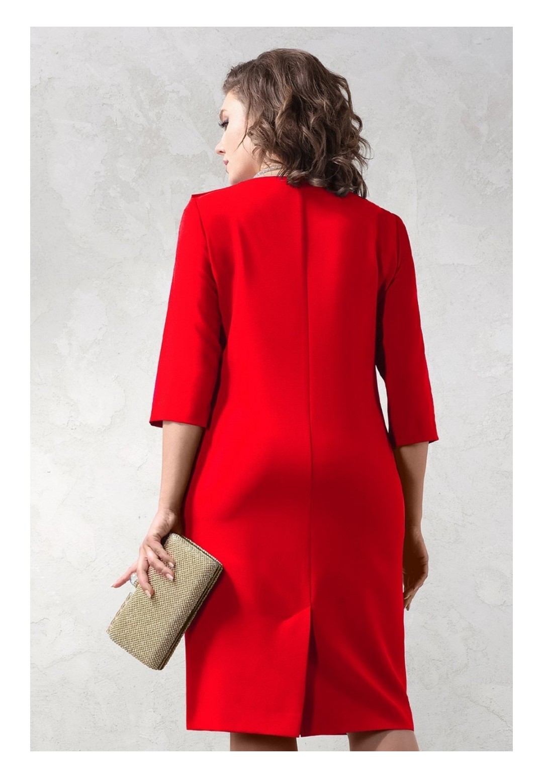 Вечернее платье полуприлегающего силуэта. Ткань костюмно-плательная, немного тянется. На переде отлетная деталь. В среднем шве спинки шлица. Длина 103 см, рукав 44 см.