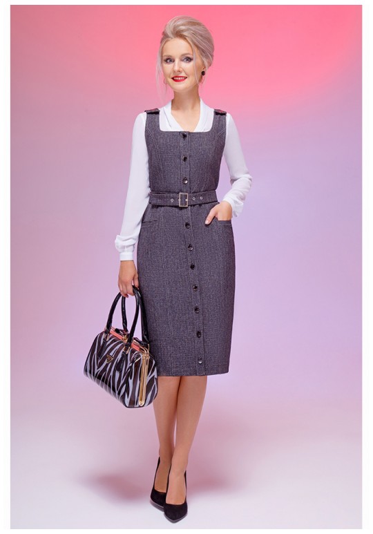 Сарафан женский выполнен из плательной ткани полуприлегающего силуэта. Сарафан с отрезными бочками по переду и спинке. Переду изделия имеются прорезные карманы, на плечах регулирующийся пуговицей паты. По переду сарафана застежка-планка на петлю-пуговицу. По спинке изделия имеется шлица. Также в комплектацию входит съемный пояс с пряжкой.