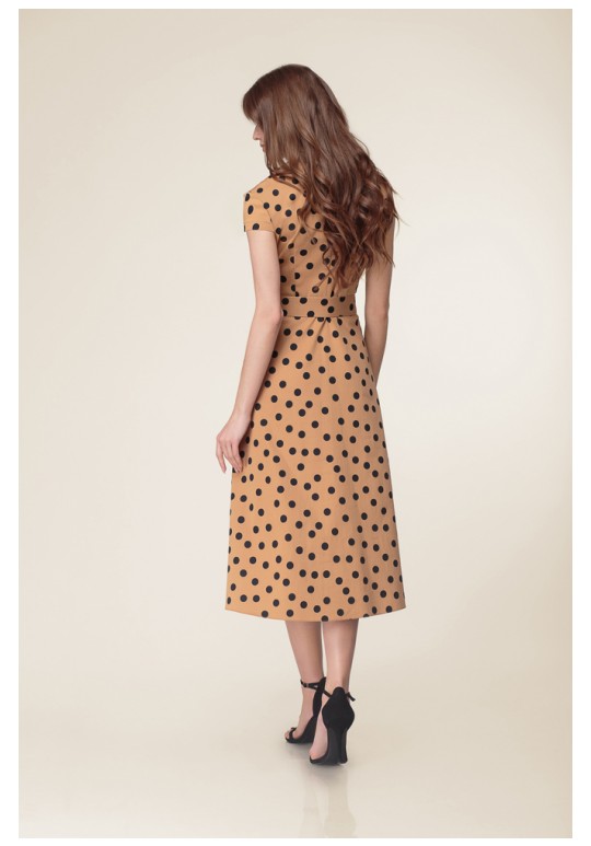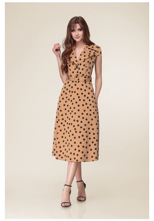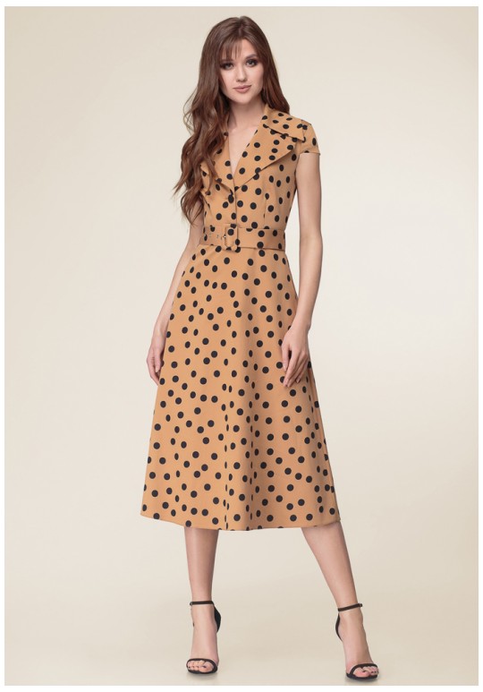Платье отрезное по линии талии, прилегающее в верхней части и А-образное в нижней. Верхняя часть с центральной бортовой застёжкой на петли и пуговицы, пиджачным воротником и талиевыми вытачками. По спинке также талиевые вытачки и средний шов. В боковых швах расположены карманы. В левом боковом шве застёжка на потайную молнию. Рукав - крылышко. К изделию прилагается пояс из ткани с пряжкой обтянутой той же тканью.