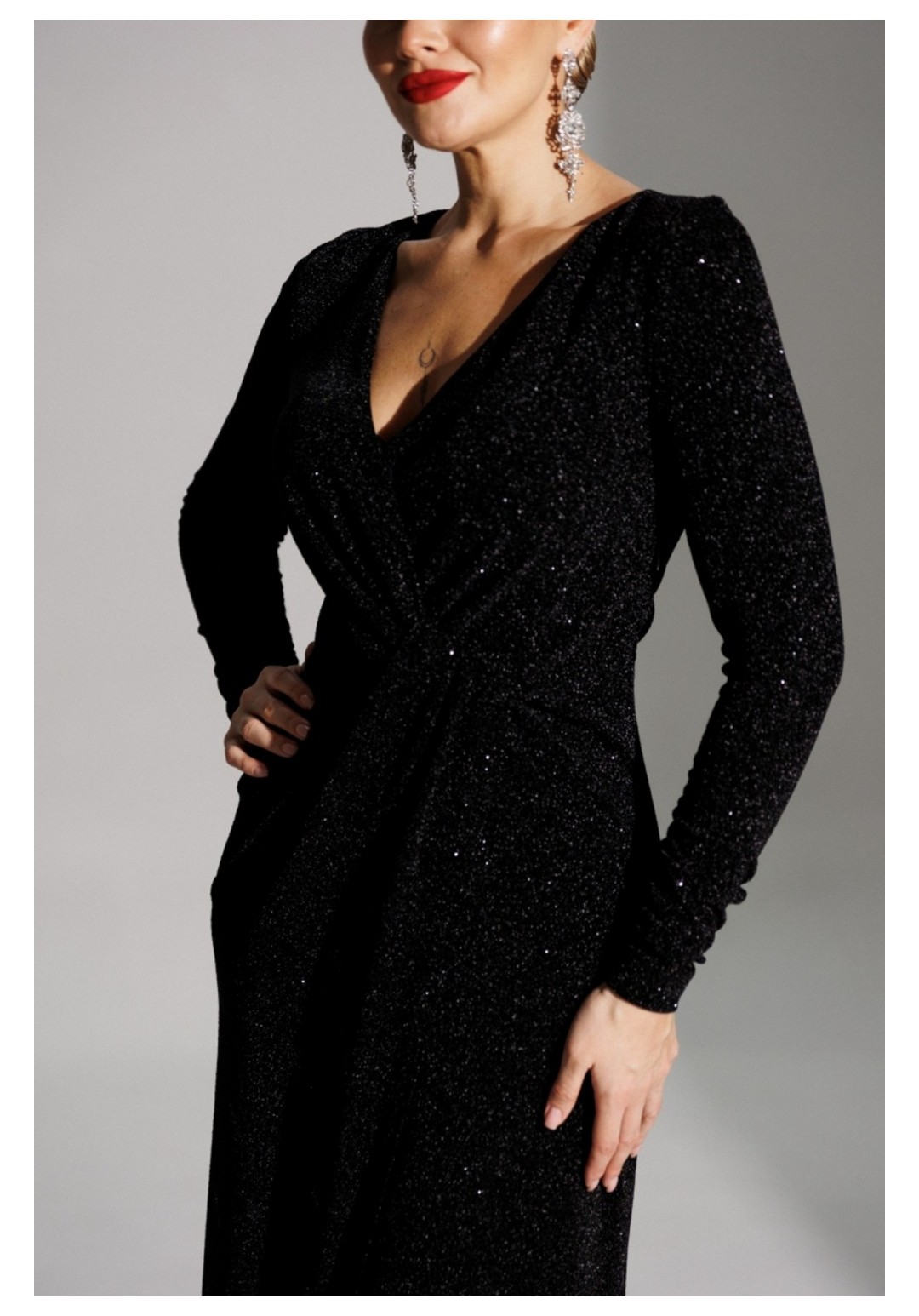 Блеск софитов, огни салютов, игривые пузырьки в бокале - и Ваше сияние обеспечено нашим вечерним платьем! Это действительно озорно, игриво, празднично! И, как ни крути, приковывает взгляды! Представленное платье приталенного силуэта. Спинка с талиевыми вытачками. Перед отрезной по линии талии. Лиф с эффектным V-образным вырезом и узлом в области талии. Юбка на запах. Рукав полуреглан, присборенный на резинку в нижней части (по шву). Платье на подкладке. Материал платья - тонкий трикотаж с блеском. Хорошо тянется. длина рукава (полуреглан): 68 см длина спинки: 143 см