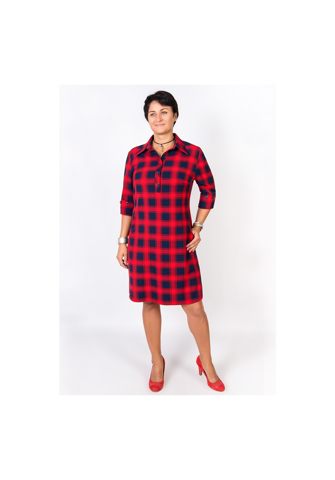 Платье женское прямого силуэта. Воротник рубашечный, застежка - центральная планка на петли и пуговицы. В боковых швах карманы, внизу платья - шлицы.