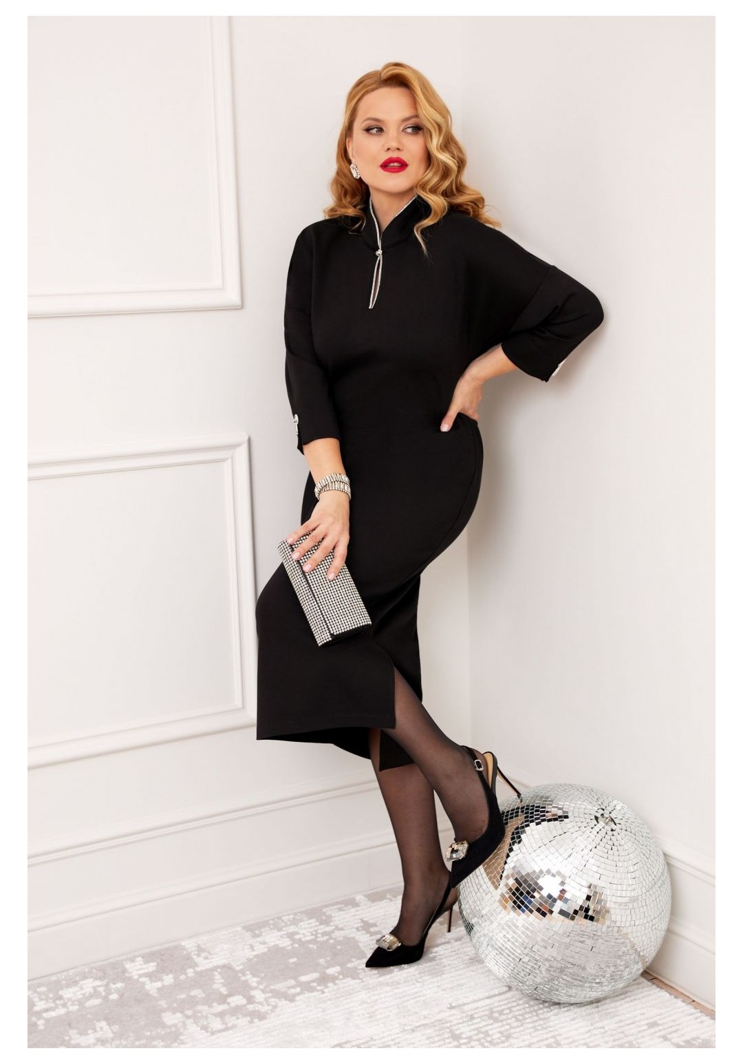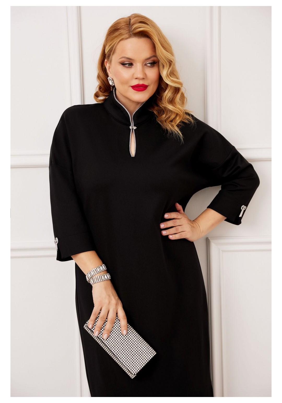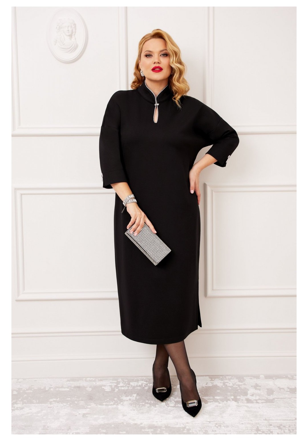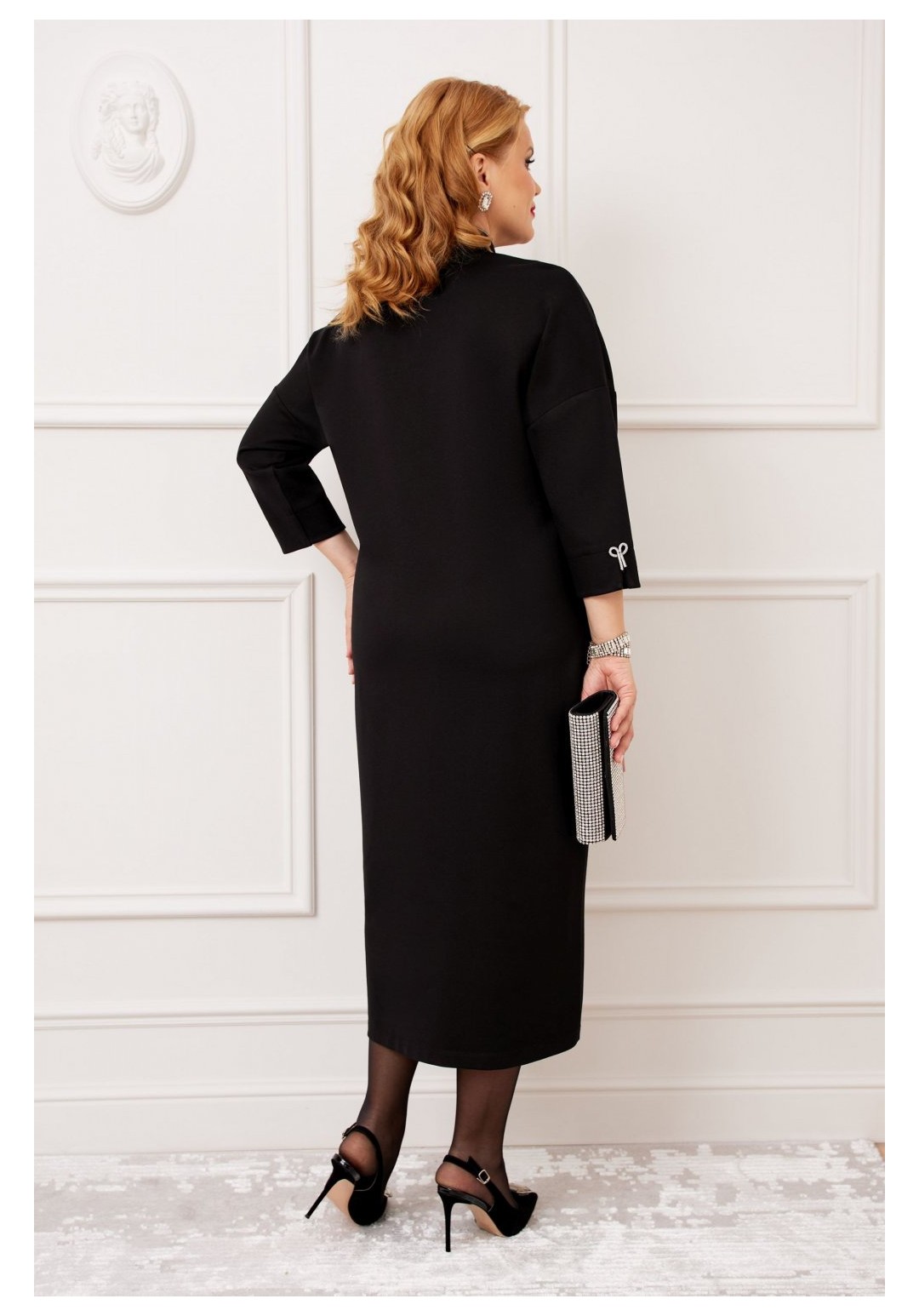 Элегантное и нарядное платье, выполнено из высококачественной трикотажной ткани (ткань мягкая, приятная к телу, хорошо тянется). Горловина стойка с вырезом-капелькой и отделкой из блестящего канта с застежкой дизайнерской брошью, придает модели особый шарм. Рукав втачной, спущенный с манжетой и пришивным декором в виде бантика. Платье с левого бока по низу с небольшим разрезом. Модель стильная и практичная, невероятно стройнит, прекрасно подойдет для торжественного мероприятия, вы будете выглядеть неотразимо и роскошно.