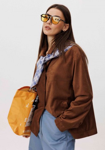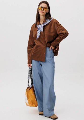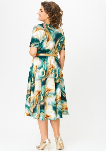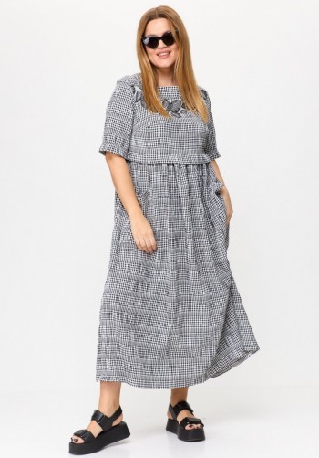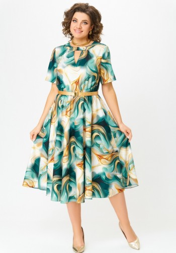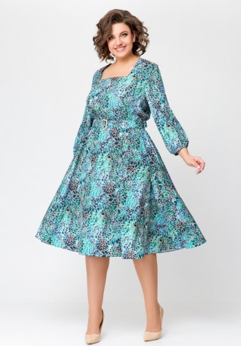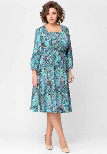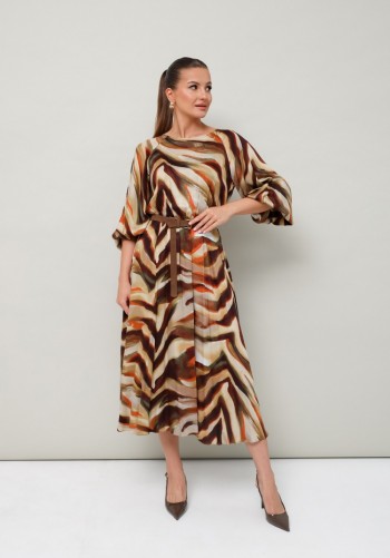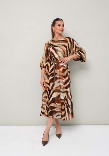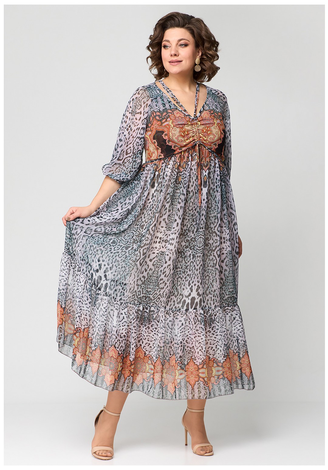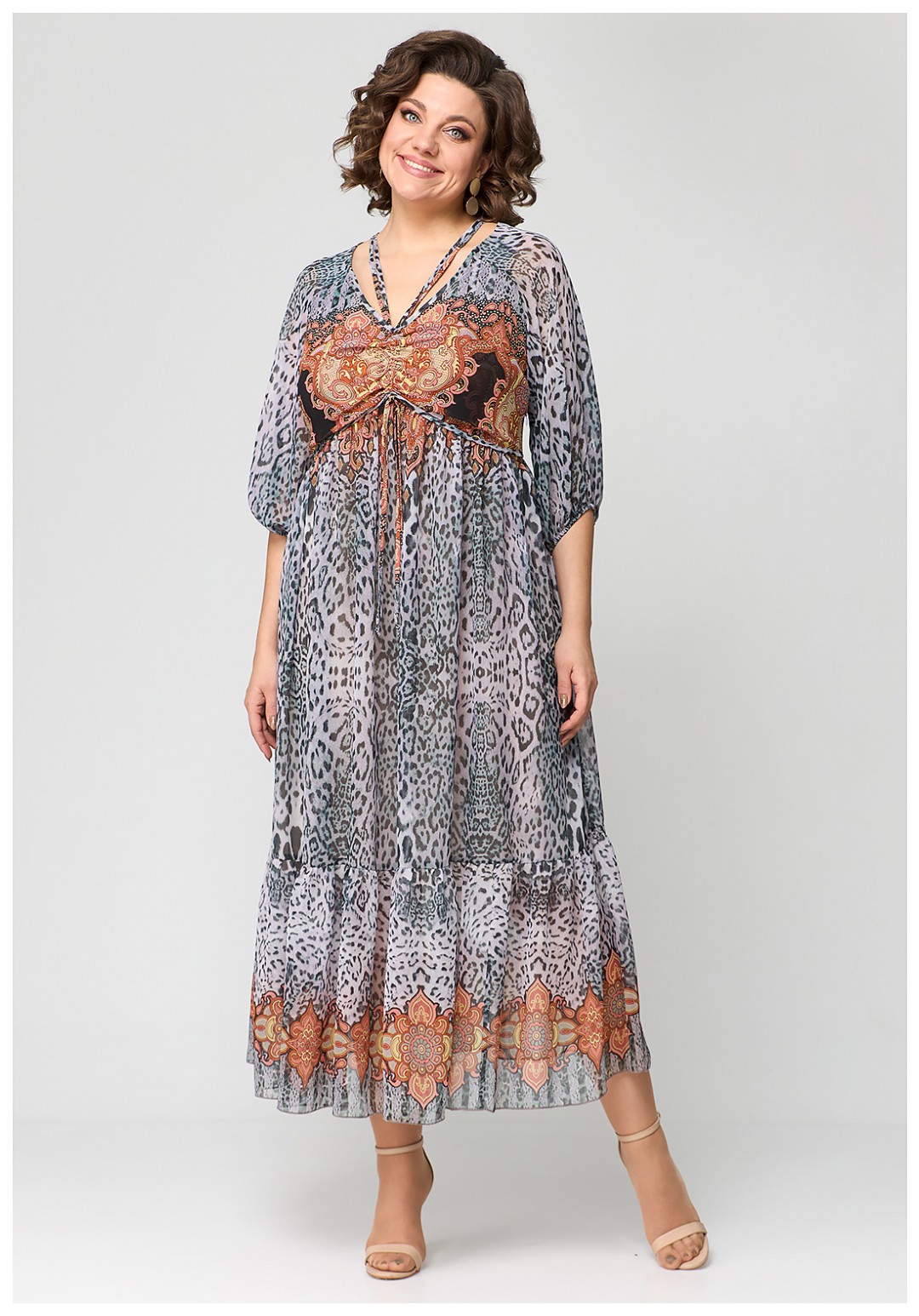 Платье свободного силуэта, длиной макси, выполнено из шифона с набивным рисунком. Платье с отрезным лифом. Полочка лифа двухслойная, нижняя часть с нагрудными вытачками и фигурным подрезом. Верхняя часть с кулисой по центру, через которую продеты шнуры. Спинка лифа с талиевыми вытачками. Рукав формы реглан, одношовный, длиной за локоть. По низу рукав на резинке. Юбка платья со сборкой по шву притачивания к лифу и притачным воланом со сборкой по низу юбки.