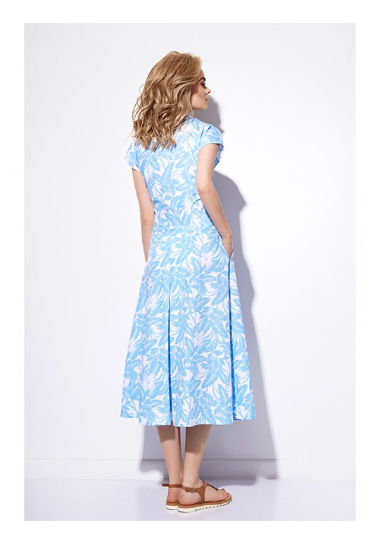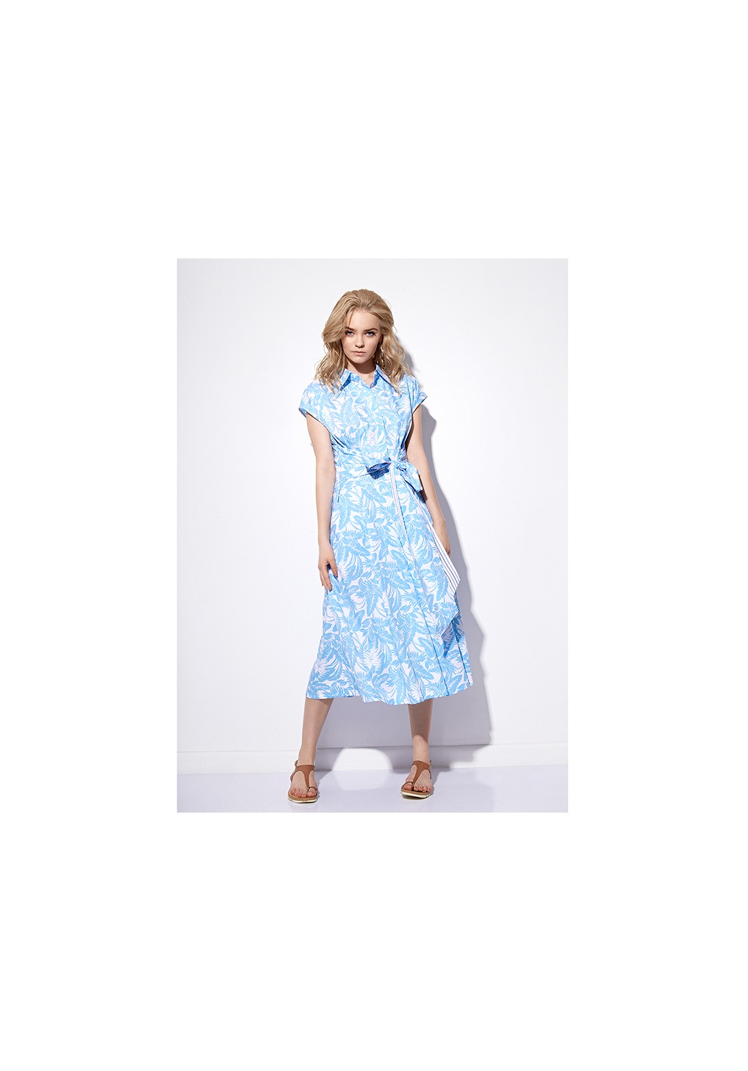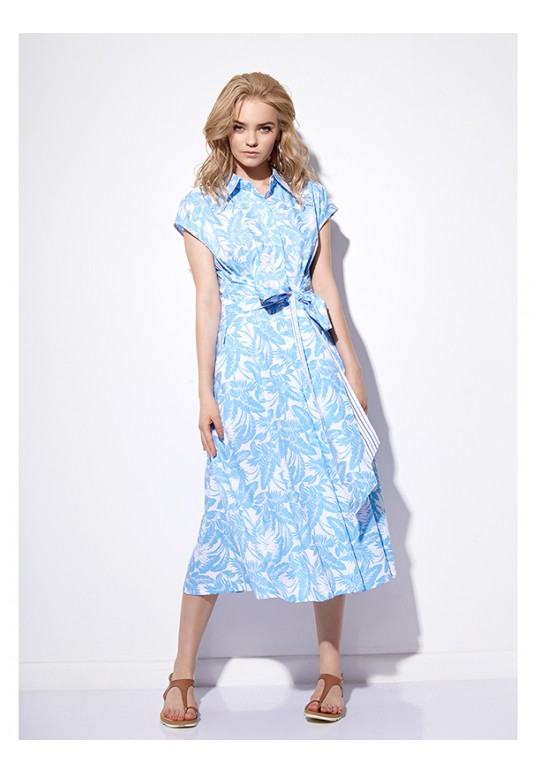 Платье миди отрезное по талии из текстильного полотна с воротником и спущенной проймой, боковыми карманами, поясом из той же ткани и потайной застежкой на пуговицы спереди.