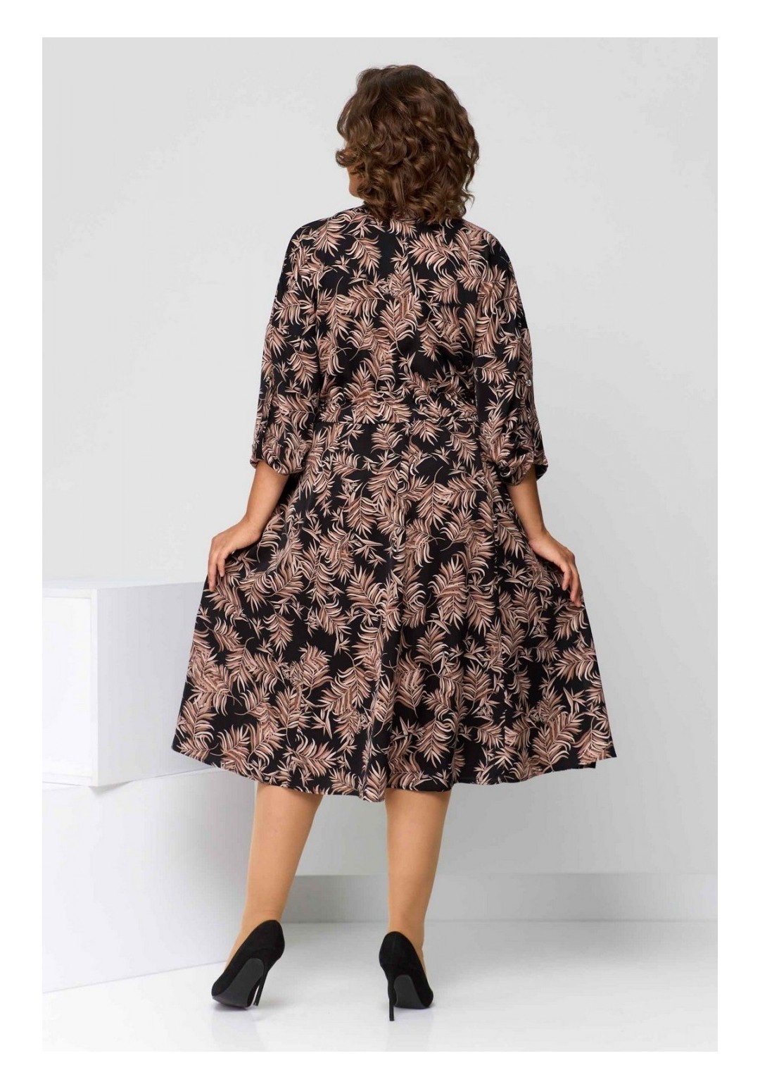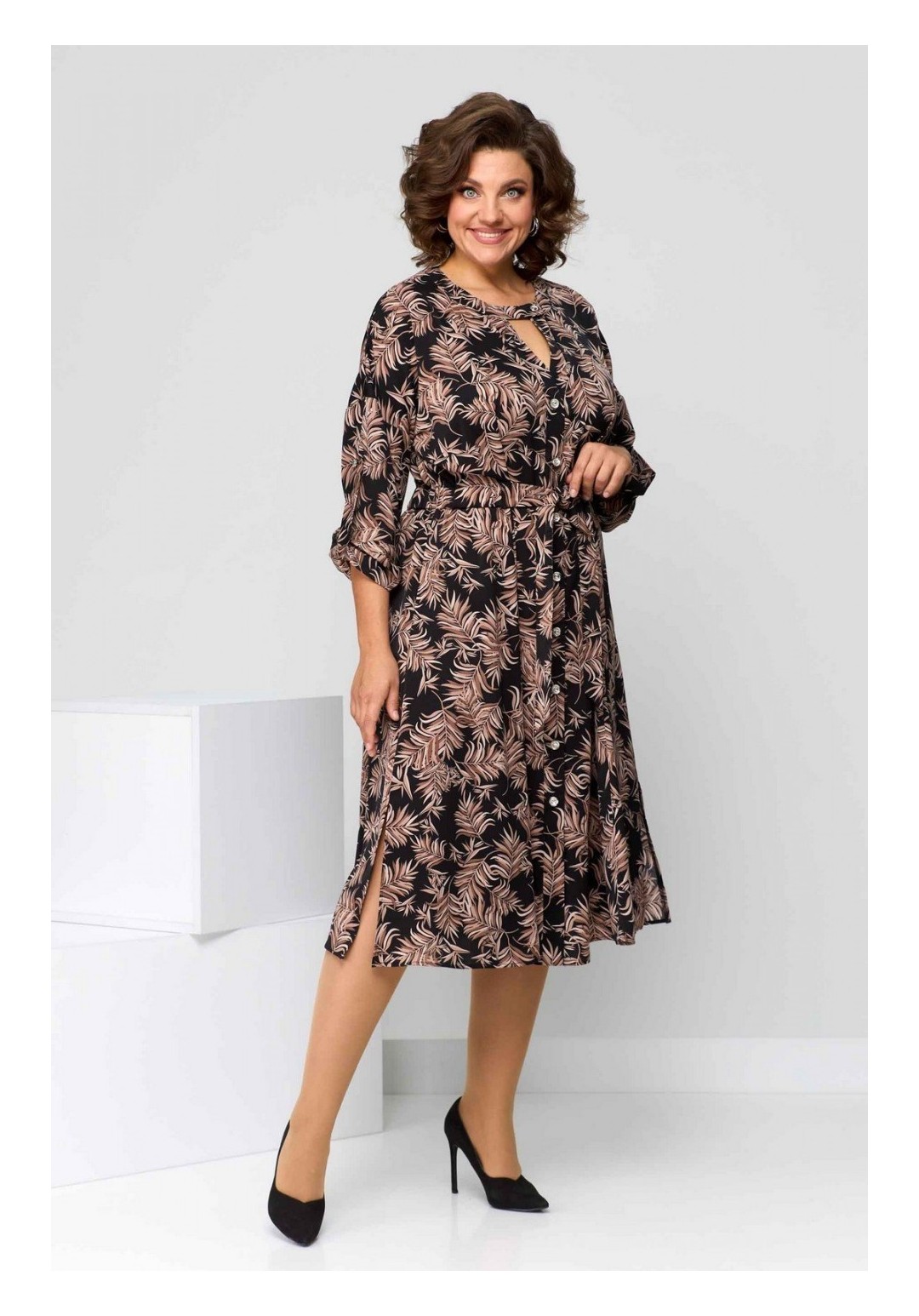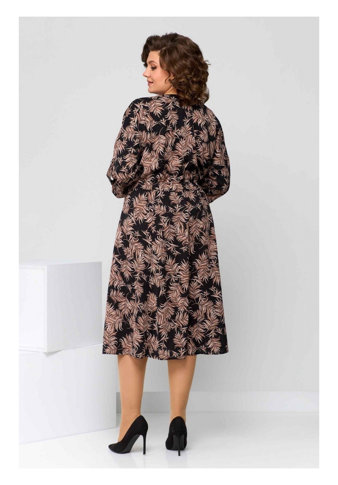 Платье женское полуприлегающего силуэта из плательной ткани. Горловина фигурная на планке. Застёжка центральная по переду. Платье отрезное по линии талии с кулиской и поясом на завязку. Юбка в клинья. Рукав покроя летучая мышь, с патой и на манжете. Спинка свободная. Длина изделия 110 (±2) см. Длина рукава 32 (±1) см.