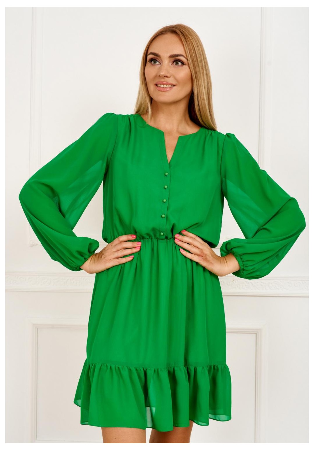 Платье женское из шифоновой ткани на чехле. Отрезное по линии талии с резинкой по поясу изделия. Рукав длинный, широкий со сборкой по окату и низу рукава, вырез горловины V -образный, застёжка спереди на планки с пуговицами. По низу изделия-волан.