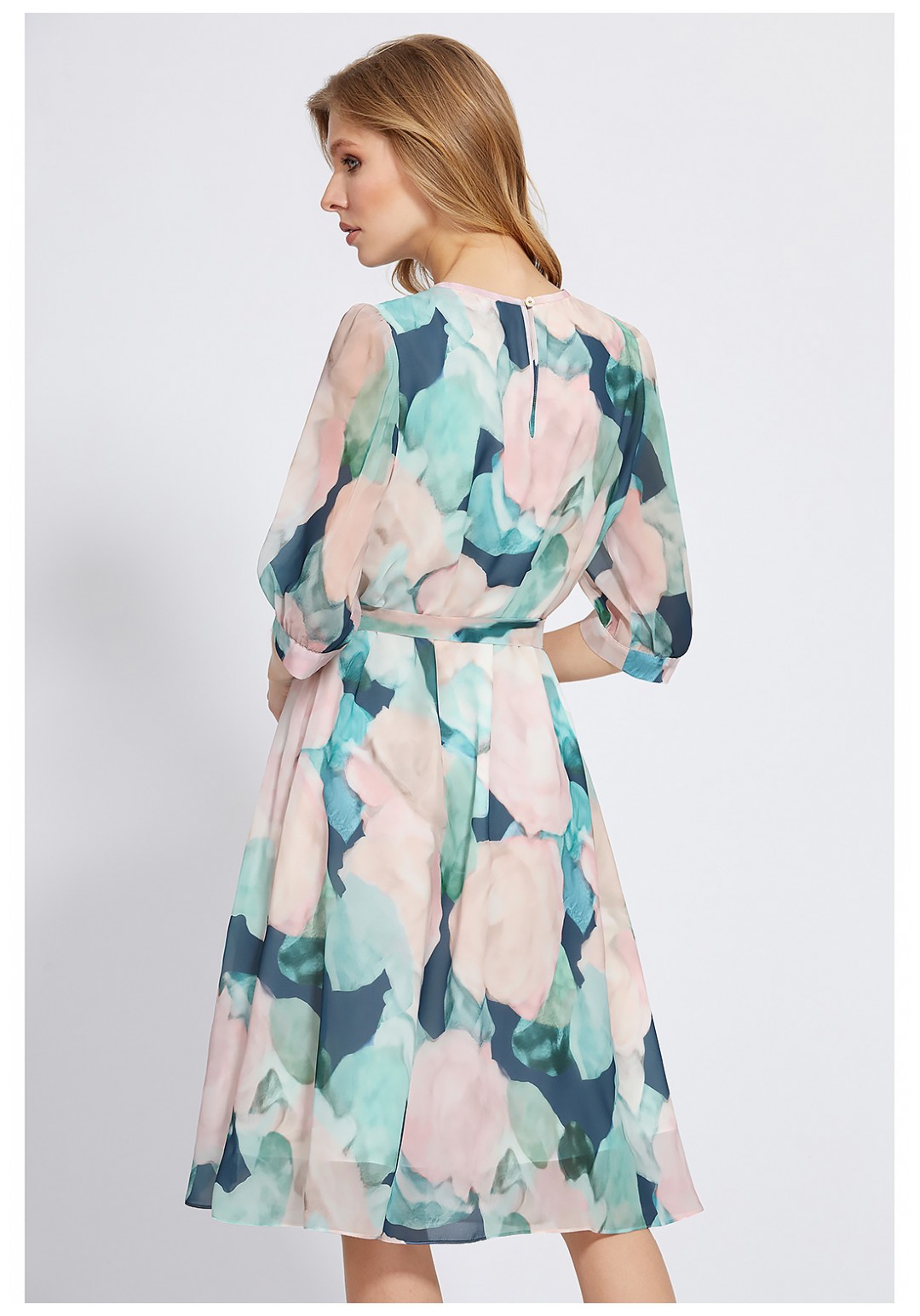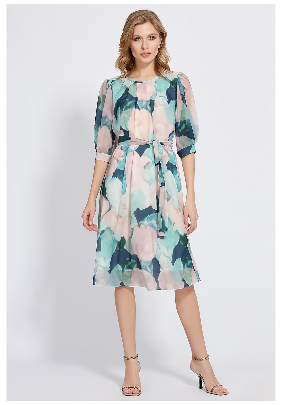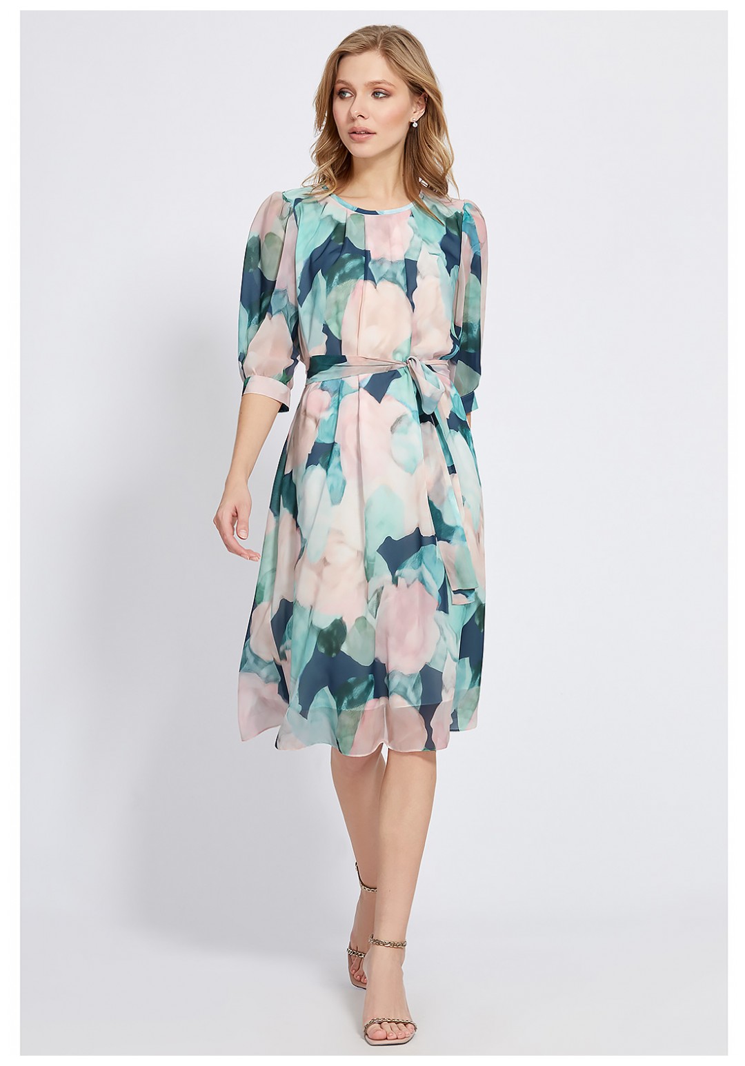 Чрезвычайно нежное платье А-образного силуэта, выполнено из красивого шифона с модным цветочным дизайном. Привлечь особое внимание к себе также помогает интересный крой со складками по горловине переда и интересное сочетание сборки и встречной складки по рукавам. Модель с округлой формой горловины и с втачными укороченными рукавами с притачными манжетами. Для удобства в эксплуатации, по спинке обработана каплевидная застёжка на навесную петлю и пуговицу, а также нижний слой платья выполнен из мягкой приятной 100% вискозной ткани. Завершает образ пояс-завязка из основной ткани.